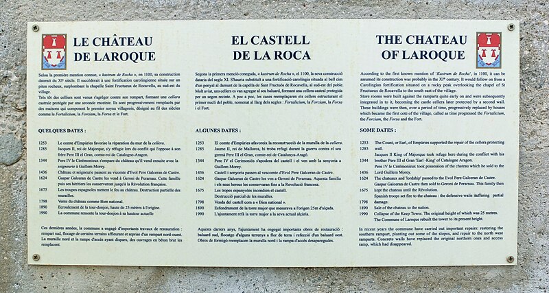 Le château de Laroque, mentionné pour la première fois en 1108 dans le cartulaire de Cahors puis en 1170 dans celui de l'abbaye d'Aniane, domine le village et contrôlait l'accès à la vallée de l'Hérault. Place forte des XIe‑XIIe siècles, il présente des vestiges et des bâtiments d'époques variées. L'escalier d'accès, les façades et les toitures du château médiéval ainsi que l'ancienne chapelle castrale sont inscrits aux monuments historiques par arrêté du 22 janvier 1979. À l'ouest se dressent deux tours semi‑circulaires partiellement ruinées. Au sud‑ouest, le corps principal semble avoir été édifié en deux campagnes, comme l'indique un ancien chaînage d'angle qui divise la façade sud‑ouest en deux parties ; des fenêtres géminées subsistent. Au nord se situent les vestiges d'un donjon carré. Par ailleurs, un donjon pentagonal, daté des Xe et XIIe siècles, s'élevait autrefois à près de 36 mètres avant d'être écrêté sur ordre de Richelieu après les Guerres de Rohan ; sa hauteur actuelle est de 27 mètres et sa partie supérieure a été remaniée en pierres à bossage. Son sommet abrite une cloche offerte en 1630 par Bertrand de Saussan, coseigneur de Laroque ; cette cloche est classée depuis le 18 novembre 1942 et a longtemps servi pour l'horloge. Le corps de logis adjacent est daté des XIIe‑XIIIe siècles. La chapelle castrale, d'origine romane au XIe siècle, a été agrandie au XIVe siècle sur la cour du château ; le côté sud de l'église est orné d'une série d'arcatures lombardes. Sa sacristie a été aménagée dans une ancienne échauguette militaire, visible à l'angle du mur du donjon et reconnaissable à ses mâchicoulis. La demeure seigneuriale, en léger retrait, est une importante bâtisse remaniée au XVIe siècle ; parmi ses arcades subsiste le blason de la famille de La Roque sculpté dans la pierre, et une cour proche abrite l'ancienne cuve baptismale de la chapelle. Plusieurs familles se sont partagées ou succédé dans la seigneurie : Béranger de Sauve et Guillaume Arnauld figurent parmi les principaux donateurs pour l'érection de la paroisse en 1155, de même que Raymond de La Roque, dont la présence et celle de sa famille suggèrent une implantation ancienne. La famille de La Roque a donné naissance à plusieurs branches — Couloubrines, Languedoc et Vivarais — dont la branche du Vivarais, établie au XVIIe siècle, est toujours représentée et a réuni par alliances plusieurs baronnies. Les Saussan, coseigneurs du XIIIe siècle jusqu'à la Révolution, ont notamment offert la cloche du donjon ; Bertrand de Saussan est enterré dans la chapelle Saint‑Jean. Isabeau de Saussan, mariée en 1655 à Hector de La Tour, transmit ses droits à sa fille Marie de La Tour, dame de La Roque et d'Arènes, qui est enterrée avec sa mère dans la chapelle Saint‑Jean. Par mariage, les Roquefeuil devinrent coseigneurs à partir du XVIIe siècle : Fulcrand de Roquefeuil épousa Marie de La Tour en 1674, et plusieurs générations de cette lignée sont également inhumées dans la chapelle Saint‑Jean, jusqu'au décès de François de Roquefeuil en 1764.