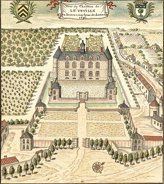Les premières mentions des seigneurs de Levéville, nommés Levoisvilla, Levaisvilla ou Levesvilla, remontent à la fin du XIe siècle dans les cartulaires du pays chartrain, et ces seigneurs furent vassaux des évêques de Chartres et soutiens des premiers comtes de Chartres. Michel Le Vacher, probablement à l'origine d'une reconstruction entre 1479 et 1506, fit édifier un nouvel ensemble ceint de douves avec un corps principal d'habitation, un pont-levis et un châtelet donnant accès à une haute cour entièrement close, flanquée à chaque angle d'une tour pourvue de bouches à feu adaptées aux mousquets et couleuvrines de l'époque. Une seconde enceinte, elle aussi munie de tourelles et de fossés, protégeait alors le château, sa cour et ses douves.