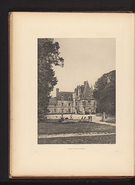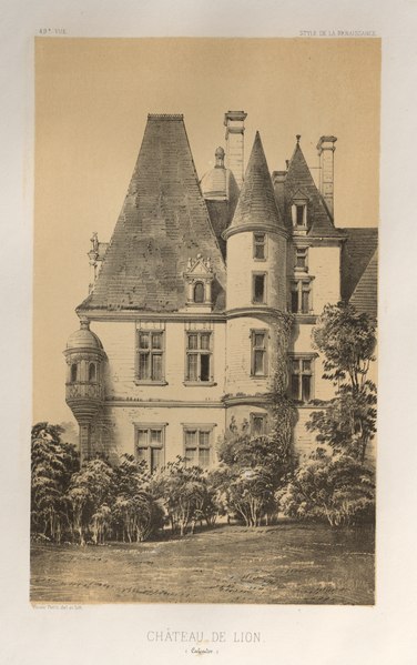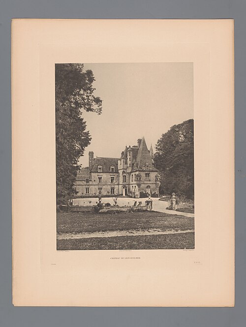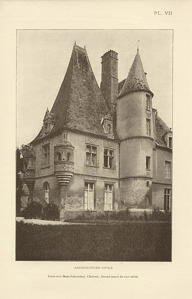 Le château de Lion-sur-Mer se compose d'un corps de logis des XVIIe et XVIIIe siècles et d'un pavillon en retour d'équerre vers le midi, construit vers 1540, auquel est accolée une tour d'angle de la même époque. La chapelle du XVIIIe siècle, proche du château, a été restaurée en 1863. Le plan du domaine de 1761 montre une basse-cour avec une charretterie-pressoir et un vaste parc ; le jardin à la française a disparu, mais le parc conserve des avenues plantées, un potager, une orangerie et une glacière. Depuis le XIXe siècle, le domaine clos est repérable depuis la route par un pavillon de garde de style historiciste. Le site abrite des caves du XVe siècle sous le logis actuel, qui a partiellement été bâti à la Renaissance ; selon certaines sources il appartient désormais à la famille de Monicault, tandis que d'autres indiquent qu'il était occupé au XXIe siècle par des descendants de la famille acquéreuse d'Auguste Massieu de Clerval en 1847. Le château est partiellement protégé au titre des monuments historiques.