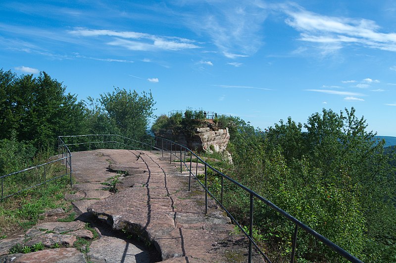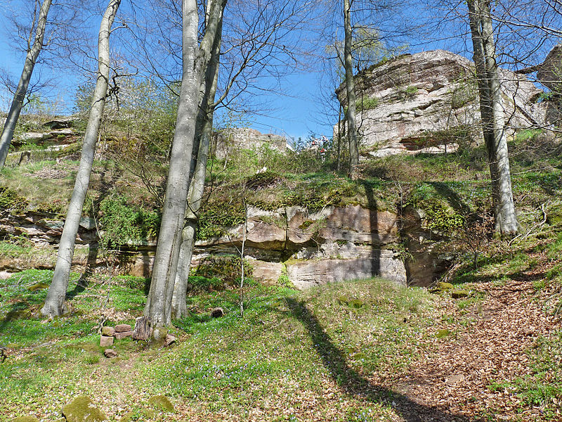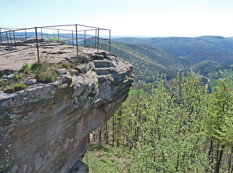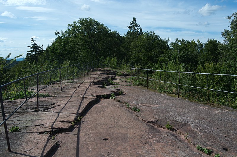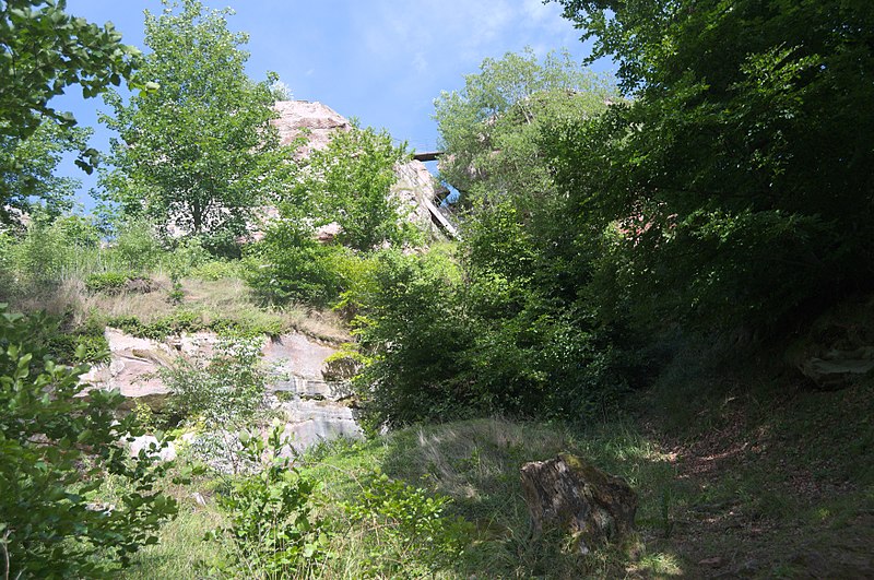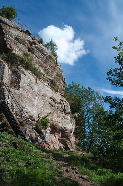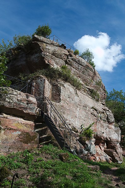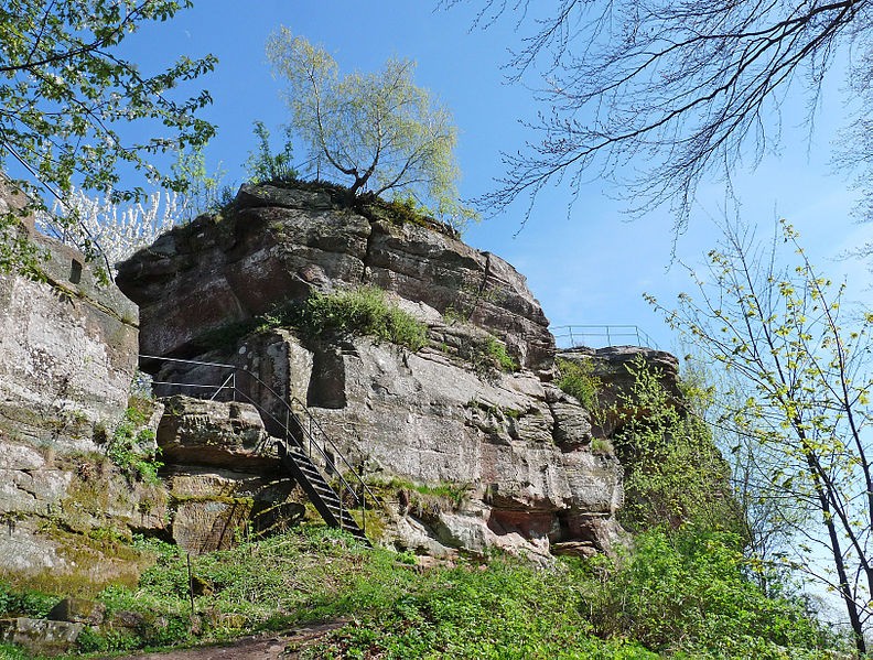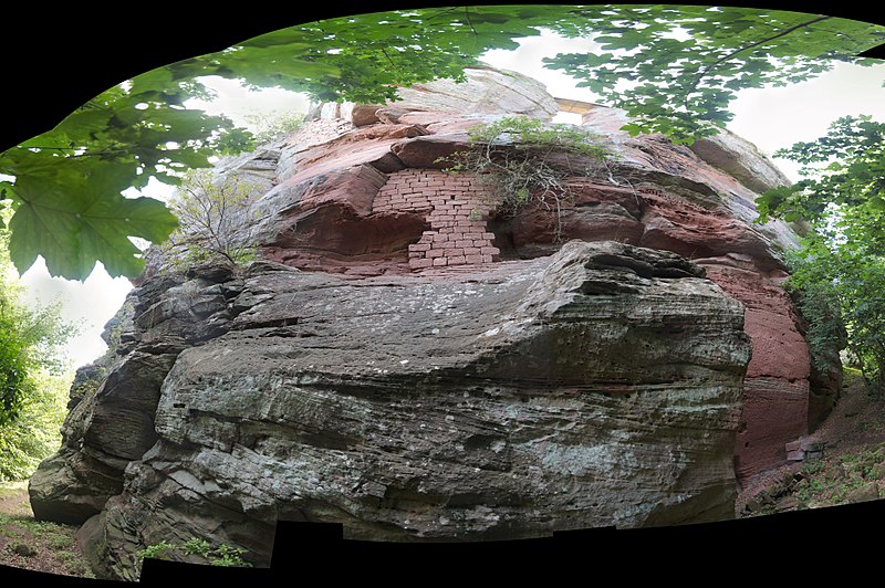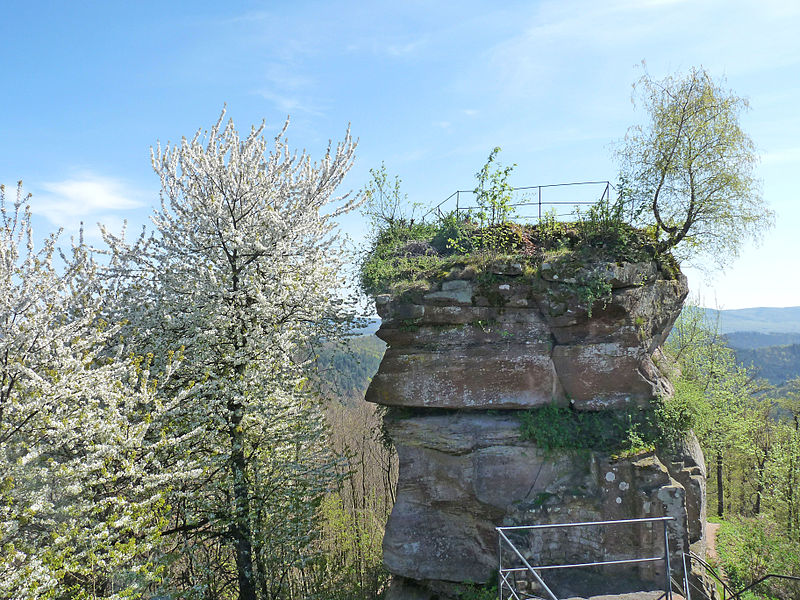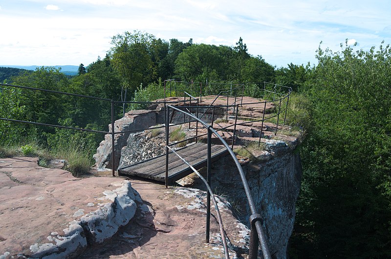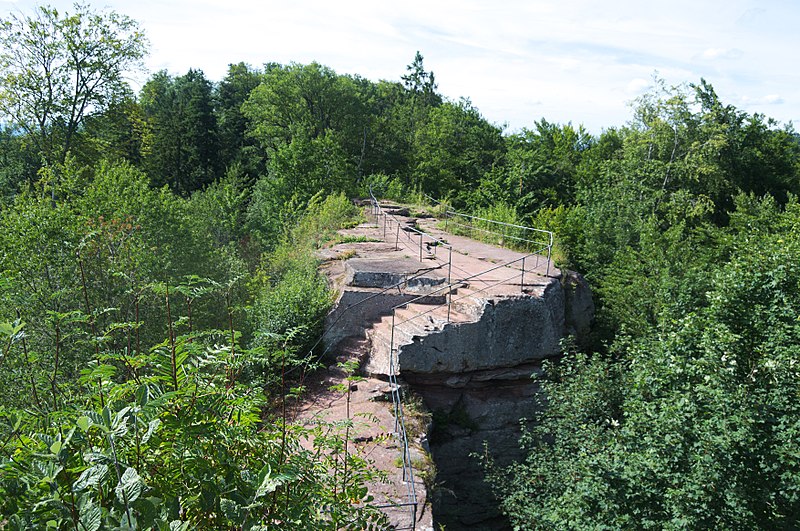 Le château de Lœwenstein, situé sur la commune de Wingen dans le Bas-Rhin, est classé au titre des monuments historiques depuis décembre 1898. Il se compose de deux parties mitoyennes qui, à un moment de son histoire, appartinrent à des seigneurs distincts ; aujourd’hui, seule une citerne subsiste clairement. Élevé au XIIIe siècle par les ministériaux de la famille de Loewenstein, apparentée aux Fleckenstein, il est mentionné pour la première fois à la fin du XIIIe siècle et fut lié aux Habsbourg avant d’être inféodé à un membre de la maison d’Ochsenstein. Vers 1370-1375, Ottemann IV d’Ochsenstein céda la partie sud en arrière-fief à Hans Streuff de Landenberg, ce qui provoqua probablement des remaniements, parmi lesquels une tourelle d’escalier appuyée sur la paroi sud. En 1383, Ottemann engagea la partie nord à Hans de Bitche. À la fin des années 1380 (1386-1387), le château fut investi et détruit par la ville de Strasbourg et Jean de Lichtenberg, après être devenu le refuge de chevaliers brigands ; il ne fut vraisemblablement pas reconstruit. Les Ochsenstein gardèrent la jouissance des ruines jusqu’à leur extinction puis les biens passèrent, au fil des successions, à Puller de Hohenburg (1482), aux comtes de Deux-Ponts-Bitche (1485), aux comtes de Hanau-Lichtenberg (1570) puis au landgraviat de Hesse-Darmstadt (1736), qui en restèrent propriétaires jusqu’à la Révolution. Les vestiges subirent d’autres dégradations, notamment des dommages infligés par les troupes françaises du général Monclar en 1676-1677. Le site est également connu sous l’appellation Lindenschmidt, attestée sur des cartes allemandes du XIXe siècle ; ce toponyme, issu apparemment de Linkenschmidt, renvoie à une légende locale selon laquelle un chef de pillards ferrerait ses chevaux à l’envers pour brouiller les pistes. La tradition raconte qu’il fut capturé avec son fils et son valet, jugé à Schönau et pendu avec eux, illustrant la maxime populaire « mitgegangen, mitgefangen, mitgehangen ». Pour accéder au site depuis Lembach, prendre la route de Bitche puis la route forestière jusqu’au Gimbelhof, puis suivre le sentier du Club Vosgien balisé de pastilles blanches cerclées de rouge jusqu’au parking du Hohenbourg ; le reste du parcours est fléché.