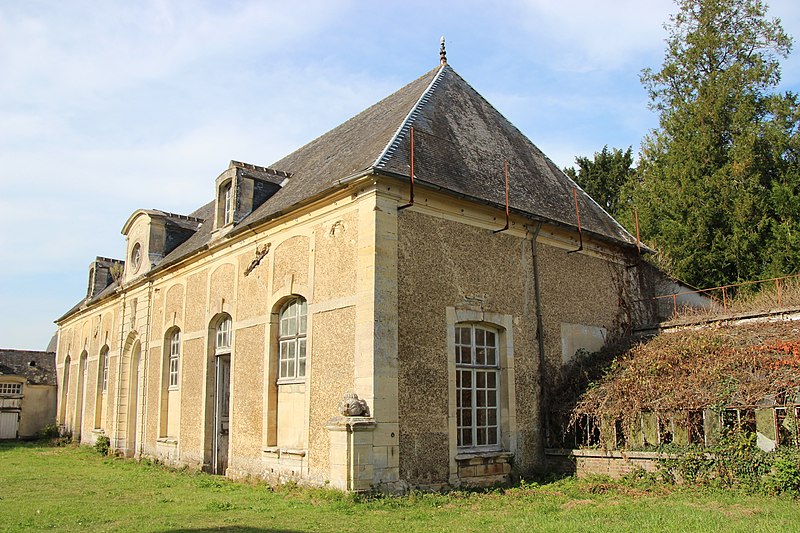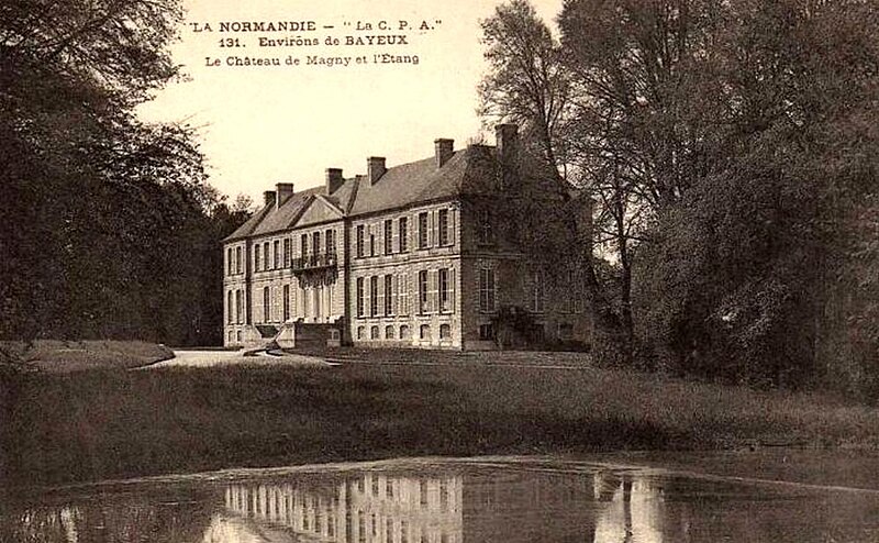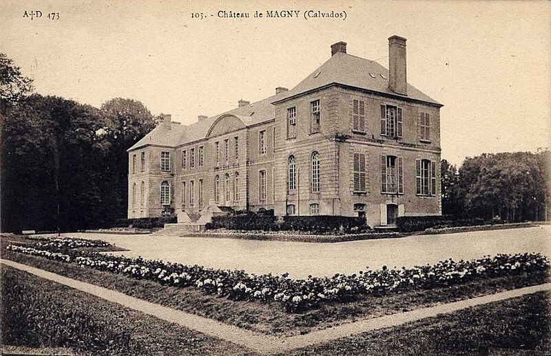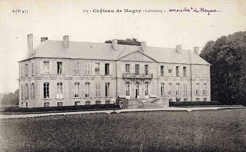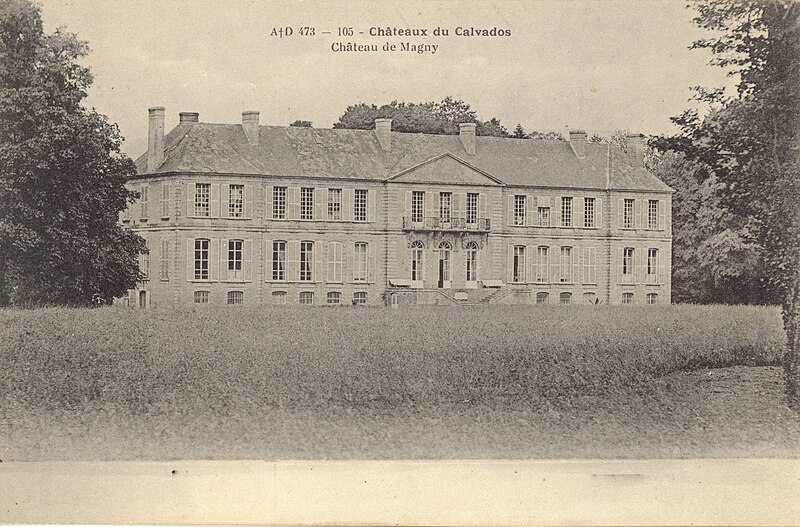 Le château de Magny-en-Bessin et son parc occupent une place importante dans le paysage communal et la mémoire locale. Le site a livré des vestiges préhistoriques, des artefacts romains et une nécropole mérovingienne, sans qu'il ait fait l'objet de fouilles scientifiques complètes. Un fief fortifié est mentionné dès le Moyen Âge ; la seigneurie passe ensuite entre plusieurs familles, dont Mailloc, Mannoury et Saint-Ouen, avant d’être acquise au XVIIe siècle par des membres de l'entourage de l'intendance de Caen. Nicolas-Joseph Foucault et sa famille étendent alors largement le domaine et obtiennent l'érection du fief en marquisat à la fin du XVIIe siècle. Le logis actuel s'appuie sur des élévations antérieures dont subsistent des réemplois de murs et d'éléments médiévaux ; la charpente du pavillon de l'horloge porte une inscription de 1715, tandis que d'autres sources indiquent une achèvement du gros œuvre et des toitures vers 1730-1736, la datation précise restant discutée. Le château a reçu des décors intérieurs commandés par des propriétaires successifs, notamment après la vente au marquis de La Rivière en 1773, mais beaucoup d'ornements ont depuis disparu ou ont été remaniés. Au XIXe siècle la famille de Bonvouloir fait transformer les abords : la cour d'honneur et le jardin à la française sont modifiés, et un parc paysager en étoile d'environ dix hectares est aménagé. Le domaine connaît alors une vie seigneuriale active, avec une importante domesticité et des activités de chasse et de réception. Pendant la Seconde Guerre mondiale le château est réquisitionné par les forces d'occupation, abrite une Kommandantur et des troupes, conserve des graffiti de l'époque, puis est libéré le 6 juin 1944 ; il sert aussi de dépôt et voit l'installation d'un aérodrome à proximité. Après-guerre, des opérations de pillage et la vente du domaine entraînent la disparition de nombreux décors, boiseries et arbres remarquables. L'édifice est inscrit à l'inventaire supplémentaire des monuments historiques par arrêté du 31 mai 1946, mais la protection n'empêche pas sa mutation industrielle : une société linière transforme le château en usine de teillage, adapte les rez-de-chaussée pour accueillir des machines lourdes et fait disparaître la chapelle. L'activité industrielle cessera par la suite et le domaine connait des périodes d'abandon, de ventes et d'occupation par des propriétaires privés, dont un artiste et sa compagne qui envisagent un projet culturel à la fin du XXe siècle. Le château subit deux incendies importants en mars 2016 qui détruisent une aile, une grande partie des toitures et des planchers, laissant cependant le sous-sol préservé. Depuis 2018 une association de sauvegarde s'est constituée et le site a été retenu à plusieurs reprises par la Mission Stéphane Bern pour le loto du patrimoine, ce qui a permis d'obtenir des subventions et de lancer des travaux d'urgence et de consolidation à partir de 2020. Des études et dossiers de permis ont été déposés pour des travaux visant à rendre le bâtiment hors d'eau et hors d'air, mais la situation demeure fragile et le calendrier des interventions reste incertain au printemps 2025. Le château est construit en pierre de taille, calcaire, moellon et enduit ; subsistent quelques décors rocaille et des éléments de ferronnerie, tandis que la majeure partie des aménagements intérieurs et du mobilier a disparu. Le parc conserve des traces de ses dispositions anciennes — allées, plans d'eau, verger et parc en étoile — ainsi que des dépendances et des écuries, mais l'ensemble a été profondément transformé par les remaniements d'usage et les pertes subies au XXe siècle. Les enjeux actuels portent sur la stabilisation des ruines, la protection des vestiges conservés et la définition d'un projet de valorisation compatible avec le statut de monument historique.