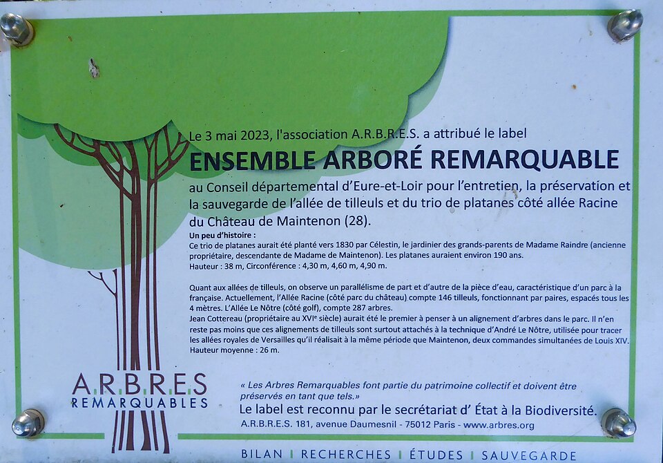 La perspective et le jardin ont été dessinés par Le Nôtre ; jusqu'en 2013 le jardin se réduisait à un parterre centré sur le monogramme de Louis XIV, puis, à l'occasion des 400 ans de la naissance d'André Le Nôtre, le conseil départemental d'Eure-et-Loir a rétabli un jardin à la française conforme aux plans de Le Nôtre. Deux allées bordant la rivière transformée en canal, nommées « Racine » à l'ouest et « Le Nôtre » à l'est, ont reçu en 2023 le label « ensemble arboré remarquable » : l'allée Racine compte 146 tilleuls disposés en deux alignements espacés de quatre mètres, l'allée Le Nôtre en compte 287 et la hauteur moyenne de ces tilleuls est d'environ 26 mètres. Le trio de platanes à l'entrée du parc, planté aux environs de 1830, est également labellisé et présente une hauteur d'environ 38 mètres avec des circonférences respectives d'environ 4,30 m, 4,60 m et 4,90 m.