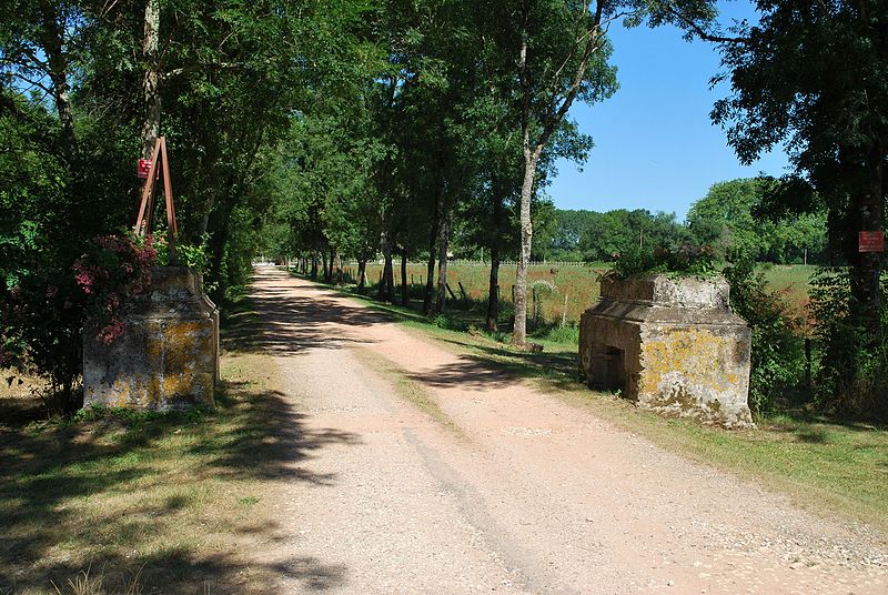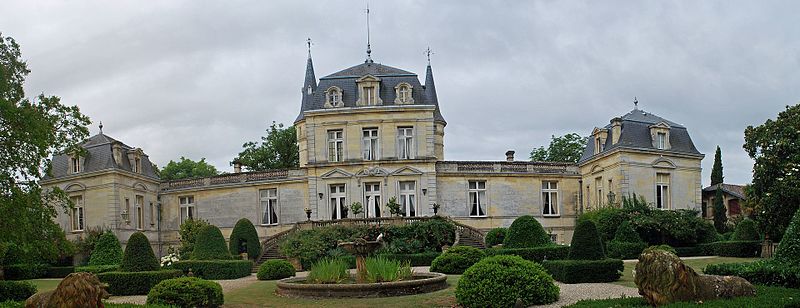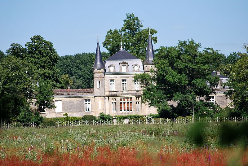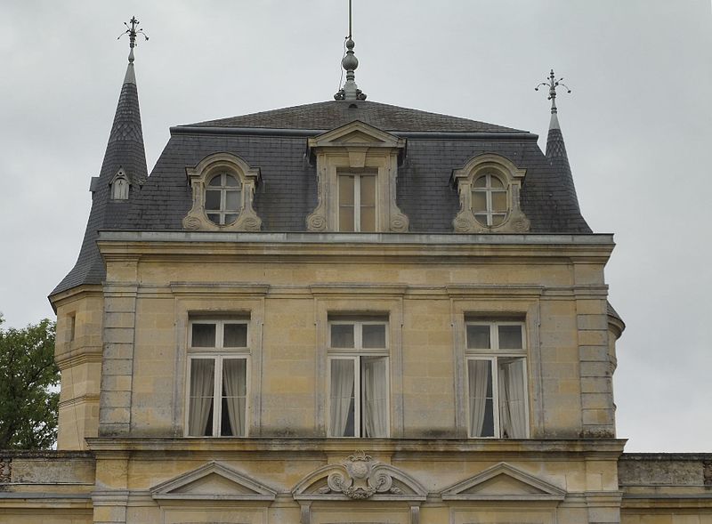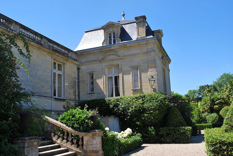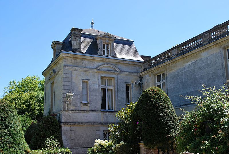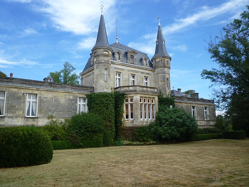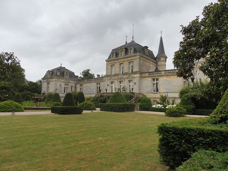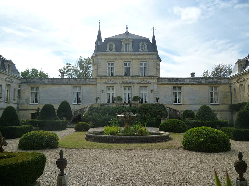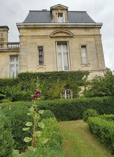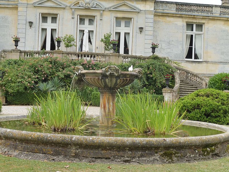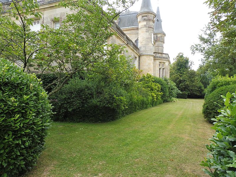 Les abords conservent divers bâtiments de brique et de pierre et des vestiges d’aménagement liés à l’exploitation viticole : un chai et un cuvier encadrant une dépendance ronde, des étables et un garage pour carrosse coiffés d’une horloge signée Guignan et surmontée d’une cloche, ainsi qu’une grande serre métallique de la fin du XIXe siècle, conçue pour une exposition universelle. Le parc comporte un jardin à la française devant la façade est, avec un bassin et une vasque en marbre à têtes de lions, un potager‑verger au sud‑est planté en carrés de buis et, au nord‑ouest, une série d’espaces clos thématiques et de bassins conçus pour la promenade. Deux lions en terre cuite, provenant du portail originel, furent volés puis retrouvés et sont aujourd’hui placés entre le château et la Garonne pour leur protection.