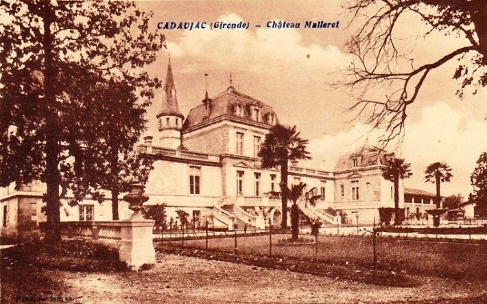 Un édifice plus ancien existait sur le site du château de Malleret, situé sur la rive gauche de la Garonne à Cadaujac, accessible par une longue allée privée depuis la route départementale D111 (rue du port de Grima). Le lieu-dit, connu au XVIIIe siècle sous le nom de Maleret et figurant sur la carte de Cassini, avait été acheté le 24 septembre 1700 par Guillaume Malleret ; une demeure y est également visible sur la carte d’État-major du début du XIXe siècle. Les parties conservées du bâtiment primitif présentent un style du milieu du XVIIIe siècle et les vignobles produisaient alors 40 à 50 tonneaux de vin. De 1860 à 1869, le château actuel a été élevé et le parc aménagé ; la source mentionne Armand Coureau comme constructeur, tandis que d’autres documents indiquent que Lucien Arman (dit Arman‑Courau), devenu propriétaire en 1839 par son mariage avec Laure Caillavet, fit agrandir le bâtiment et tracer le parc. Lucien Arman, lié d’amitié avec Napoléon III, reçut plusieurs séjours impériaux au château, accessibles par un embarcadère privé ; la rumeur locale fait remonter l’origine de cette amitié à la période où Louis‑Napoléon Bonaparte était emprisonné au château de Ham. Ruiné par la faillite des chantiers Arman et Courau en 1868, Lucien Arman mit le domaine en vente en 1869. En 1933, M. Berthias acquit le château, fit poser des grilles en fer forgé provenant de la place Gambetta à Bordeaux et y forma une ferme laitière commercialisant « Le lait vivant ». Après des périodes de négligence, les propriétaires actuels, qui occupent le lieu depuis 1986, ont restauré le château, ses annexes et ses jardins, et le site est inscrit au titre des monuments historiques depuis 1989.