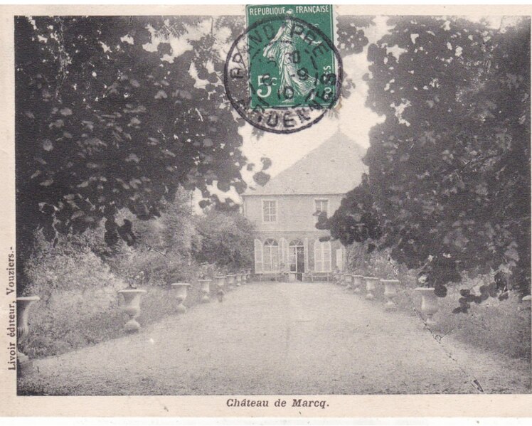 Le château de Marcq, dit château Mercier, se situe à Marcq (Ardennes), à proximité de la place du village, du Monument aux Morts et de la mairie. Construit par le maître de forge Nicolas Dérué (1718-1777), le portail porte la date 1760, qui correspond vraisemblablement à la période de construction. L'ensemble présente l'allure d'une grosse maison bourgeoise du XVIIIe siècle plutôt que d'un château fort. Le corps de logis, peu modifié depuis sa construction, compte sept travées et des ouvertures encadrées de pierre, soulignées par des bandeaux et un cordon séparant les niveaux. Les chaînes d'angle et les entourages de fenêtres en pierre se détachent sur un fond de briques rouges. Le toit, élevé avec comble en pavillon, évoque l'architecture du XVIIe siècle, tandis que la façade sur jardin s'apparente au style des grandes maisons du XVIIIe siècle. La cour d'entrée, partiellement fermée par un autre bâtiment, était autrefois dotée d'une aile sud attestée par le cadastre ancien, détruite après la Première Guerre mondiale et remplacée par un muret. À l'ouest, l'aile d'entrée de la cour a été presque entièrement reconstruite à la même époque, à l'exception du passage central — qui donne vers l'arrière de la mairie — comprenant une porte charretière et une porte piétonne où figure la date 1760. La propriété a appartenu à la famille Dérué puis a été transmise, de fille en fille, aux familles Guérin, Brizard, Delbeck (parmi lesquelles Victor Albert Delbeck fut maire de Marcq), Mercier, Docquin et enfin Breton. Il s'agissait majoritairement de propriétaires terriens et d'agriculteurs locaux, à l'exception des Docquin, brasseurs à Sedan; les propriétaires actuels n'ont plus de lien avec ces familles. Pendant les deux conflits mondiaux, la propriété a été utilisée par les Allemands comme camp de prisonniers et un mirador y fut construit en 1941. Après la Seconde Guerre mondiale, le domaine fut couramment appelé château Mercier. Des travaux de restauration, conduits de 2009 à mai 2011 avec l'appui technique de l'architecte des bâtiments de France, ont permis de restaurer les maçonneries et les ouvertures des façades principales, de restituer les perrons et escaliers en pierre de Jeaumont blanc et de remplacer les portes en chêne. L'édifice est inscrit au titre des monuments historiques en 2002.