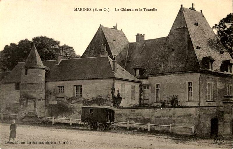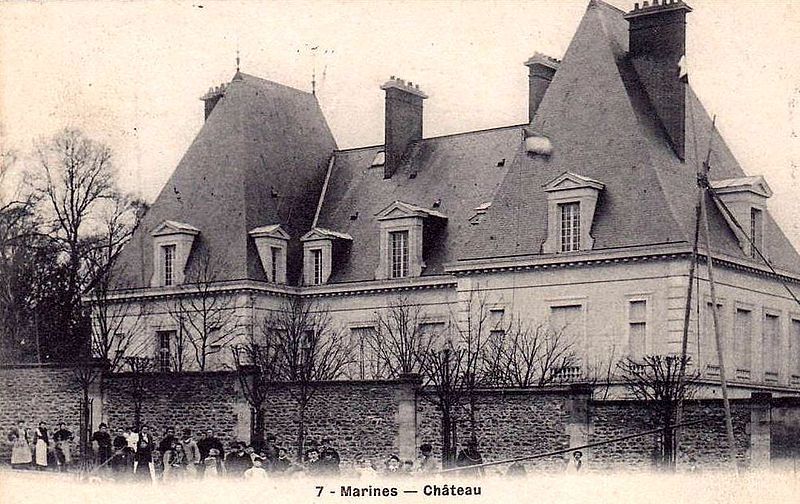Le château de Marines est un édifice situé place Peyron, à Marines (Val-d'Oise), au carrefour de la rue Jean-Jaurès (RD 28), de la rue de la Libération et du boulevard de la République. Il date de la Renaissance et résulte de la construction par Adrien Thiercelin de Brosse, qui reçut en 1521 la Haute Justice et le tabellionage de Marines de la part de François Ier. Thiercelin de Brosse fit édifier la résidence qui constitue l'actuel château ; il participa ensuite à l'achèvement du château de Blois et à l'agrandissement du palais du Luxembourg à la demande de Marie de Médicis, puis devint chancelier d'Henri IV. Aux alentours des années 1530, Jean Calvin trouva refuge dans les bois proches d'Arthies, près de Marines, et y écrivit une partie de son œuvre. Pendant les guerres de Religion, Henri IV fit une halte au château la nuit du 11 août 1589 et y rédigea une lettre, conservée à la Bibliothèque nationale, évoquant les habitants du Vexin. Après l'abjuration d'Henri IV, la famille de Brosse fut ruinée et vendit le domaine en 1603 à Nicolas Brûlart de Sillery. Sillery, devenu chancelier d'Henri IV en 1606, fit construire un important couvent pour les Oratoriens près de l'église de Marines, où Nicolas Malebranche écrivit Les Conversations chrétiennes ; la famille de Sillery conserva le domaine jusqu'en 1659. L'Oratoire resta attaché au domaine jusqu'en 1901, date à laquelle la famille Batardy-Joly le donna à l'évêché de Versailles, dernière donation avant la séparation des Églises et de l'État en 1905. Le 24 janvier 1659, Louis Brûlart de Sillery et son épouse cédèrent la seigneurie de Marines au marquis de Créquy pour 660 000 livres tournois ; celui-ci fit aménager le parc à la française par André Le Nôtre et fit édifier une chapelle mortuaire par l'architecte Jacques Lemercier. Compromis dans l'affaire Fouquet, le marquis connut un exil temporaire à Marines avant de reprendre sa carrière militaire ; il mourut dans son château et son fils unique périt au combat en 1702. La propriété passa ensuite à Thomas Rivié au XVIIIe siècle ; la famille de Gouy d'Arsy, par alliance, conserva le domaine jusqu'en 1889, date de son acquisition par Madame Paul Batardy. À la mort de Madame Batardy en 1942, le domaine revint aux petits-enfants, M. André Joly et son épouse ; il appartient encore aujourd'hui à leurs descendants. Paul Cézanne séjourna à Marines en 1888 et 1890 et peignit une vue intitulée « Le Château de Marines ». Les plafonds peints de trois pièces du premier étage sont inscrits au titre des monuments historiques par arrêté du 9 novembre 1984, et le parc est classé au titre des sites par arrêté du 25 février 1974. Le bâtiment principal a peu changé ; une petite tourelle donnant sur la place Peyron, qui servait de chambre de justice où le seigneur exerçait son droit de « bâton et de sang », a disparu, et les mansardes ont été remplacées par des fenêtres. Parmi les ressources et références figurent la base Mérimée ainsi que les portails consacrés au Val-d'Oise, aux châteaux de France et aux monuments historiques ; une médiathèque rassemble également des documents sur le château de Marines. L'article original signale toutefois un manque de sources.