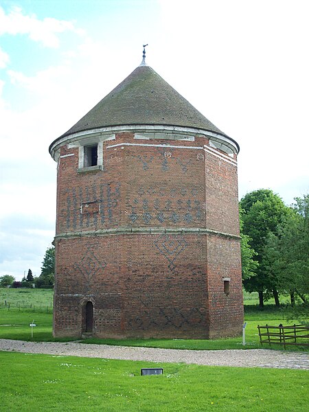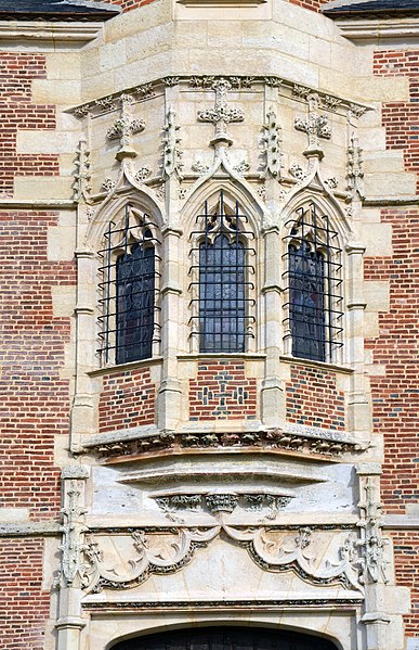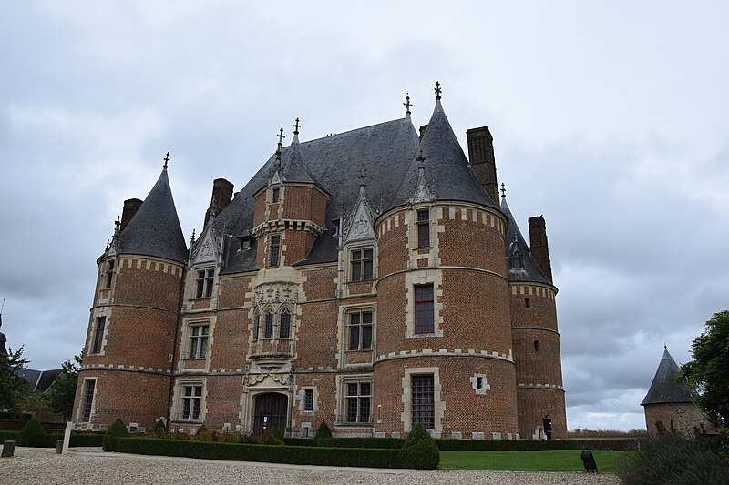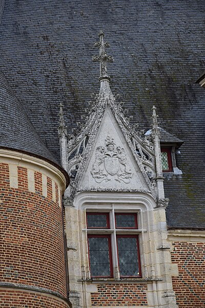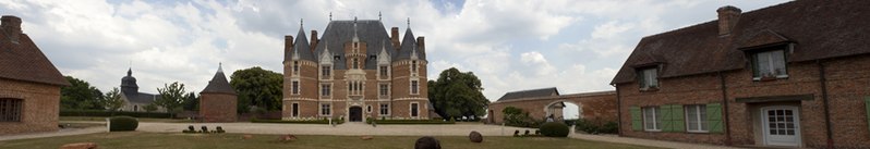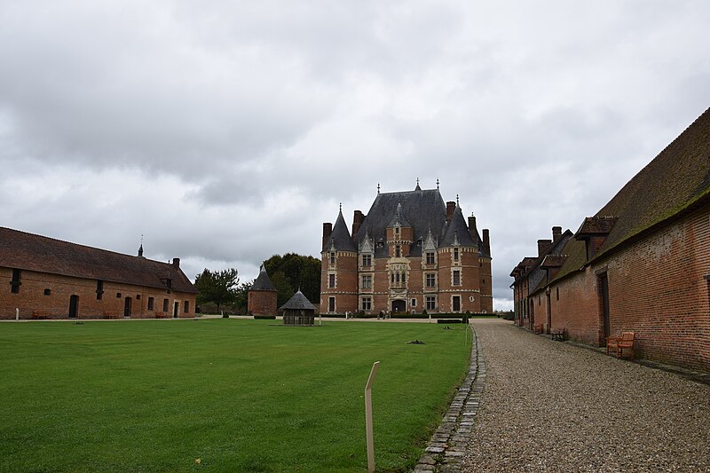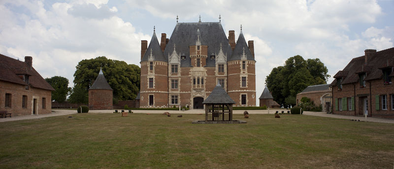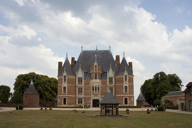 L'organisation du domaine conserve l'entrée nord donnant sur une basse-cour orientée est-ouest où subsistent des dépendances adossées aux murs de clôture, telles que la maison du métayer, les écuries, les granges, le pressoir et les bergeries, et le colombier placé à l'extrémité occidentale de l'enclos. À l'est, une seconde cour à peu près carrée, close de hauts murs crénelés et cantonnée de quatre tourelles (environ 42 × 40 m), contenait le château au centre et commandait vers l'extérieur un vaste jardin d'agrément. Le logis, de plan rectangulaire et couvert d'un toit en pavillon, est construit en briques cuites et en pierres blanches de Vernon, avec un appareillage orné de briques vernissées noires disposées en motifs ; des consoles au sommet des tours, aujourd'hui disparues, subsistent partiellement sous forme de pierres sciées évoquant d'anciennes mâchicoulis.