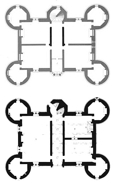La grande originalité de Martainville réside dans son plan symétrique centré sur un large couloir traversant et un escalier logé dans une tour hors-œuvre en façade arrière, système de circulation qui sépare clairement les salles et offices du rez-de-chaussée des chambres aux étages et rend chaque pièce indépendante. Ce plan novateur a inspiré d'autres demeures, dont Chenonceau, et plusieurs édifices normands du XVIe siècle se sont plus ou moins appropriés ce modèle, apprécié pour l'accueil de nombreux convives, la création de chambres indépendantes et l'accès direct aux jardins. Peu après la construction, la travée centrale de la façade principale fut entièrement remaniée pour monumentaliser l'entrée : l'ouverture primitive fut remplacée par un grand portail à deux vantaux équipé d'un pont basculant, tandis que l'étage reçut le chevet d'une chapelle et une tourelle d'escalier, renvoyant aux références des châteaux forts et à des exemples comme Mehun-sur-Yèvre ou le palais Jacques-Cœur à Bourges.