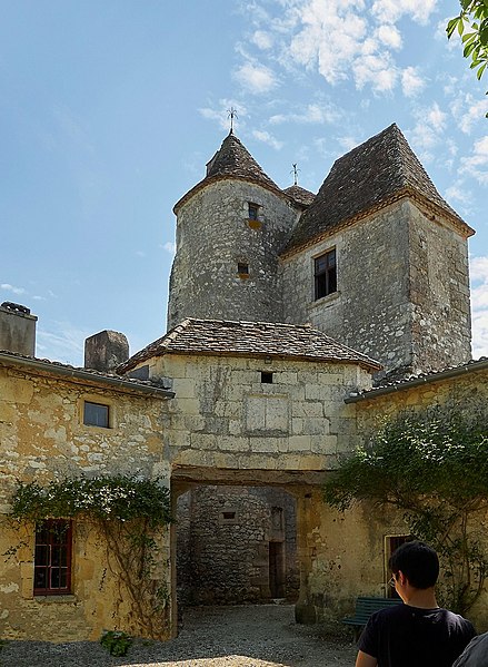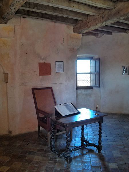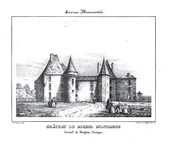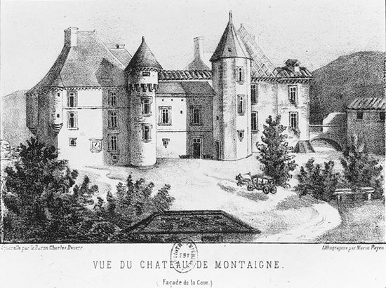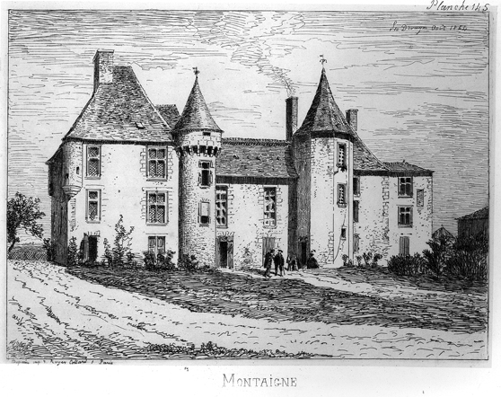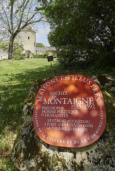 Le château de Montaigne se trouve à Saint-Michel-de-Montaigne, en Dordogne, à la frontière du Périgord et du Bordelais, près de Bergerac et de Saint-Émilion. Il s'agit d'une maison forte du XIVe siècle qui fut la demeure familiale du philosophe Michel de Montaigne. Le bâtiment a été remanié et partiellement reconstruit au XIXe siècle après un incendie ; il présente aujourd'hui un style néo‑Renaissance. Propriété privée, le château se visite et la tour de la Librairie, épargnée par le feu, attire particulièrement les visiteurs. La tour de la Librairie est le seul vestige de l'ancien édifice : elle comprend une grosse tour ronde, une petite tour ronde abritant un escalier à vis et un petit corps de logis carré. Au rez-de-chaussée se trouve la chapelle où Montaigne baptisa ses enfants ; au premier étage est la chambre du philosophe, dotée d'une petite trappe donnant sur un escalier dérobé permettant d'entendre la messe sans sortir de la pièce. Dans la tour carrée attenante se trouve le cabinet qui conserve encore des traces de peinture, et à l'étage la pièce de la librairie a gardé les 56 devises peintes sur des poutres de chêne. Certains des écrits sur ces poutres ont été restaurés dans les années 1940, d'autres sont d'origine et plusieurs inscriptions ont été apposées par le secrétaire de Montaigne ; les maximes forment un parcours de lecture en « S ». Le domaine, installé au cœur d'un parc dont les tracés furent dessinés par Montaigne, avait été acquis en 1477 par Ramon Eyquem, arrière‑grand‑père du philosophe. Le père de Michel, Pierre Eyquem, y vint s'installer avec sa famille et Montaigne y passa une enfance studieuse : il parlait couramment le latin dès l'âge de sept ans avant d'aller étudier au collège de Guyenne à Bordeaux. En 1554, Pierre Eyquem informa son suzerain qu'il avait commencé à rendre le lieu « fort et assuré » et avait l'intention de le fortifier. Montaigne y reçut en 1584 le roi de Navarre Henri de Bourbon, futur Henri IV, ainsi que d'autres grands personnages ; Henri IV l'avait déjà nommé Gentilhomme de sa Chambre en 1577. C'est dans cette demeure, et plus particulièrement dans la tour qu'il appelait sa « librairie », que Michel de Montaigne rédigea ses Essais de 1571 jusqu'à sa mort. Il utilisait la librairie comme principal lieu de travail, y rangeant ses livres et y trouvant la tranquillité propice à l'écriture. Michel de Montaigne mourut dans une chambre du château le 13 septembre 1592. Après sa mort, sa veuve Françoise de La Chassaigne continua à résider au château et y reçut Marie de Gournay, qui y séjourna quinze mois et fut chargée de la publication des Essais. Au XIXe siècle, Pierre Magne acheta le château en 1860 et s'y retira ; il y mourut en 1879. Un incendie de janvier 1885 détruisit le château ; la reconstruction donna lieu à un édifice néo‑Renaissance, mais seule la tour de la Librairie subsista de l'ancienne demeure. La tour de la Librairie a été classée monument historique par arrêté du 28 mars 1952, et la protection a été étendue à l'ensemble du château par un arrêté du 29 octobre 2009. Depuis 2002, le château fait l'objet d'une étude pour sa reconstitution numérique et la visite virtuelle de la bibliothèque de la tour a été mise en ligne en 2015 grâce au laboratoire Archéovision de l'université Bordeaux‑Montaigne.