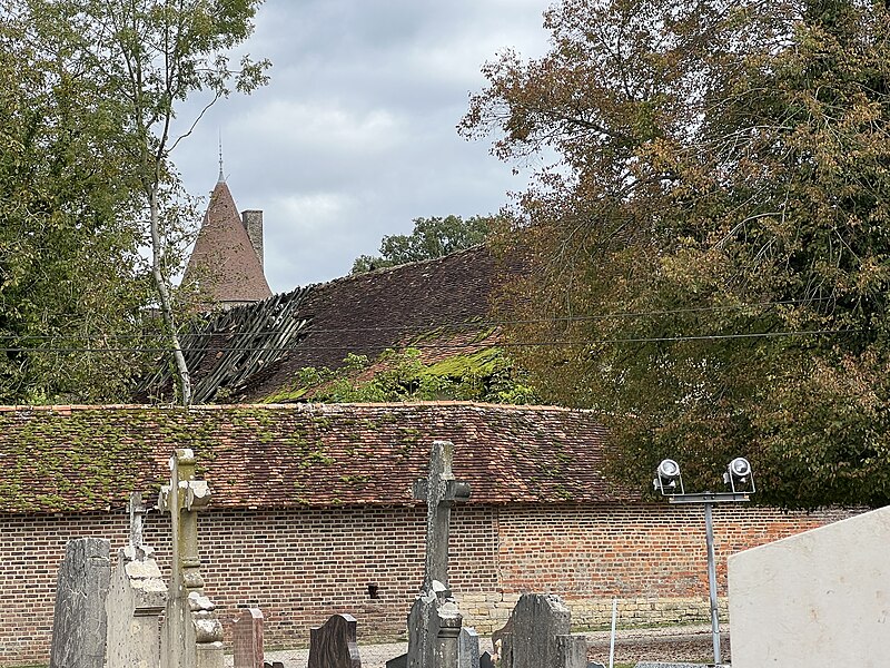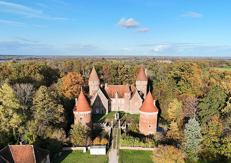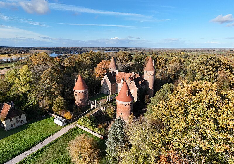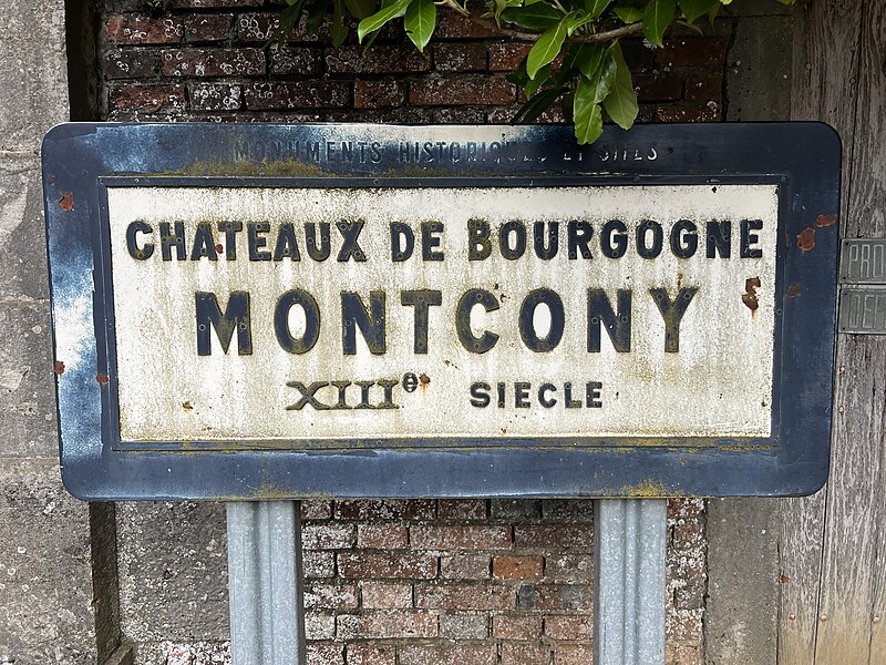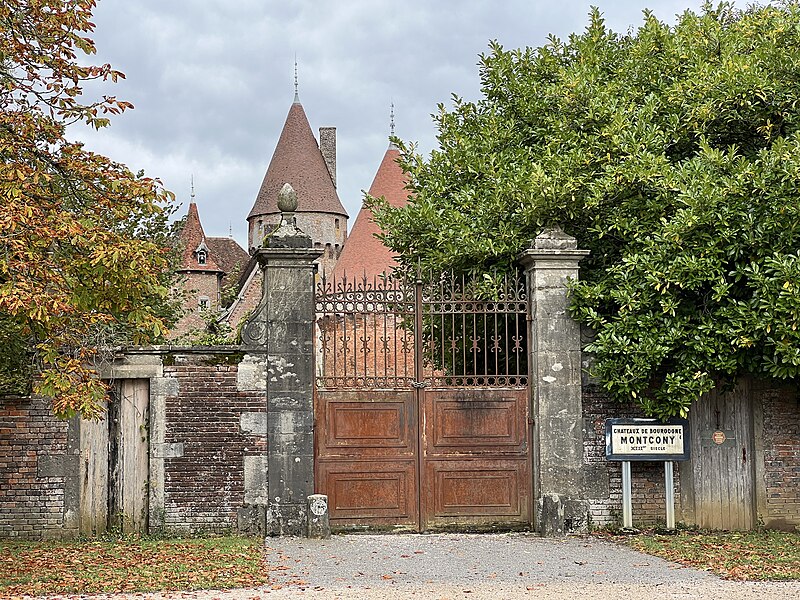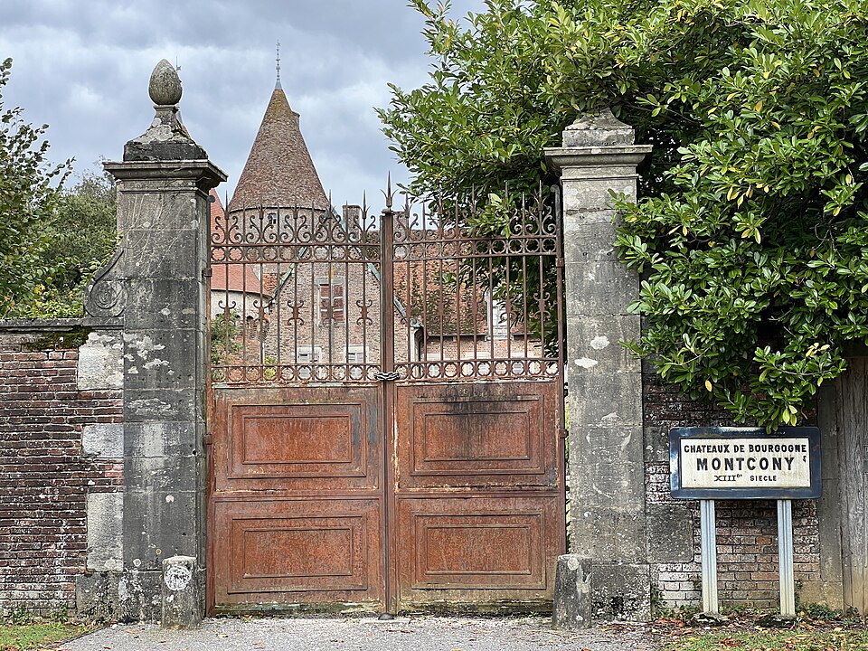 Le château de Montcony, édifice civil en brique typique de la Bresse, se situe au centre de la commune de Montcony, en bordure de la départementale 23 ; il occupe une motte sur une petite colline et est une propriété privée non ouverte au public. L'origine du site remonte vraisemblablement au XIIIe siècle, époque à laquelle la famille de Montcony est attestée ; en 1280 Renaud, seigneur de Montcony, fonde une chapelle dédiée à saint Eusèbe, et en 1434 Guillaume de Montcony reçoit la duchesse Isabelle de Portugal dans son château. Après la disparition de la lignée des Montcony, la seigneurie passe à René de Franay puis, en 1676, à Antoine Arviset ; à la fin du XVIIe siècle Jean Jehannin acquiert la propriété avant de la revendre en 1712 à la famille de La Rodde, qui la conserve ensuite par descendance et alliances, puis passe aux Mareschal de Longeville de La Rodde. Plusieurs membres de ces familles ont exercé des fonctions municipales et militaires ; l'histoire familiale se poursuit au XIXe siècle avec des successions et des transmissions qui maintiennent la propriété au sein de ces lignées. Le portail, les dépendances et la ferme ont été inscrits au titre des monuments historiques en septembre 1993, puis le château, ses fossés et son pont dormant ont été classés en mars 2001. Entre 2002 et 2005 les propriétaires ont entrepris, avec le concours du conseil régional de Bourgogne, du département de Saône‑et‑Loire et du ministère de la Culture, une importante réfection des toitures et charpentes de la tour nord‑est et de l'aile est du corps de logis, sous la direction de Frédéric Didier, architecte en chef des monuments historiques ; cette opération a reçu en 2006 un prix régional du patrimoine. Construit vraisemblablement au XIIIe siècle puis modifié au XVe siècle, le château a perdu ses courtines crénelées au début du XIXe siècle et a fait l'objet de remaniements intérieurs et d'ouvertures vers 1870 sous la direction de l'architecte Charles Suisse. L'ensemble occupe une terrasse quadrangulaire entourée de douves et cantonnée de quatre grosses tours rondes en brique, couronnées de mâchicoulis et coiffées de toits coniques en tuiles ocre; les deux tours nord, sur cinq étages, encadrent un corps de logis rectangulaire à étage carré et étage de comble, complété au sud par deux courtes ailes perpendiculaires. Dans l'angle nord‑est, une tour hexagonale abrite un escalier à vis en pierre. Les deux tours sud, désormais isolées par la destruction des murailles, défendaient autrefois un pont‑levis aujourd'hui remplacé par un chemin en remblais qui donne accès à une porte cochère sans couvrement, dont les piliers en bossages contrastent avec l'austérité des constructions. La tour sud‑ouest renferme une chapelle du XVIIIe siècle dotée d'un autel, d'un retable et de boiseries ; le salon du logis principal conserve des lambris du début du XIXe siècle et un cabinet aménagé dans l'épaisseur d'une muraille est décoré de papiers peints. La demeure est complétée par des communs comprenant un corps de bâtiment, un hangar, une ferme avec maisons d'habitation et un puits. Comme dans de nombreuses demeures, le mobilier et une partie du patrimoine mobilier ont souffert de vols et de dégradations depuis les années 1980 ; les éléments et archives restants ont été mis à l'abri par les propriétaires et le site a été sécurisé à partir des années 2000, faisant l'objet d'une surveillance particulière depuis 2007. Les armoiries et devises des familles qui se sont succédé sur le domaine sont conservées dans la mémoire historique locale et dans les sources généalogiques associées à la propriété.