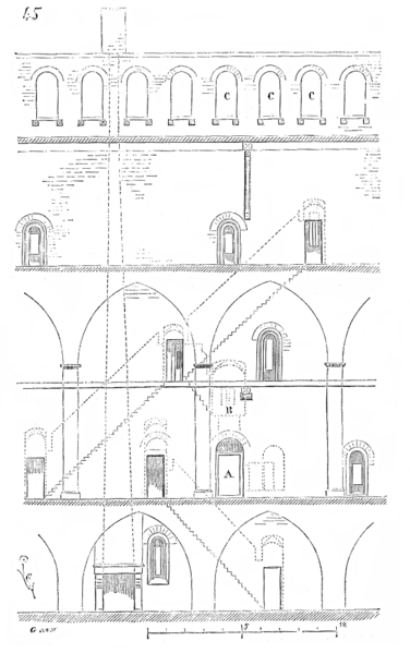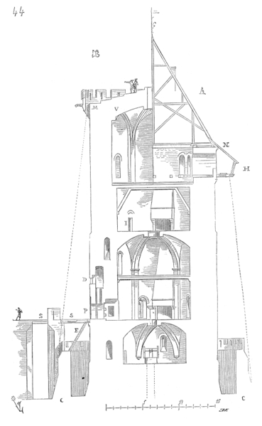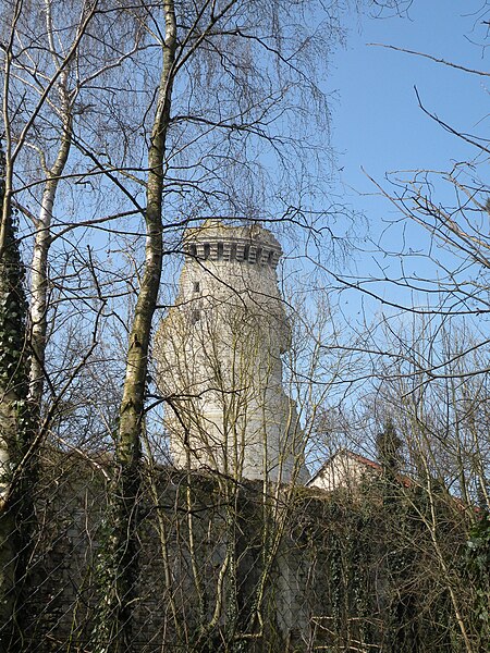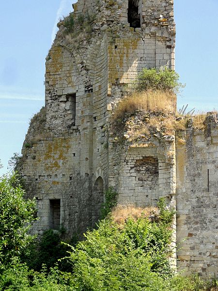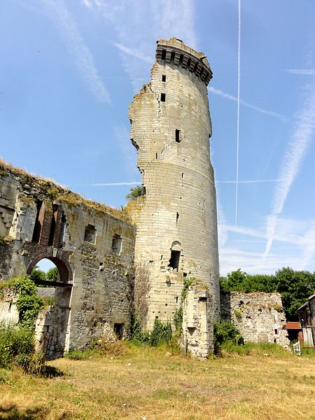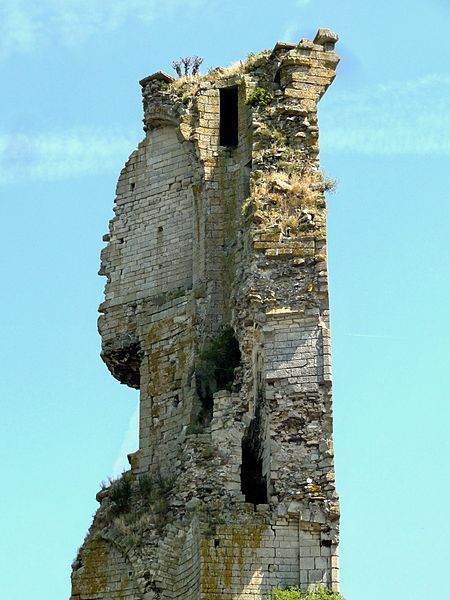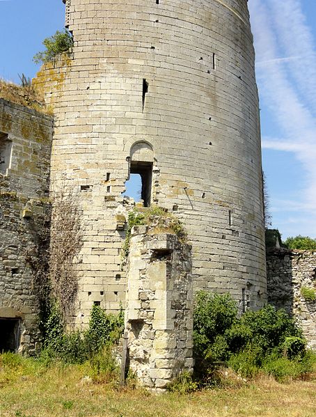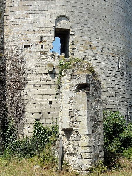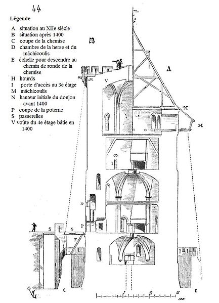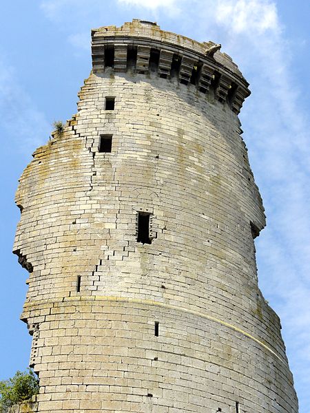 Le donjon mesurait environ 35 m de haut sur six niveaux et près de 17–18 m de diamètre ; l'entrée se faisait au troisième niveau par un pont‑levis et un couloir aménagé dans l'épaisseur du mur, flanqué de salles de garde, d'un assommoir et d'une herse. À l'intérieur, des escaliers rampants logés dans les murs desservent les différents niveaux ; le troisième niveau était séparé du quatrième par un plancher alors que le quatrième était voûté d'ogives ; des aménagements tardifs des sous‑sols et du couloir datent peut‑être du XVe ou du XVIe siècle. La tour, partiellement détruite depuis la fin de la guerre de Cent Ans et endommagée à nouveau pendant les guerres de Religion, ne subsiste aujourd'hui que par son flanc nord‑ouest ; sa datation présente des traits mêlant des références au XIIIe, XIVe et XVe siècles et reflète des remaniements, en particulier la surélévation des niveaux supérieurs avec mâchicoulis attribuée aux travaux de Jean Aubelet autour de 1409‑1411.