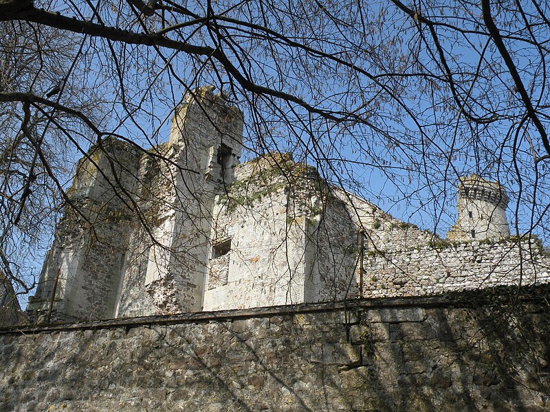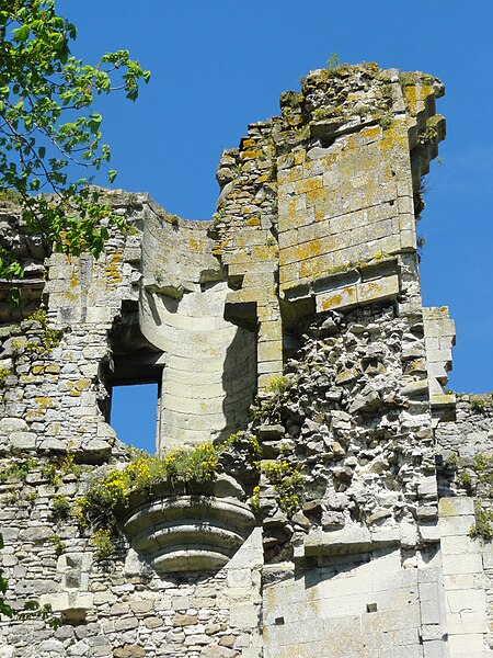 Les vestiges portent la marque d'au moins cinq campagnes de construction : une enceinte irrégulière avec neuf angles, la porte fortifiée entre deux tours en fer à cheval, le donjon circulaire ruiné, et le « château neuf » entamé au début du XVe siècle. La porte fortifiée forme un châtelet cantonné de deux tours rondes extérieures hautes de quatre niveaux (13,60 m) ; son passage voûté a été remplacé par un plafond en bois et des niveaux supérieurs à vocation résidentielle ont été ajoutés après la fin du XVe siècle. La muraille d'enceinte, entourée de larges douves aujourd'hui en partie remblayées, s'étend sur 80 à 90 m de diamètre et est construite en blocage de moellons, sans contreforts visibles permettant une datation précise.