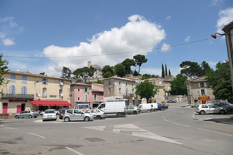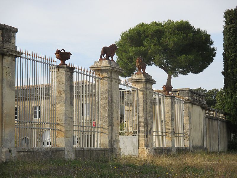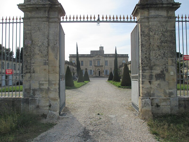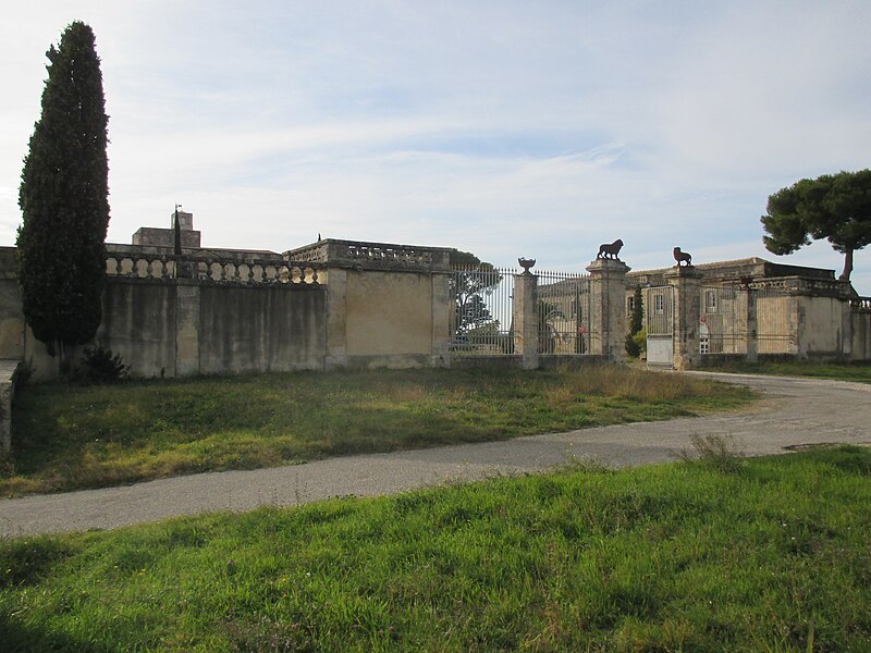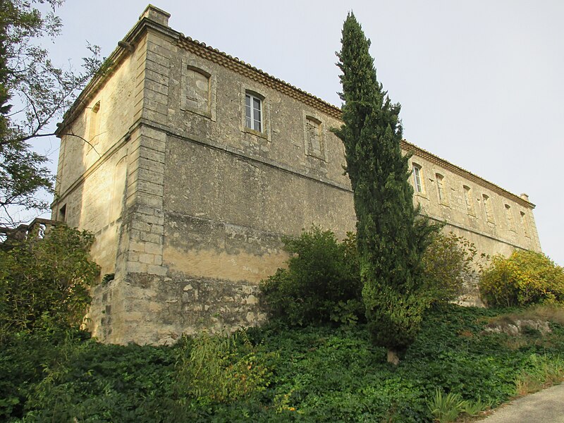 Le domaine de Montfrin présente un plan en grande composition : bâtiments et galeries forment une cour d'honneur conduisant à l'entrée principale dans l'axe. L'ensemble se compose de quatre corps de bâtiment entourant des cours, une courette et le vieux donjon (XIIIe siècle). Les façades est et sud affichent un motif central surmonté d'un fronton triangulaire, et la tour centrale aurait des bases romaines. Du château médiéval subsistent la cour de la citerne, une partie des remparts et quelques salles de l'aile nord. La demeure, de style classique, a fait l'objet d'une restauration générale en 1853. À l'intérieur, le grand escalier conserve des peintures en trompe-l'œil en camaïeu représentant Louis XIV et ses maréchaux, tandis que la salle à manger comporte une fontaine murale et des lambris Louis XVI encadrant des toiles. Sur le plan historique, le château a reçu saint François d'Assise, Saint-Louis, Louis XIII, Richelieu et Louis XIV.