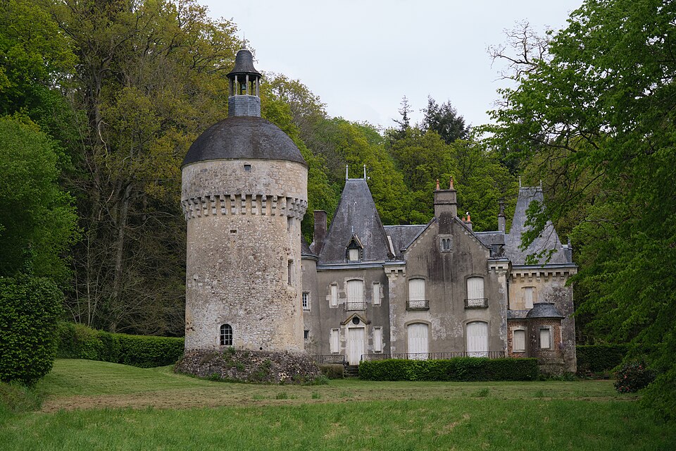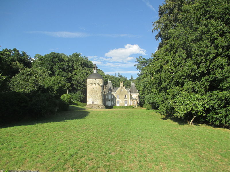 La puissante tour cylindrique, située à l'ouest du logis et dernier vestige de la première enceinte, se détache devant le château et est couronnée d'une galerie de mâchicoulis. Au rez-de-chaussée, une porte flamboyante porte la date de 1506, mais la tour est antérieure et sa date de construction reste débattue. L'accès primitif se trouvait au premier étage, par une poterne dotée d'un pont-levis. À l'intérieur, la tour présente un plan carré et un escalier à vis hélicoïdal sans noyau central desservait les étages ; à l'ouest se remarquent des niches de guet et des meurtrières aux angles sud-ouest et nord-ouest. La charpente porte la date de 1742 et fait l'objet d'une protection depuis 1975.