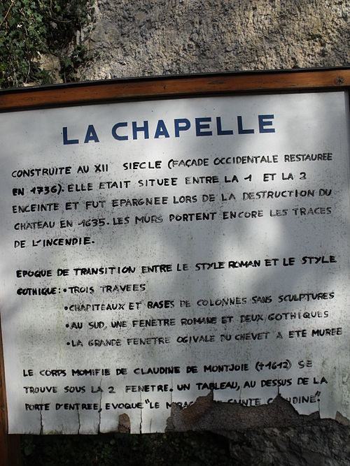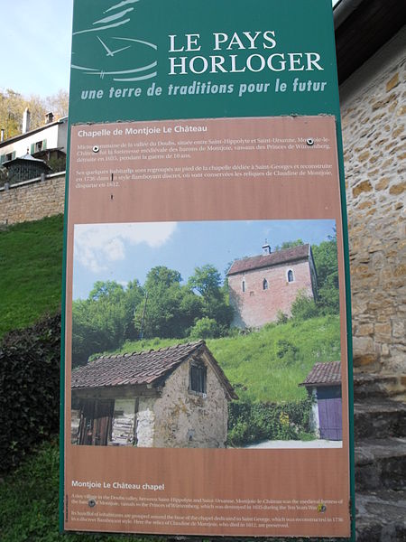 Le château de Montjoie-le-Château, en ruines, est situé sur la commune éponyme dans le département du Doubs, en Franche-Comté, et bénéficie d'une protection au titre des monuments historiques. Le château et le bourg tirent leur nom de la « montagne de la joie » (Mons Gaudii en latin, Frosberg en allemand), le site ayant été autrefois un lieu d'amusements et de réjouissances. Les ruines occupent un éperon dominant le bourg, dans la vallée du Doubs en amont de Saint-Hippolyte, position qui permettait de contrôler le passage étroit formé par la rivière. Le château semble avoir été édifié au début du XIIIe siècle, probablement par Richard Ier de Glère, durant les guerres de Méranie, sur l'emplacement d'un camp néolithique. Il fut le centre de la seigneurie puis de la baronnie de Montjoie. Il fut assiégé en 1428 par Jean de Thierstein sans résultat, puis pris par les troupes impériales en 1444 et de nouveau par les Confédérés suisses en 1475 pendant les guerres de Bourgogne. Pendant la guerre de Dix Ans, en mai 1635, le capitaine lorrain Saint-Balmont s'y réfugia avec environ 500 soldats ; après un siège d'environ trois semaines et plus de 200 volées d'artillerie, le château ouvrit ses portes le 6 juin 1635 et fut définitivement ruiné par les troupes françaises du maréchal de La Force. Le site est classé depuis le 27 janvier 1934 ; les ruines, les substructures, la chapelle et les vestiges archéologiques ont été inscrits au titre des monuments historiques le 24 juillet 1985. L'enceinte couvre environ 85 ares en forme trapézoïdale, fermée par un front semi-circulaire de 11 mètres, et comprenait les logis seigneuriaux, des logements pour la garnison, une chapelle, des tours entourées de deux épaisses murailles. Au sommet de l'éperon se dresse un massif donjon pentagonal, probablement daté du début du XIIIe siècle ; une grande partie en est encore debout. Le premier et le deuxième étage du donjon comportent une cheminée ; à droite de la cheminée du premier niveau se trouvent un lave-mains et un accès aux latrines. Des vestiges de murailles montrent de belles pierres à bossage qui soutenaient le cul-de-lampe d'une tour en encorbellement près de la chapelle, et des voûtes laissent entrevoir les entrées effondrées de certaines caves. La chapelle, bâtiment indépendant vraisemblablement construit en même temps que le château et donc datée du XIIe siècle, a été épargnée lors de la destruction du site par les troupes françaises. Placée sous le vocable de Saint-Georges et de style flamboyant, elle abrite la dépouille de Claudine de Montjoie, morte en 1612. Son architecture témoigne d'une transition entre le roman et le gothique : l'édifice présente trois travées, des chapiteaux et bases de colonnes non sculptés, une fenêtre de style roman et deux fenêtres de style gothique. Une étude ancienne sur le sujet est celle de Jean François Nicolas Richard, Essai sur l'histoire de la maison et la baronnie de Montjoie (1860).