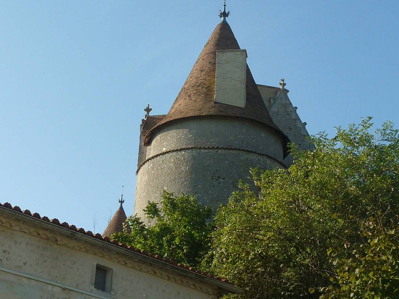 Le château de Montmoreau, situé dans la commune nouvelle de Montmoreau en Charente, est dominé par un unique corps de logis du XVe siècle. Il est flanqué de deux tours dont les bases sont plus anciennes et s'élève au‑dessus de la vallée de la Tude et de la petite ville. Les fossés du côté du plateau ont été comblés. Les rampants des pignons du grand logis portent des crochets flamboyants ; un pavillon occupe un côté et, à l’autre, une tourelle polygonale contient une vis d’escalier. L’accès se fait par une porte ornée d’accolades, de contre‑courbes et de pinacles, surmontée d’un tympan portant un bas‑relief héraldique. Du château primitif, détruit pendant la guerre de Cent Ans, subsistent des vestiges de l’enceinte intérieure, une porte monumentale, un pan de mur et deux tours ; le logis actuel a été rebâti entre ces tours, sur les remblais, au XVe siècle. La seigneurie est attestée depuis 1075 et appartenait alors à Alo (ou Alon), premier seigneur connu ; sa famille conserva la seigneurie jusque vers 1320. Selon Simonnaud, la seigneurie fut vendue en 1376 à Raymond de Mareuil ; au XVe siècle Guy puis Jean de Mareuil furent barons de Montmoreau. Par la suite, la possession passa aux Prévost de Sansac, aux Rochechouart, puis à la famille irlandaise des Perry, qui la détenait jusqu’au milieu du XIXe siècle. Le château a servi de gendarmerie et a été dévasté pendant la Seconde Guerre mondiale ; il fut ensuite acquis et partiellement restauré par M. Tête, artiste peintre et sculpteur. La chapelle, classée monument historique, est romane et pourrait avoir été bâtie par les moines qui édifièrent l’église Saint‑Denis. Elle comprend deux parties non contemporaines : une nef de deux travées du milieu du XIIe siècle et un chœur à plan tréflé de la fin du XIIe siècle, avec une rotonde centrale couverte d’une coupole et trois absidioles égales voûtées en cul‑de‑four. La coupole était primitivement enduite et ornée de fresques (martyre de saint Eutrope et diverses figures de saints) dont il ne reste rien. À l’extérieur, le chevet est décoré d’arcatures amorties reposant sur des pilastres à impostes ; ces arcs, très hauts par rapport à l’intérieur, laissent supposer l’existence d’un étage disparu. Certaines sources évoquent une datation possible du XIe siècle pour la chapelle située dans les jardins, mais les éléments architecturaux visibles renvoient principalement aux aménagements des XIIe et XVe siècles. La chapelle a été classée le 15 mai 1952 et les façades et toitures du château le 18 septembre 1952.