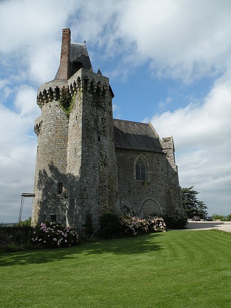 Le château de Montmuran, situé sur la commune des Iffs en Ille‑et‑Vilaine, se trouve à 28 km de Rennes et à 49 km de Saint‑Malo ; il est classé au titre des monuments historiques depuis le 17 septembre 2003. Le site est peut‑être d’origine antique : l’oppidum de Montmuran aurait été, avant Corseul, le centre politique des Coriosolites. Au XIe siècle, Alain III de Bretagne fonde l’abbaye Saint‑Georges de Rennes et y associe la seigneurie de Tinténiac, qui sera donnée en fief au chevalier Donoual chargé d’y édifier une forteresse. Un premier château en bois est construit en 1036 puis détruit par les Plantagenêts en 1168 ; vers 1170, le seigneur de Tinténiac fait rebâtir en pierre une forteresse dont subsistent au moins deux tours intégrées à l’édifice actuel. Aux XIVe et XVe siècles, Montmuran est une puissante place forte composée de plusieurs tours reliées par des courtines ; le château passe en 1352 à la famille de Laval et la chapelle voit des événements marquants : en 1354 Bertrand Du Guesclin y est adoubé après avoir repoussé une attaque anglaise, et en 1374 il épouse Jeanne de Laval dans cette même chapelle. La tradition locale conserve le souvenir d’un « chemin sanglant » associé à ces combats, explication à laquelle s’ajoute le fait que le sol de certains secteurs contient de l’oxyde de fer, de teinte rougeâtre. Au XVe siècle le châtelet et la chapelle sont repris, puis la seigneurie reste dans les familles Laval et Coligny jusqu’au milieu du XVIIe siècle ; Charlotte de Laval épouse Gaspard de Coligny dans la chapelle en 1547. De 1643 à la fin du XVIIIe siècle, la propriété change de mains à plusieurs reprises (familles Hamilton, Huchet, Coëtquen, Mornay, de la Motte) ; saisie à la Révolution, elle est vendue en 1794 à la famille Bizien du Lézard, puis rachetée en 1888 par M. de La Villéon, dont les descendants en sont propriétaires. Un incendie criminel en 1889 endommage une partie du château. Inscrites depuis le 26 septembre 2000, les dépendances ont précédé le classement de l’ensemble en 2003. Plus récemment, une poutre s’écroule en 2020, la mérule est repérée dans la charpente en 2022 et un important chantier de restauration est lancé ; le projet reçoit en 2023 une aide du Loto du patrimoine de 300 000 € et les travaux s’achèvent en juillet 2024. Le château est ouvert à la visite les après‑midi d’été et lors d’événements comme la Nuit des châteaux ou les Journées du patrimoine ; il accueille aussi des réceptions et des tournages. Architecturalement, on accède au domaine par une allée boisée ; l’ensemble comprend deux tours nord du XIIe siècle, un châtelet imposant du XIVe siècle composé de deux tours à mâchicoulis encadrant l’entrée, une herse, des douves et deux ponts‑levis encore fonctionnels. La partie centrale, enfilade de salons formant le logis, date du XVIIe siècle et a été remaniée au XVIIIe siècle ; l’un des tours conserve d’ailleurs d’intéressantes étuves du XIVe siècle. Le domaine comprend également une orangerie et des dépendances du XVIIIe siècle, ainsi que des parterres en terrasses qui soulignent sa position dominante et offrent une vue dégagée sur la campagne. La chapelle conserve des vitraux ornés des écussons de France et de Montmorency‑Laval. Le peintre Emmanuel de La Villéon a réalisé des tableaux représentant le château, qui a servi de lieu de tournage pour Belle Dormant (2015), L’île de la demoiselle (2024) et pour certaines scènes du docu‑fiction Tuer au nom de Dieu d’Hugues Nancy, diffusé le 26 août 2025.