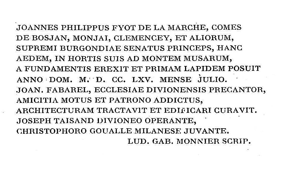La première pierre fut posée en juillet 1765 ; l’abbé Fabarel fut chargé du contrôle des travaux, secondé par l’entrepreneur Joseph Taisand et le milanais Christophe Goualle, tandis que Bernard Poyet supervisa le chantier pour de Wailly. Les travaux semblent achevés en 1769 : François Attiret livra des statues pour la colonnade et François Devosge exécuta des bas-reliefs et devait peindre Apollon entouré des Muses dans la coupole. Ces réalisations ne suffirent pas à empêcher les difficultés financières de Jean-Philippe Fyot, qui démissionna en 1772 et mourut la même année.