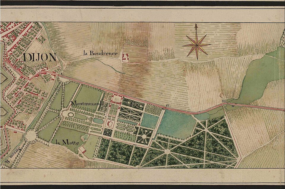 Claude-Philibert Fyot de La Marche, héritier en 1723, enrichit le domaine en acquérant des parcelles voisines, dont la Motte Saint-Médard et le pâquier de La Lochère. Par ces achats et des travaux hydrauliques il constitua un ensemble clos qui, selon un arpentage de 1748 par Edme Verniquet, rassemblait 403 journaux environ, soit près de 137 hectares. Il fit aménager des jardins remarquables à la française avec parterres, bosquets de charmilles, théâtres de verdure, boulingrins, labyrinthe, fontaines, canal et pièces d’eau, reliés à Dijon par trois allées de tilleuls ; la porte Bourbon facilitait cette liaison.