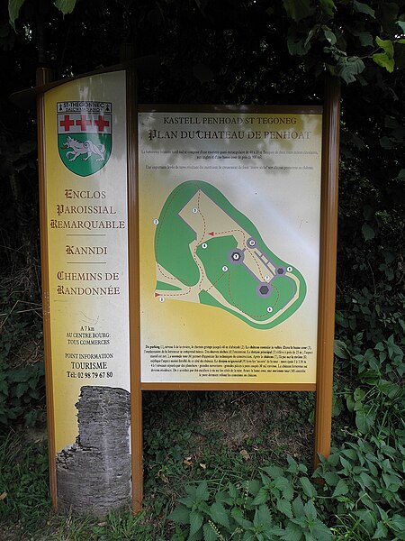 La forteresse aurait été construite au XIIIe siècle par Guillaume, sire de Penhoat, à son retour de croisade. Ses dispositions ont évolué avec les progrès de l'artillerie et les vestiges conservés semblent dater du XVe siècle. Après les destructions liées aux guerres de la Ligue, il ne reste que deux tronçons des tours cylindriques sud et nord, en moellons de schiste, ainsi qu'un pan de la courtine est. La tour sud était surmontée d'un châtelet. Le tracé encore visible d'une courtine indique qu'elle reliait les deux tours entre elles et au donjon. Au sud devait se trouver une enceinte rectangulaire, défendue par un second fossé.