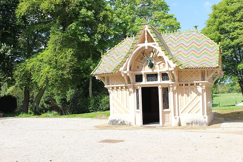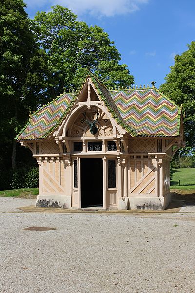 Le bâtiment présente aujourd’hui un long plan rectangulaire sobre, composé d’un rez‑de‑chaussée surélevé, d’un étage et de combles percés de lucarnes à frontons. Dans les communs, installés au hameau du Haut, les toitures sont ornées de tuiles rondes vernissées à dentelles (tafettes) et d’épis de faîtage (gaudions) qui rythment les lucarnes. On remarque également le pavillon de chasse, dont la toiture est d’influence orientale et qui est surmonté de têtes de gibiers, derniers vestiges des constructions du XIXe siècle. La sellerie conserve un poêle en faïence destiné à chauffer la pièce et à préserver la souplesse des selles et harnachements ; un décor en terre cuite peinte subsiste sur un mur extérieur.