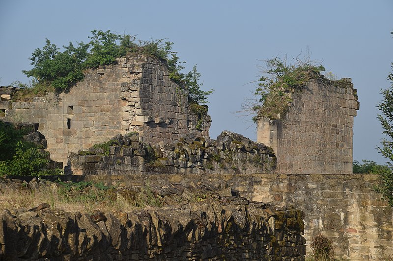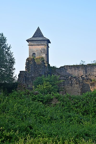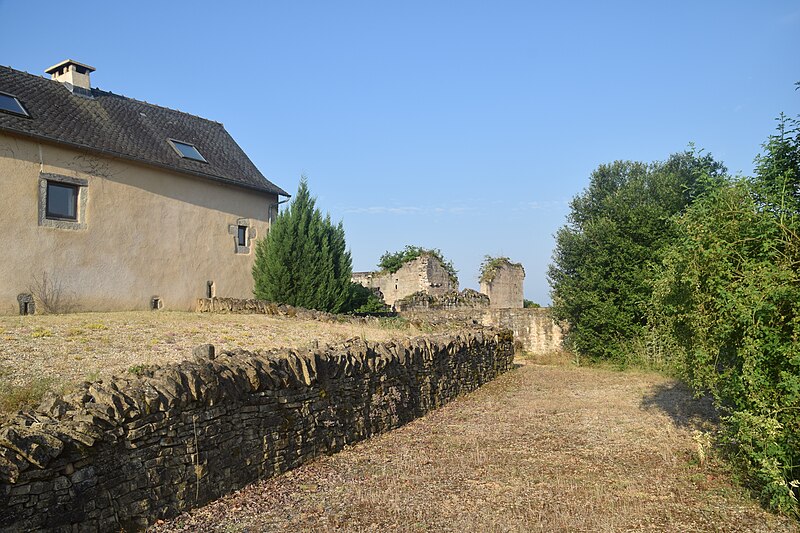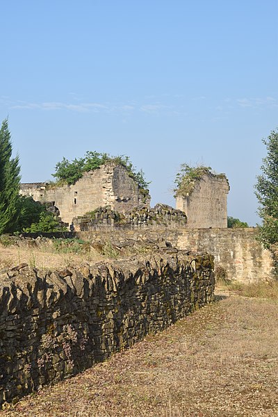 Château du XIVe siècle, acquis par les abbés de Beaulieu vers 1369-1370 et appartenant à la communauté jusqu'en 1789, date à laquelle il est signalé comme ruiné. L'enceinte extérieure conserve son tracé principal et est réalisée en pierre de taille et en grès de Villeveyre. Elle est protégée aux quatre angles par des tours carrées, dont deux subsistent. Sur la façade sud et à l'intérieur du rempart se trouve une tour ronde qui contenait un escalier à vis, dont la trace reste encore apparente. L'accès se fait par une porte ogivale intacte, située au nord et défendue par une tour carrée qui abritait, à sa base, le porche d'entrée. Les ailes ogivales de ce porche ont disparu, mais la paroi conserve un fragment des arêtes aiguës et les bases de départ reposent sur des chapiteaux. Une poterne s'ouvrait à l'est, protégée par la tour d'angle nord-est. Une nouvelle enceinte flanquée de tours carrées a été ajoutée ultérieurement pour agrandir l'édifice du côté nord.