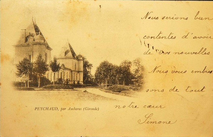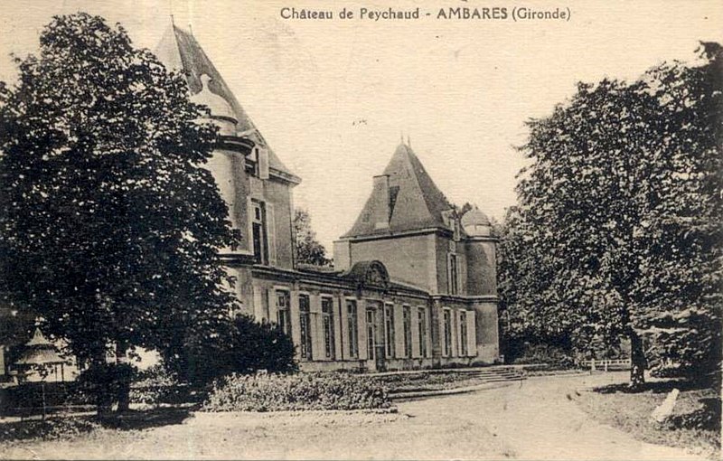 Le château de Peychaud a été bâti par le marquis de Fayet, conseiller au Parlement de Bordeaux. La seigneurie, mentionnée depuis le XVIe siècle et appartenant à la famille Fayet, a sans doute vu son ancien château reconstruit vers 1680 puis au début du XVIIIe siècle. À cette époque il se composait d'un long corps de logis en rez-de-chaussée, flanqué au nord de bâtiments agricoles qui formaient une ou deux cours aujourd'hui détruites. Pour assainir les marais du domaine, les propriétaires firent appel, à la fin du XVIIe ou au début du XVIIIe siècle, à des spécialistes hollandais du drainage; de nombreux canaux d'irrigation et de drainage subsistent encore. Le corps de logis primitif était cantonné de deux pavillons carrés couverts en pyramide; le fronton de la porte a été refait. Des tourelles rondes et les ailes de la façade d'entrée semblent être des adjonctions postérieures. Abandonné depuis la Révolution, le château a été remanié vers 1871 pour l'amiral Ch.-M. Dompierre d'Hormoy, ministre de la Marine, comme l'atteste une plaque. Lors de ces travaux, deux pavillons en rez-de-chaussée agrandirent le logis, la toiture fut modifiée, le décor refait et les dépendances agricoles reconstruites plus loin.