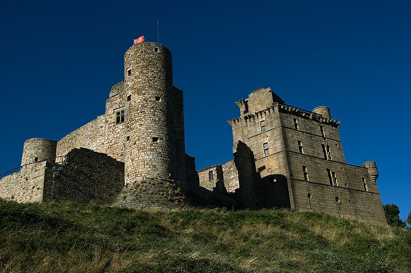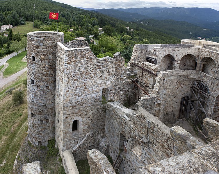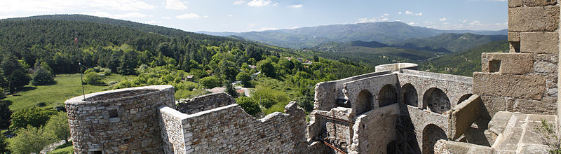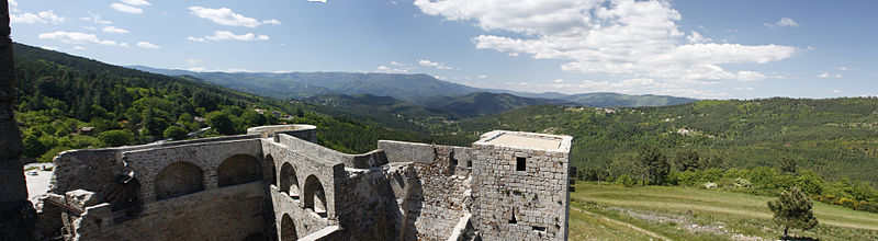 Perché au col des Portes, à 577 mètres d'altitude, le château contrôle la voie de Regordane qui était empruntée par les pèlerins de Saint-Gilles et offre un large panorama du Mont Lozère jusqu'aux Alpes. Sa présence est attestée de façon sûre en 1177, tandis que d'autres sources évoquent une mention dès le XIe siècle ; l'origine exacte de la construction reste incertaine et pourrait correspondre à une évolution progressive d'un noyau défensif primitif. Propriété de la maison d'Anduze, il passa par succession à Guillaume de Châteauneuf-Randon avant d'être acquis au début du XIVe siècle par Raymond Guillaume de Budos, neveu du pape Clément V, qui entreprit vraisemblablement des travaux importants correspondant à la structure médiévale. Un descendant fit édifier la partie Renaissance et, entre ces deux campagnes, plusieurs aménagements intermédiaires furent réalisés. Le château fut complété et agrandi aux XVe et XVIe siècles ; il connut ensuite des transformations militaires importantes lors des Guerres de Religion, avec la création de glacis, d'une barbacane, de plates-formes d'artillerie et l'élévation du bastion sud‑est dans la seconde moitié du XVIe siècle. La seigneurie s'enrichit et fut élevée en vicomté puis en marquisat au début du XVIIe siècle ; la maison de Budos s'éteignit à la fin du XVIIe siècle et la propriété passa au Prince de Conti, puis fut cédée à Louis XVI au XVIIIe siècle. Nationalisé à la Révolution, le domaine changea plusieurs fois de mains avant d'être acquis en 1841 par la famille de La Vernède, qui fit procéder à des travaux de remise en état. L'exploitation intensive des mines de charbon au cours de la Première Guerre mondiale provoqua des effondrements du sous-sol, occasionnant des désordres sur le château et dans le village voisin ; le village fut évacué en 1929, rasé en 1933 et reconstruit de l'autre côté de la colline. Des comblements de galeries et cavités sous l'édifice, réalisés vers 1960, ont contribué à sa stabilisation, mais l'état de la partie médiévale restait préoccupant, suscitant la mobilisation des habitants en 1969 et la création en 1972 de l'association "Renaissance du Château de Portes" pour assurer sa sauvegarde. Le monument, classé au titre des monuments historiques en 1984 et nommé Ambassadeur du Parc national des Cévennes en 2011, appartient aujourd'hui aux héritiers de la famille Coquebert de Neuville. Le site illustre six siècles de techniques de construction fortifiée et doit son surnom de « vaisseau en Cévennes » à son éperon très aigu, incliné à 49 degrés, qui évoque la proue d'un navire. Le château se compose de deux corps distincts : le château vieux, organisé en quadrilatère irrégulier ceint de courtines et de tours, présente une façade ouest talutée percée par la porte principale défendue par un assommoir et une poterne, flanquée de deux tours rondes et protégée par une barbacane formant terrasses ; la cour d'honneur est bordée à l'ouest et au nord par des courtines élevées, dotées d'un chemin de ronde appuyé sur une galerie, tandis qu'au sud s'ouvre un corps de logis rectangulaire muni d'une galerie et que l'est est occupé par deux bâtiments accolés. Le château neuf, ou bâtiment Renaissance, domine l'angle sud‑est du vieux château ; il présente un plan en triangle très effilé jusqu'à son sommet, s'élève sur quatre niveaux couverts par une terrasse surmontée d'une tour de guet et de deux postes de garde, et est desservi par un escalier à vis du côté de l'éperon. La restauration conduite par l'association, affiliée à l'Union Rempart, repose en grande partie sur des chantiers bénévoles et des actions d'éducation populaire ; le château est ouvert au public du printemps à l'automne et accueille expositions, animations pédagogiques et événements culturels.