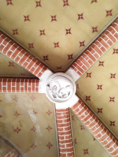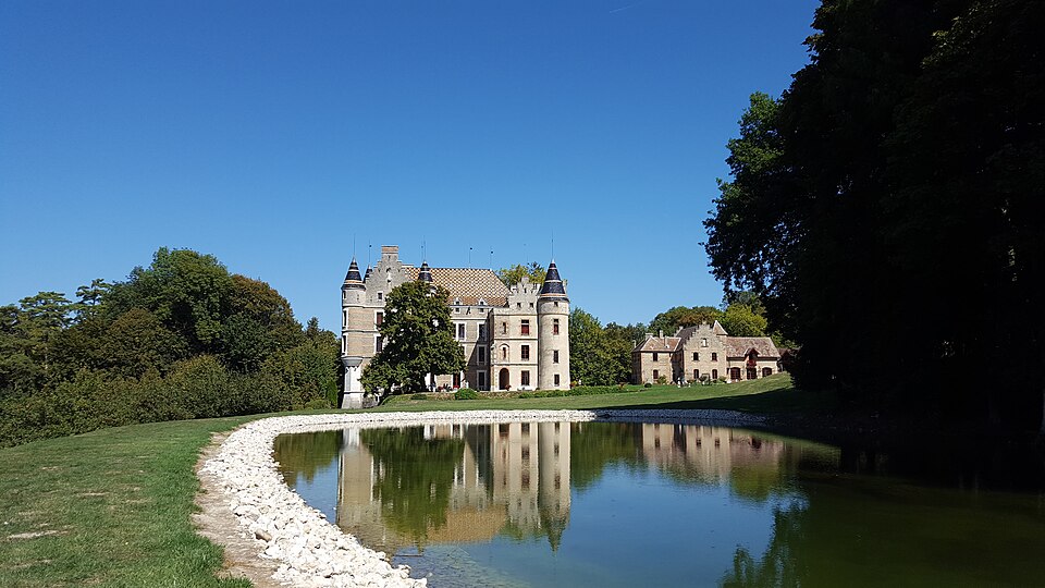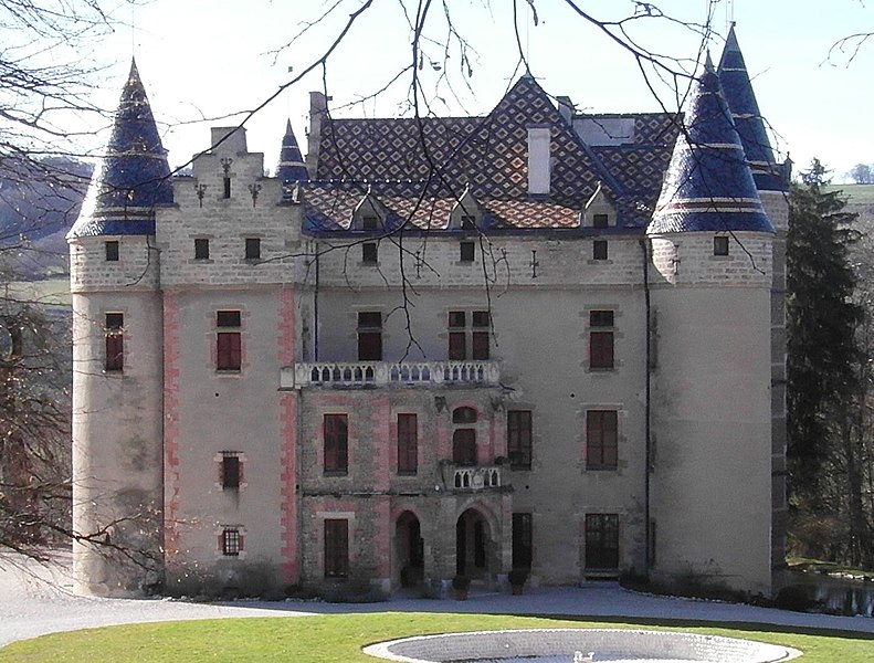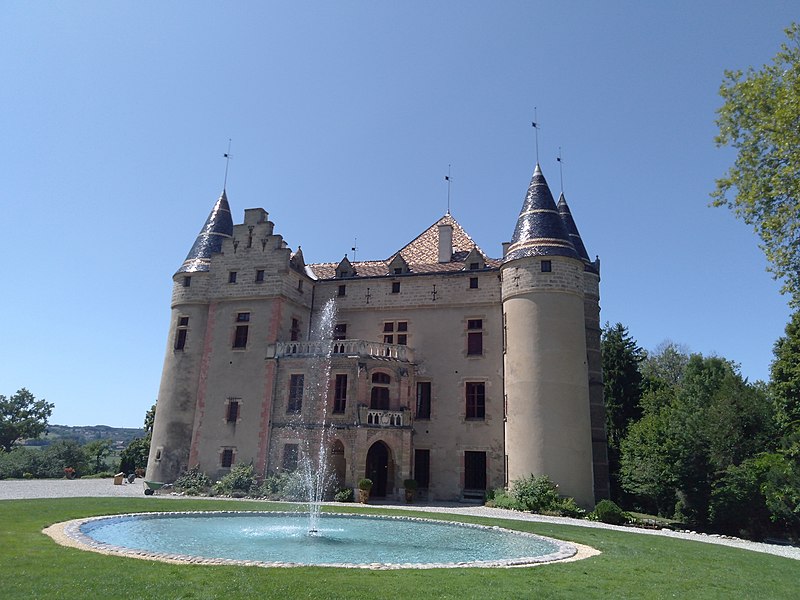 À l’intérieur, les décors mêlent divers matériaux : bois peint, brique et marbre se côtoient, et l’on retrouve de nombreux faux drapés typiques des restaurations de Viollet-le-Duc. Le grand salon abrite une cheminée monumentale dont le manteau sculpté illustre une scène rappelant le don de terres par la famille de Virieu pour la construction de l’abbaye de la Sylve-Bénite ; ce salon présente également des tapisseries de la manufacture royale de Beauvais. La bibliothèque, ornée de boiseries peintes, conserve de précieux ouvrages et des archives que la famille avait mises à l’abri avant son exil et qui ont regagné les armoires à livres sur deux étages.