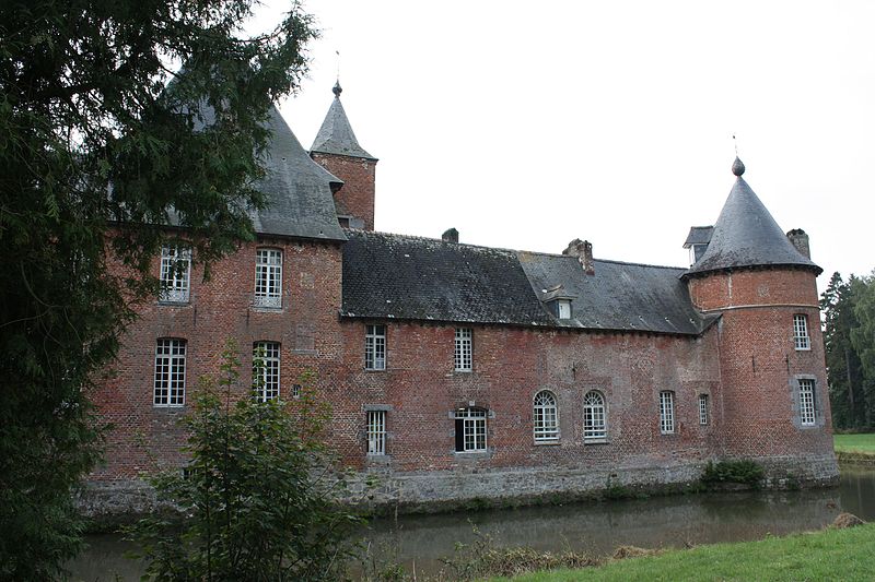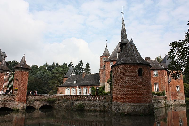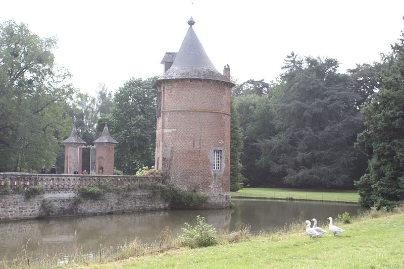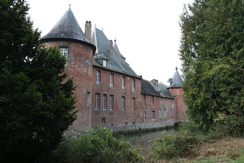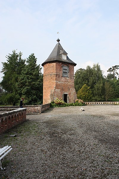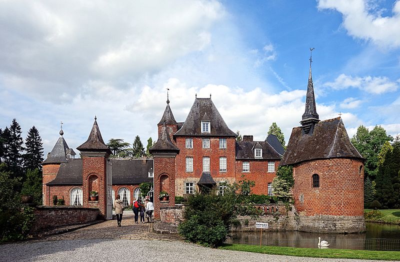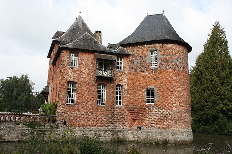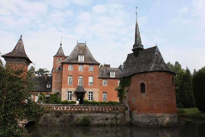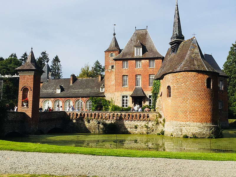 Le château de Rametz, situé à Saint-Waast (Nord) sur les rives de l'Hogneau, près de Bavay, présente des origines médiévales (XIIIe–XIVe siècles), des transformations successives entre le XVIe et le XIXe siècles et une reconstruction au XVIIIe siècle sur des fondations plus anciennes. Il est construit en briques rose orangé ponctuées de pierres calcaires sur un soubassement en grès. La vue aérienne révèle le plan rectangulaire de l'ancienne forteresse cantonnée de tours cylindriques et entourée de douves. À l'intérieur, certaines salles situées dans les tours conservent voûtes, meurtrières et un escalier dérobé. La salle des gardes a été rhabillée dans la seconde moitié du XIXe siècle et la salle à manger est décorée de peintures de J. Léonard (1848). Le bureau possède des boiseries du début du XIXe siècle et la cuisine est voûtée en berceau de briques. Le château se déploie dans un parc de cinq hectares doté d'arbres centenaires. Les façades et les toitures, les quatre tours, la cour, les douves avec leur pont ainsi que le portail d'entrée sont classés au titre des monuments historiques depuis le 2 mars 1979. La salle des gardes et la salle à manger près de la tour nord‑est, avec leur décor, ainsi que la cheminée du grand salon et celle de la petite salle à manger, sont inscrites. Propriété privée, le château devait être ouvert lors des journées du patrimoine prévues les 19 et 20 septembre 2020 — finalement annulées en raison de la crise sanitaire — avec une visite du donjon, de la cuisine, de la chapelle et de la galerie. La documentation photographique montre notamment l'entrée actuelle, une vue du parc et le pigeonnier.