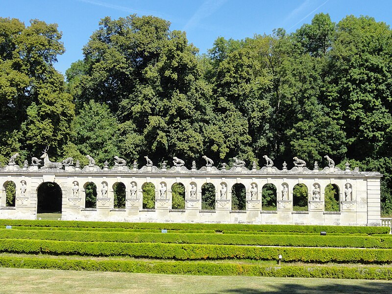 Les haies cynégétiques, qui bordent la cour d'honneur au nord et au sud et ont contribué à la célébrité du lieu, sont classées aux Monuments historiques par le décret de 1924 et sont considérées comme uniques en France. Probablement dues à Nicolas de Lancy, ces balustrades, de style tardivement Renaissance et inspirées d'exemples italiens du XVIe siècle, reflètent le goût pour la chasse et l'Antiquité ; Lancy avait d'ailleurs des liens familiaux et des voyages en Italie, ce qui laisse supposer l'intervention d'artistes italiens ou l'importation de sculptures. À l'origine les balustrades reliaient le château actuel au vieux château démoli en 1766 et formaient une disposition diagonale ; Henry de Barres fit niveler la cour et déplacer les balustrades pour les rendre parallèles, opération conduite entre le 20 mai et le 26 octobre 1766. Chaque balustrade est dominée par des sculptures de chiens de chasse et présente un portique central surmonté d'un cerf au nord et d'un sanglier au sud, symbolisant respectivement la chasse au cerf et la chasse au sanglier. De part et d'autre du portique, neuf baies en plein cintre sont surmontées de petits frontons en enroulement coiffés de sculptures de chiens : un chien sur deux est assis, les autres sont en diverses attitudes d'affût ou d'attaque, et chaque balustrade compte vingt chiens au total, dont deux sur le portique. Le niveau inférieur obéit à un parti décoratif différent : dix-neuf baies encadrées de niches abritent des bustes antiques, masculins et féminins, montés sur piédestaux ; deux de ces bustes représentent toutefois le seigneur de Raray et son épouse. Les têtes sont toutes distinctes tandis que les cartouches sous chaque niche se ressemblent, et les critères ayant présidé au choix des personnages restent inconnus.