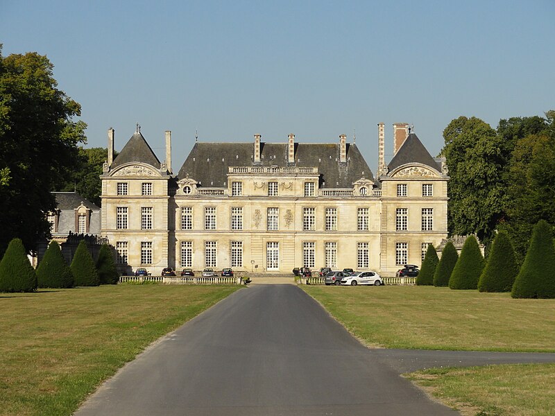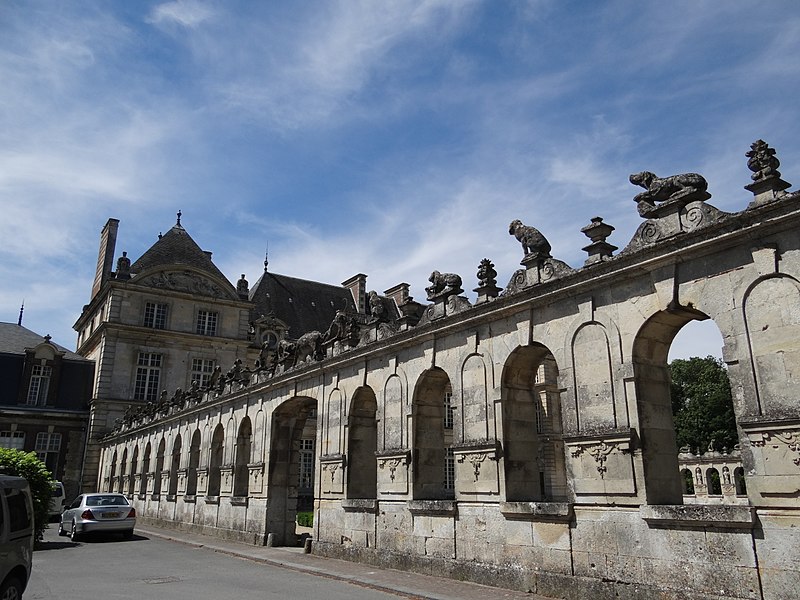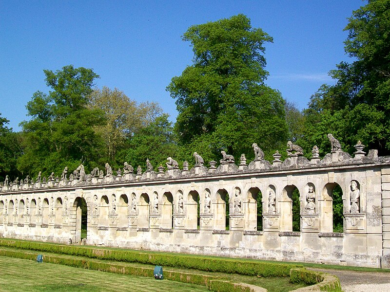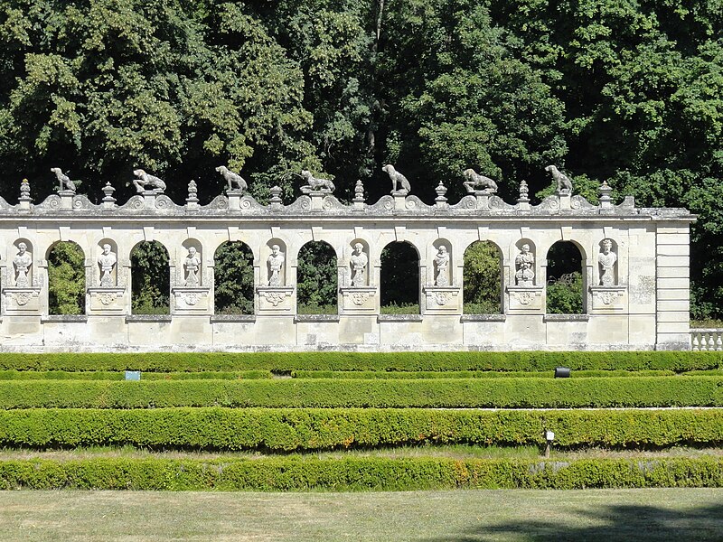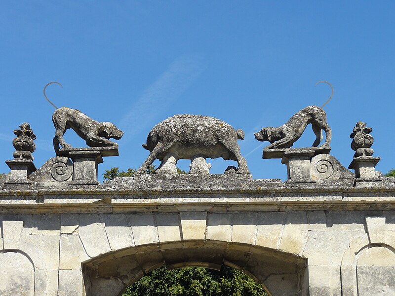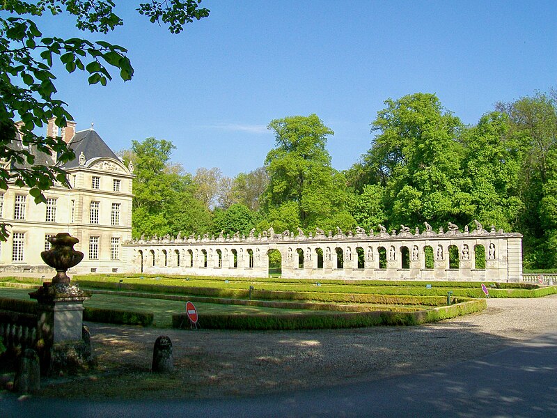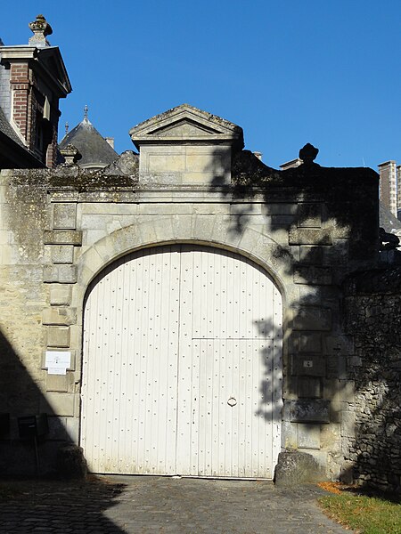 Le parc est clos par un mur d'enceinte daté de 1610-1620, ponctué de quatre tourelles et comportant la Porte rouge au nord, contemporaine des balustrades et remarquable pour ses vantaux peints de cette couleur. Cette porte, qui donne accès à la forêt et célébrait la chasse, porte un linteau surmonté d'une Diane assise entre deux lévriers et est soutenue par des pilastres évoquant des cariatides ; comme pour les haies, la porte aurait été déplacée, une carte de 1723 la situant à l'est du château. La Porte rouge, située sur le terrain du golf, n'est pas accessible au public ; deux des tourelles d'angle ouvrent toutefois sur la rue RD 26 en provenance de Senlis ; dépourvues de meurtrières, elles présentent de simples orifices et sont coiffées de toits en pierre en dôme ornés d'une boule. Le pignon des anciennes écuries, inscrit aux Monuments historiques avec le mur de clôture, se trouve rue Nicolas‑de‑Lancy, presque en face de l'église ; son échauguette en encorbellement est de plan rectangulaire. Dans la cour de service attenante, aujourd'hui parking du golf, subsiste un colombier rond qui n'est cependant pas protégé.