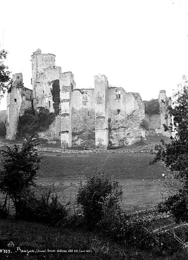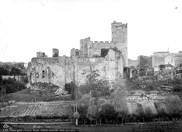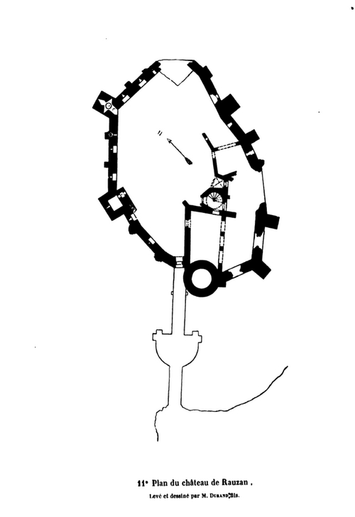 Le château de Rauzan se dresse sur la commune du même nom, en Gironde, sur un rocher occupé dès l'Antiquité. Il a été érigé au XIIIe siècle par Jean Sans Terre, alors roi d'Angleterre et duc de Guyenne. Propriété successivement de Rudel de Bergerac puis de Guillaume-Raymond de Madaillan, le château a été témoin de la guerre de Cent Ans et a été pris à plusieurs reprises par les Français, notamment par Bertrand Du Guesclin en 1377. Après un procès opposant Henri IV d'Angleterre et Jeanne d'Armagnac, épouse de Guillaume-Amanieu de Madaillan, le domaine passa à Bernard Angevin, qui navigua selon ses intérêts entre les camps anglais et français et conserva finalement ses biens en se rangeant du côté de la couronne de France à la fin du conflit. Progressivement réaménagé après les troubles, le château évolua d'une forteresse vers une résidence seigneuriale. Les Durfort de Duras en prirent possession mais l'abandonnèrent peu à peu, et des carriers de Bordeaux extrayèrent des pierres, provoquant l'effondrement de la partie nord. En 1819 les ruines appartinrent aux Chastellux, puis la commune acquit le site en 1900. Classé monument historique par la liste de 1862, le château ne retrouva l'attention du public qu'à partir des années 1970 lorsque la commune et des passionnés entreprirent des travaux de débroussaillage et de restauration; en 1993, le mur d'enceinte de la basse-cour fut inscrit aux monuments historiques.