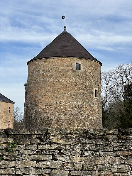 Les seigneurs successifs sont attestés par leurs armoiries : Brancion, Nanton et Lugny ; La Chambre porte « d'azur au chevron d'or, accompagné de trois têtes de lion arrachées d'or, lampassées de gueules, posées deux et un » ; Nompar de Caumont, duc de Lauzun, porte « d'azur à trois léopards d'or l'un sur l'autre, armés, lampassés et couronnés de gueules » ; Gontaut-Biron est représenté par « un écu en bannière, écartelé d'or et de gueules ».