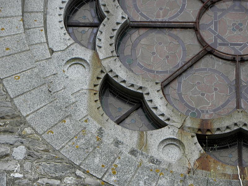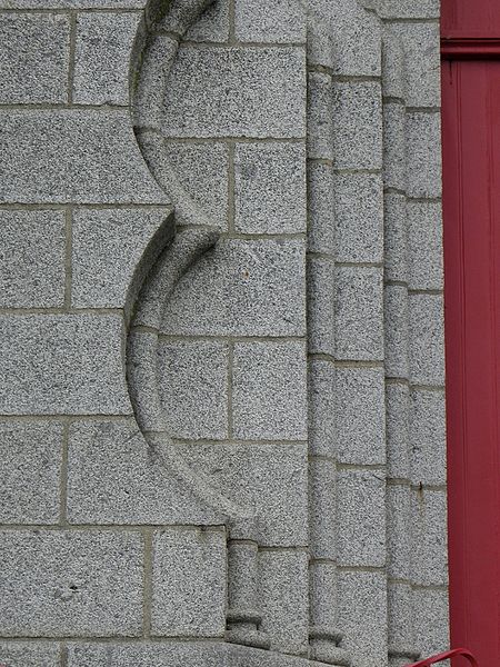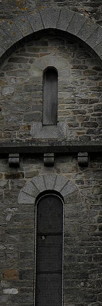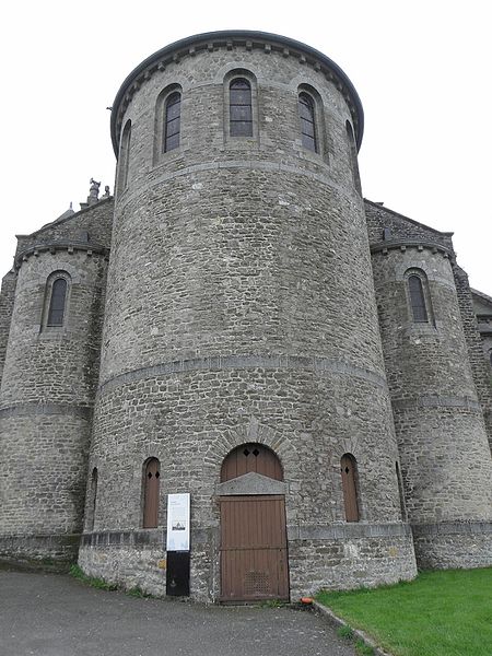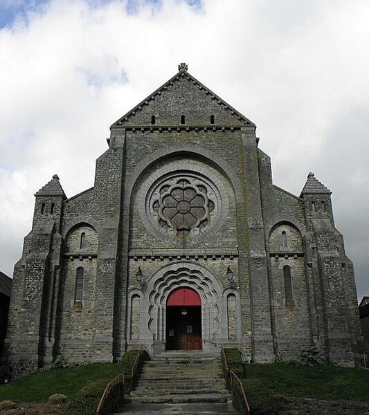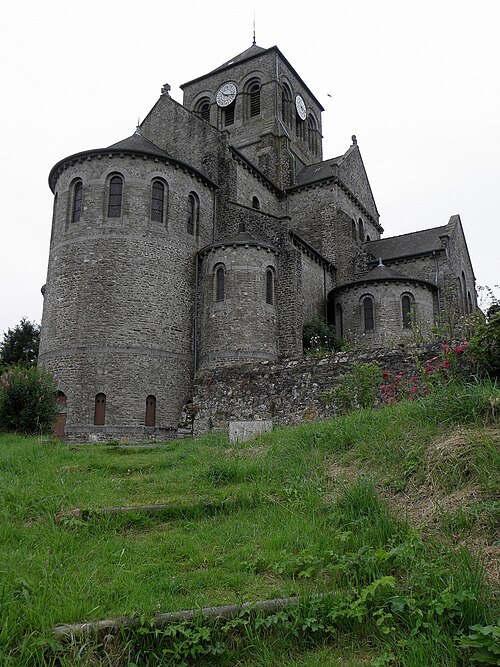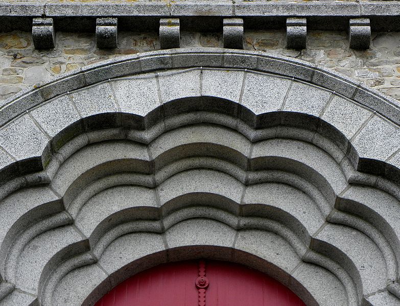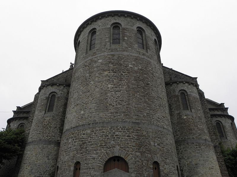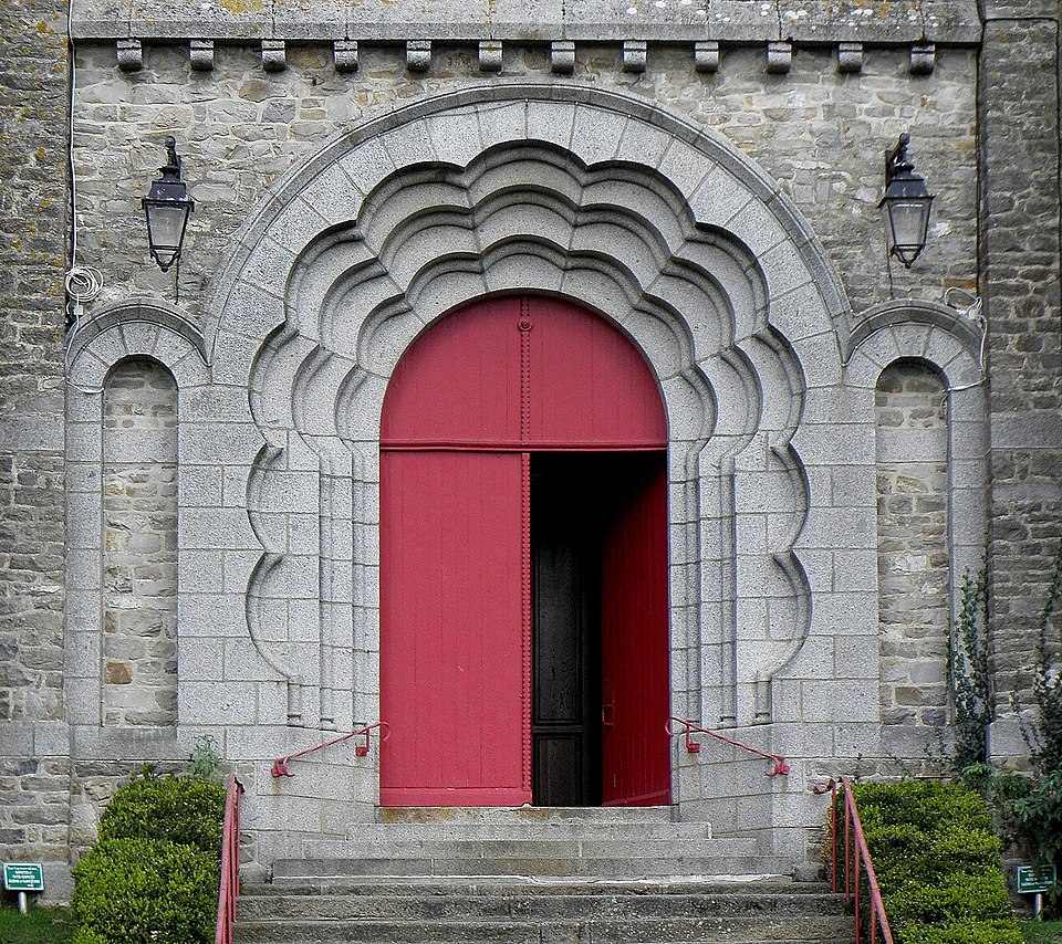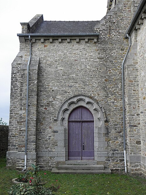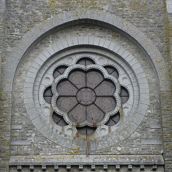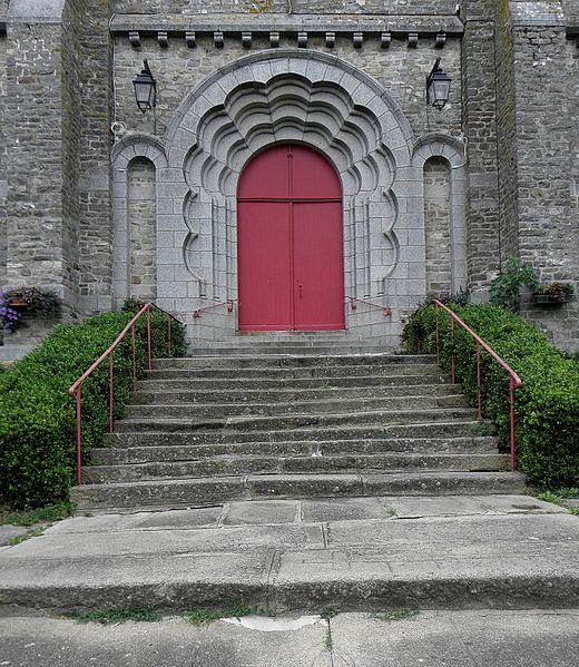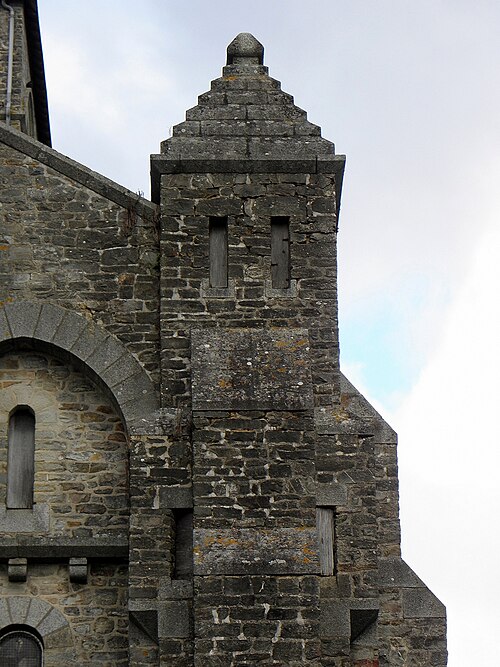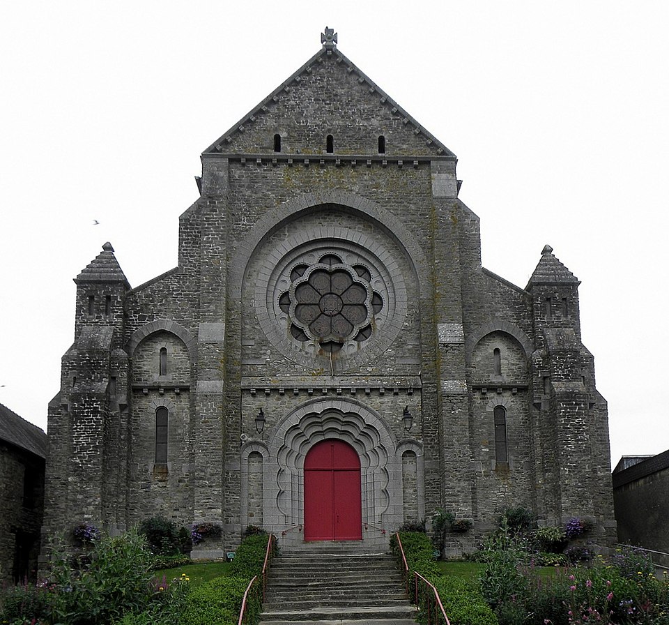 Orientée vers le nord, l'église offre son entrée principale sur la façade méridionale que l'architecte a mise en valeur par une esplanade engazonnée et une triple volée de marches rachetant le dénivelé depuis la place Alexandre Veillard. Malgré une parcelle étroite et un bâti voisin, Mellet a conçu une composition monumentale en décalant la façade par rapport à l'alignement des maisons pour créer un cheminement ascensionnel depuis les rues voisines. L'édifice s'inscrit dans le corpus néo-roman d'Henri Mellet, d'influence limousine et auvergnate, et préfigure d'autres réalisations telles que celles de Saint-Malo-de-Phily, Saulnières et la chapelle du lycée Saint-Vincent à Rennes. Les voyages de l'architecte et les conseils d'Arthur Regnault, ainsi que des filiations aux travaux de Paul Abadie, ont nourri son inspiration. La façade se distingue par une austérité liée à une quasi-monochromie et à l'emploi de pierres locales (granit gris, cornéenne), compensée par un agencement soigné des moellons et des pierres de taille et par une stéréotomie travaillée du portail et de la rose.