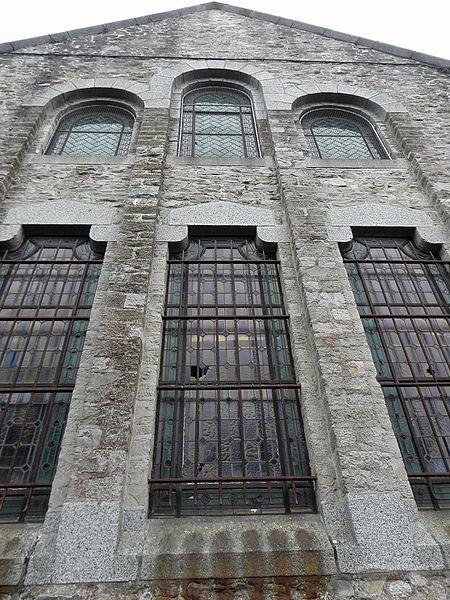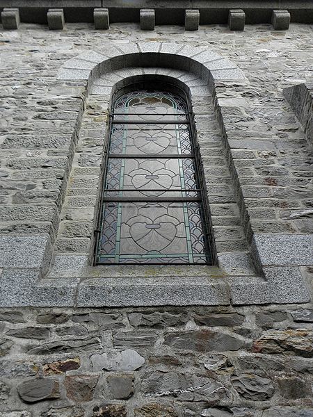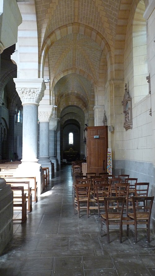 Le maître-verrier rennais Rault a réalisé au début du XXe siècle un ensemble cohérent de vitraux qui se répartit en trois sous-ensembles. La nef et les collatéraux présentent des grisailles mécaniques ornées d'entrelacs et de bordures feuillagées bicolores alternant des teintes bleu/jaune et rouge/vert ; la rose de la façade, aux tons jaunes et violets, s'orne de motifs feuillagés d'inspiration gothique. La chapelle du transept gauche reçoit des verrières plus chamarrées composées de rinceaux multicolores sur fond turquoise et de bordures de feuillages, motifs repris dans les baies de l'absidiole sur fond rouge. Le rond-point du chœur contient les vitraux historiés de l'édifice représentant des saints sous des dais ouvragés — parmi eux saint Henri, saint Louis, saint Aubin, le Christ (Sacré-Cœur), saint Malo, saint Jean et saint Michel — encadrés d'une bordure bleue ponctuée de feuilles et d'ornements turquoise et or. Le programme iconographique conduit le fidèle d'une grisaille néo-romane vers des verrières de plus en plus figuratives à l'approche du sanctuaire.