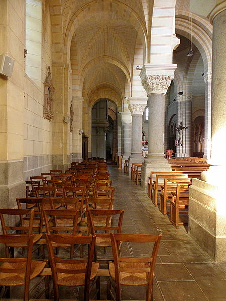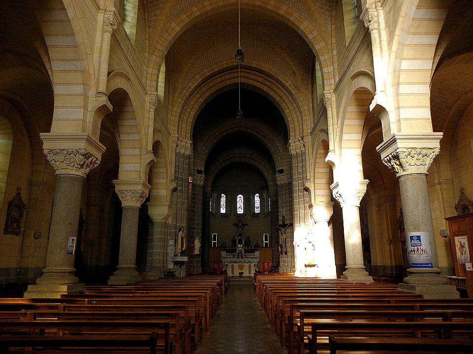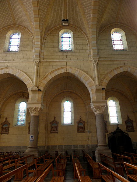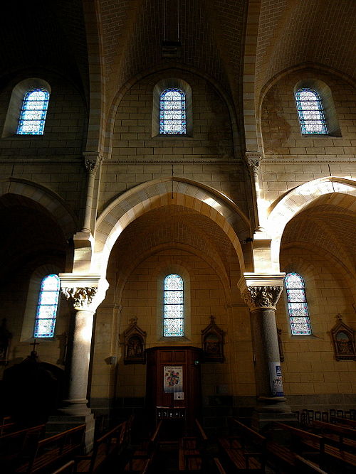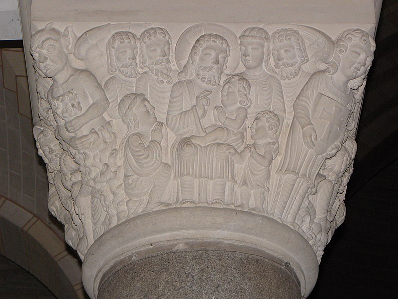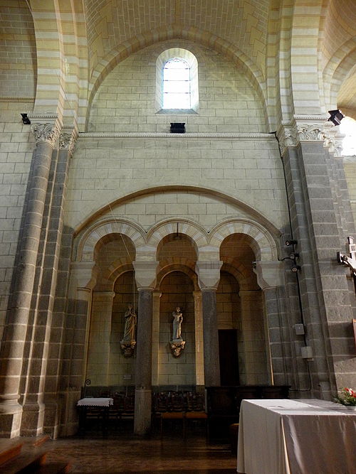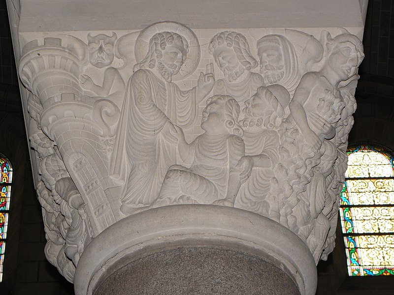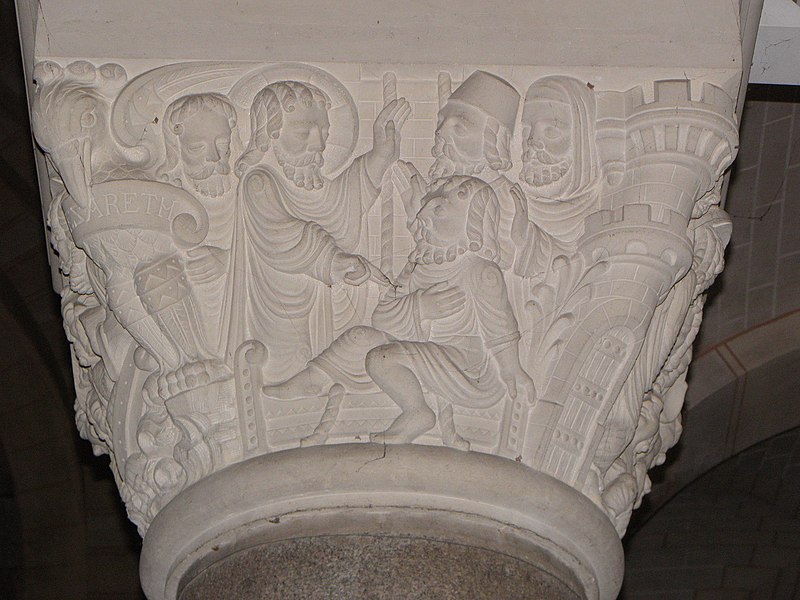 À l'intérieur, quatre chapiteaux sculptés illustrent des scènes bibliques et mariales : du côté nord figurent des épisodes de la vie du Christ (guérisons, apaisement de la tempête, descente du paralytique, Jésus et les enfants), des scènes liées au règne de David et des épisodes mariaux comme l'Annonciation et l'Assomption ; du côté sud se lisent la présentation de Marie au Temple, des thèmes liés à l'Immaculée Conception et au mariage de Marie et Joseph, ainsi que des scènes évangéliques telles que la Pentecôte, les Rameaux, l'enseignement sur la montagne, la Résurrection et la Cène.