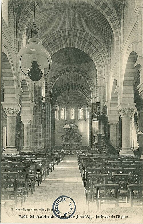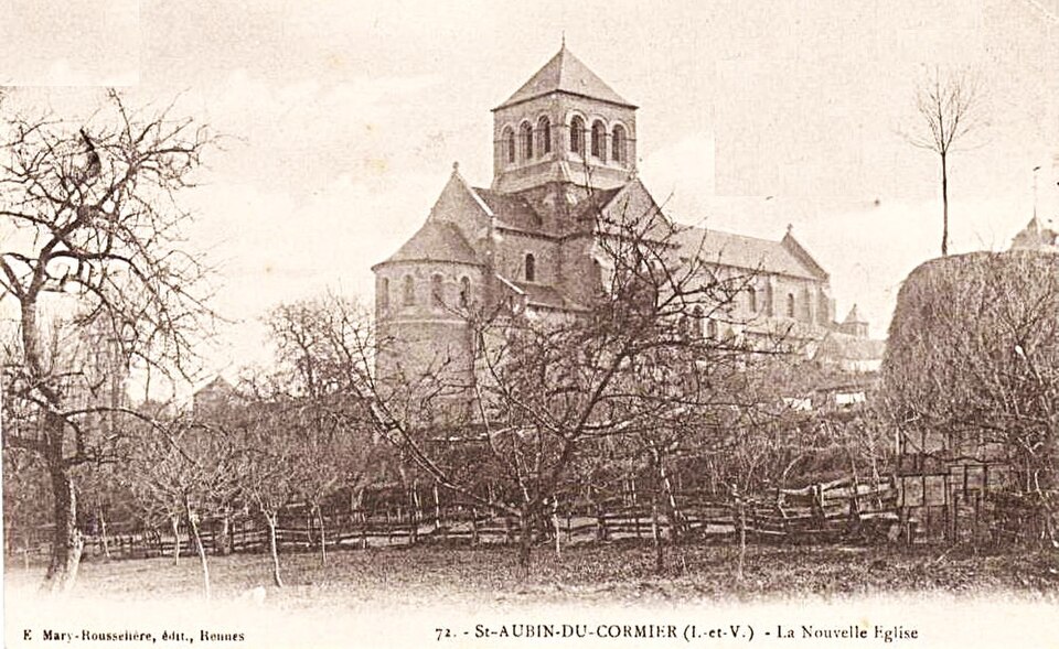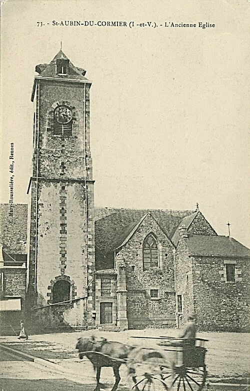 L'église Saint-Aubin est située à Saint-Aubin-du-Cormier, dans le département d'Ille-et-Vilaine. La première église primitive, appelée Saint-Malo-de-Bécherel, se trouvait à cinq cents mètres de la ville ; elle tomba en ruines et cessa d'être paroissiale en 1730. Le culte fut alors transféré dans la chapelle Notre-Dame, dite chapelle ducale, qui prit le patronage de Saint-Malo ; cette chapelle fut détruite en 1903 à l'exception de la tour dite Veillard. Une nouvelle église, conçue par Henri Mellet et réalisée par l'entrepreneur Richer, fut construite entre 1899 et 1902. Le monument a été inscrit aux monuments historiques par arrêté du 31 juillet 2015.