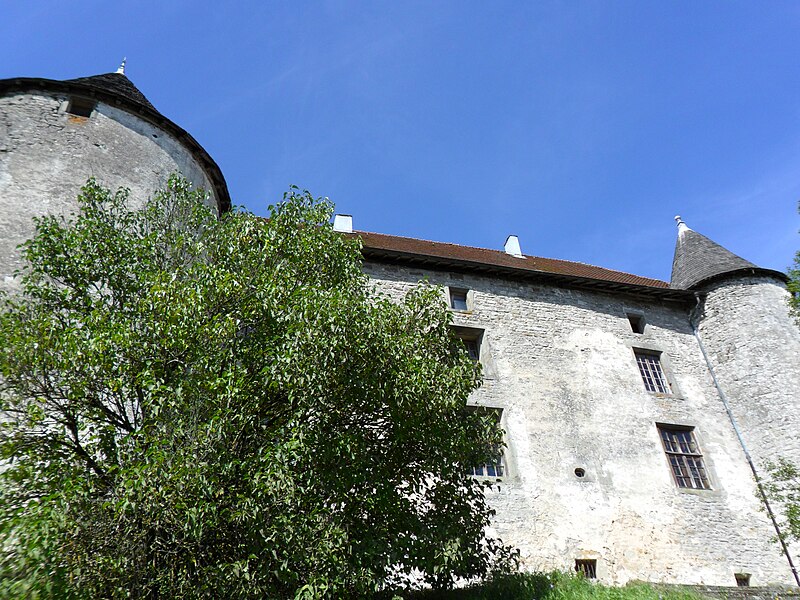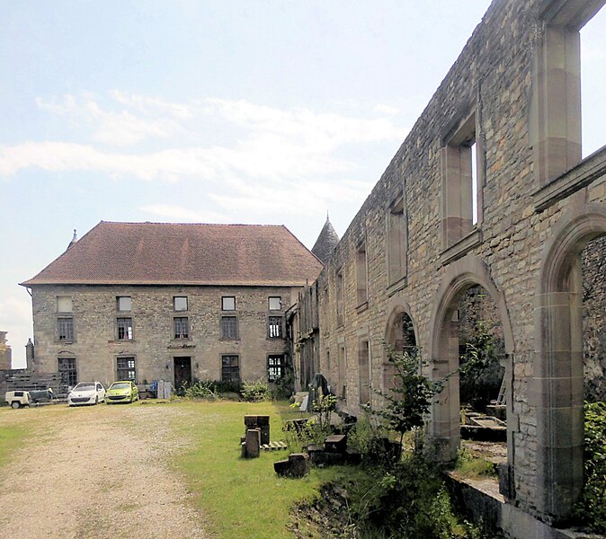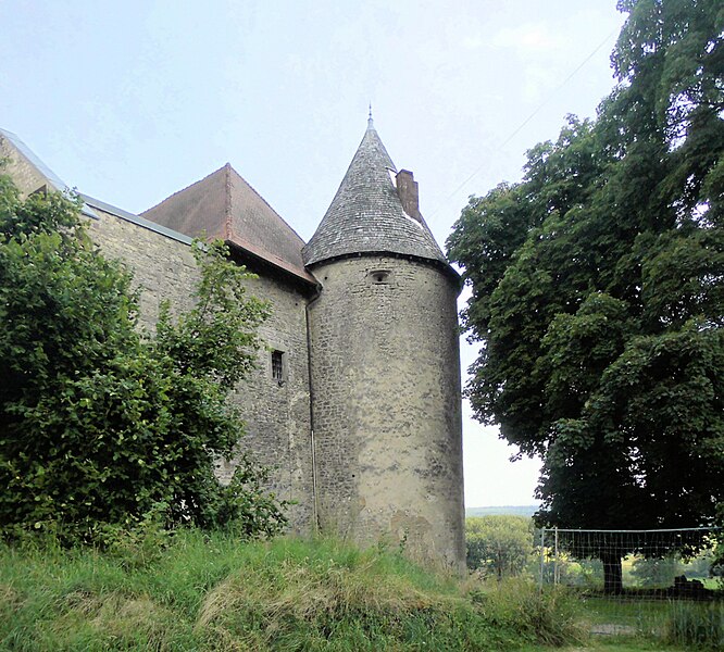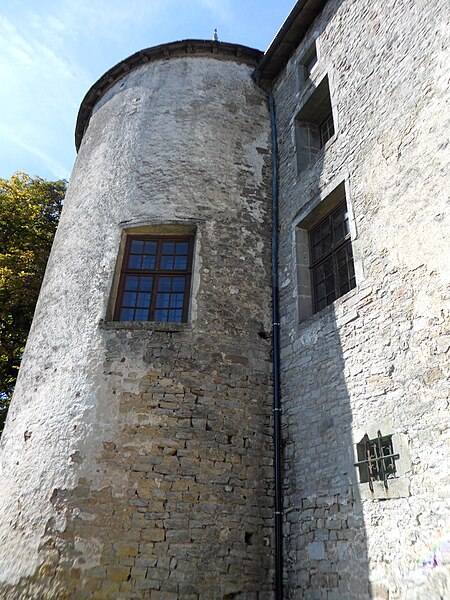 Le château de Saint-Baslemont se situe sur la commune éponyme, à l'ouest du département des Vosges en région Grand-Est. Il s'élève sur la pointe sud d'une colline qui porte le village et jouxte l'église paroissiale Saint-Jean-Baptiste. Depuis son sommet, il domine le vallon de Chèvre-Roche et le ruisseau de Thuillières, qui conflue avec la Saône à Bonvillet, et offre une vue vers l'est sur le village voisin de Thuillières et son château, dessiné au XVIIIe siècle par Germain Boffrand. Construit au XIVe siècle par les comtes de Montreux, il passe vers 1487 à la famille de Reinach par le mariage de Marie de Montreux et de Louis de Reinach. Des transformations importantes sont menées en 1581 par les Reinach afin d'actualiser le château médiéval ; Claude de Reinach en hérite à la fin du XVIe siècle. Son petit‑fils Jean‑Jacques de Haraucourt (1600-1644), colonel d'infanterie au service du duc Charles IV de Lorraine, devient ensuite propriétaire ; son épouse, Alberte‑Barbe d'Ernécourt (1607-1660), est connue sous le surnom d'Amazone Chrétienne pendant la guerre de Trente Ans. Le château est assiégé par les Suédois en 1635. Par mariage, il entre en 1646 dans la famille des Armoises et y reste jusqu'à la mort d'Antoine‑Bernard des Armoises en 1768. Il est ensuite vendu à Jean Baptiste Alexandre, qui n'y réside pas ; sa fille Marie‑Thérèse‑Adélaïde Alexandre en hérite et épouse Charles‑Antoine‑Joseph Regnault de Raulecourt, maire de Nancy de 1816 à 1830. Revendu en 1847 à Charles Nicolas, il change plusieurs fois de mains avant d'être acquis au début du XXe siècle par Adolphe Amédée Louveau, dit Fernand Samuel, directeur du Théâtre des Variétés de Paris de 1892 à 1914. Louveau venait régulièrement à Vittel en compagnie d'Ève Lavallière ou de son épouse Jeanne Saulier ; à sa mort en 1914, sa fille Jeanne Louveau (1895-1980), qui se faisait appeler Jean Lavallière, hérite puis vend le domaine à Mme Labourot. Ève Lavallière achète une maison nommée Béthanie à Thuillières, où elle termine sa vie. En 1922 le château est transformé en hôtellerie ; le corps principal de logis et les tours nord et sud sont inscrits à l'inventaire des monuments historiques le 21 avril 1937. Abandonné après la Seconde Guerre mondiale, il fait l'objet de premières restaurations engagées par M. Labourot, qui répare d'abord les communs avant qu'un incendie provoqué par la foudre en 1975 ne les détruisse. Le propriétaire entreprend ensuite la restauration du corps de logis pour en faire un restaurant ; le logis principal a été restauré mais les communs sont restés en ruine après l'incendie. En 2017, le château est devenu la propriété de Patrick Groult. Le bâtiment a été profondément remanié au fil des siècles et présente aujourd'hui un plan en L, avec le corps de logis principal flanqué de deux tours d'un côté et des dépendances de l'autre. La haute façade sud du corps de logis a été percée à la fin du XVIIe et au début du XVIIIe siècle et domine deux terrasses aménagées en jardin ; la façade nord s'ouvre sur une cour d'honneur, probablement aménagée à la fin du XVIIe siècle. Le logis, symétrique, comporte trois niveaux d'ouvertures encadrées de grès rouge ; les croisées qui équipaient à l'origine les fenêtres ont été bouchées ou remplacées. La toiture à croupes, recouverte de tuiles en écaille, a été entièrement refaite après l'incendie de 1975. À l'intérieur subsistent des salles voûtées, des silos et des oubliettes médiévaux, ainsi qu'un escalier d'apparat conduisant au jardin en contrebas. Les deux tours rondes, datées du XIVe siècle, ont des toits coniques en bardeaux et sont d'inégale taille — le château comptait à l'origine quatre tours. La plus petite, au sud‑est, comporte trois meurtrières à sa base ; la plus grande, au sud‑ouest, présente une meurtrière‑canonnière à mi‑hauteur et plusieurs canonnières à redents sous la toiture ; ces ouvertures défensives sont principalement orientées au sud, tandis que les canonnières côté nord ont été partiellement obturées. Les dépendances, situées à l'ouest de la cour et formant l'autre bras du L, datent de la Renaissance ; elles présentent des ouvertures récentes et quelques anciennes croisées murées depuis longtemps. Un haut mur d'enceinte ferme la cour d'honneur, percée d'un portail en demi‑lune surmonté d'une grille en fer forgé du XVIIIe siècle, encadrée de pilastres polygonaux à fûts moulurés et couronnée de vases ciselés, dont l'un est tombé en 2015. À gauche du portail, hors de l'enceinte, l'église Saint‑Jean‑Baptiste, ancienne chapelle castrale, a été édifiée vers 1560 par la famille Reinach dans un style gothique ; son clocher est couronné d'un dôme à l'impériale, forme répandue en Franche‑Comté. L'église comprend trois nefs et trois travées voûtées sur croisées d'ogives, avec un chœur à chevet plat qui abrite un autel en bois doré du XVIIIe siècle. La nef reçoit un retable du XVIe siècle intitulé Le Christ et les douze apôtres, classé le 4 août 1939, sous la statue de Saint‑Jean‑Baptiste du XIVe siècle, classée le 26 novembre 1964 ; le retable en pierre présente sept arcades en relief, teintées d'ocre rouge avec des traces de dorure. Le chœur s'ouvre sur deux chapelles latérales : au nord la chapelle Saint‑Claude, faite par Claude Reinach comme chapelle funéraire et voûtée sur liernes et tiercerons, avec les statues de Saint‑Claude et Saint‑Vincent ; au sud la chapelle Notre‑Dame‑de‑Lorette, édifiée par Gérard de Reinach et renfermant un bas‑relief illustrant la légende de Lorette. La sacristie a été ajoutée en 1747. Enfin, du XIIe au XVIIIe siècle, six familles se sont succédé à la seigneurie de Saint‑Baslemont : les familles de Saint‑Baslemont, de Graux, de Montreux, de Reinach, de Haraucourt