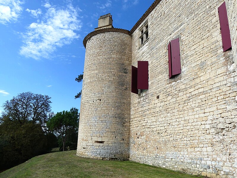 Sur le plan architectural, le corps de logis, orienté vers la vallée, est encadré par deux tours rondes dont l’une, plus importante, conserve son rôle de poste de guet et commande le point de jonction du chemin venant de Bonneville avec la route de Monpazier à Villeréal, grâce à sa canonnière principale. Il est vraisemblable que le château a subi une première transformation au XVIIe siècle, quand les tours furent découronnées, selon la tradition parce que le seigneur de Biron se serait offensé des propos du châtelain. Au fil des siècles, divers bâtiments ont été adossés au corps de logis ; du côté de la vallée, de grandes fenêtres ont été percées au premier étage pour éclairer les pièces, tandis qu’au second subsistent des cheminées monumentales et des fenêtres à meneaux intactes. La porte et la fenêtre de la tour hexagonale ainsi que l’escalier hélicoïdal sont conservés dans leur état d’origine. Deux tours ajoutées plus tard accueillent notamment une chapelle où eut lieu, au début du XXe siècle, le mariage du fils du philosophe Maine de Biran.