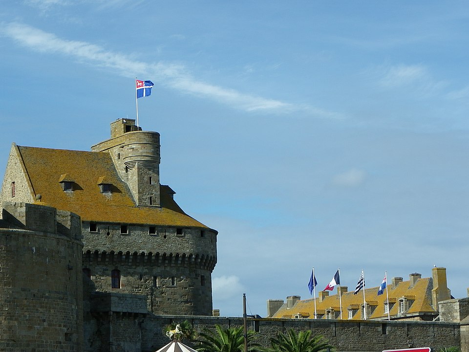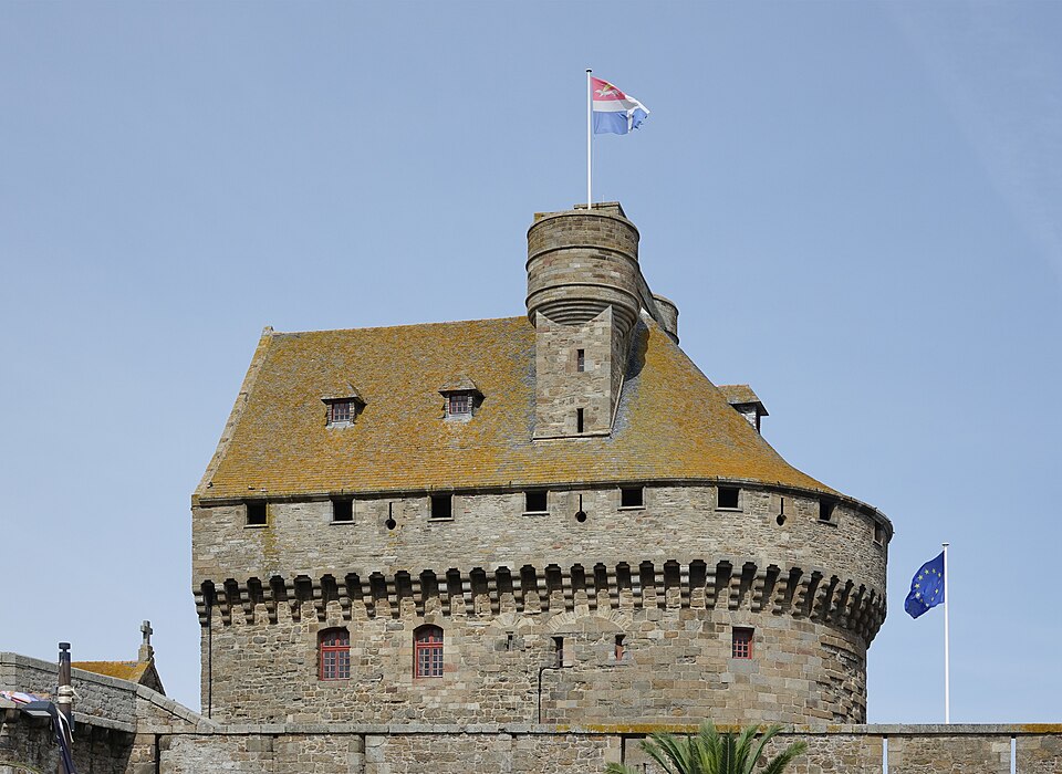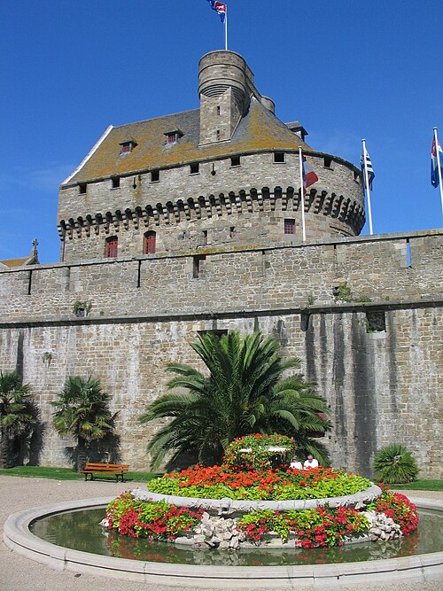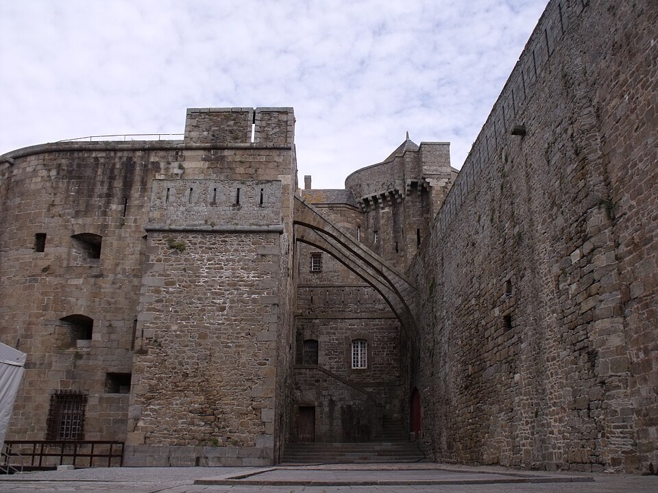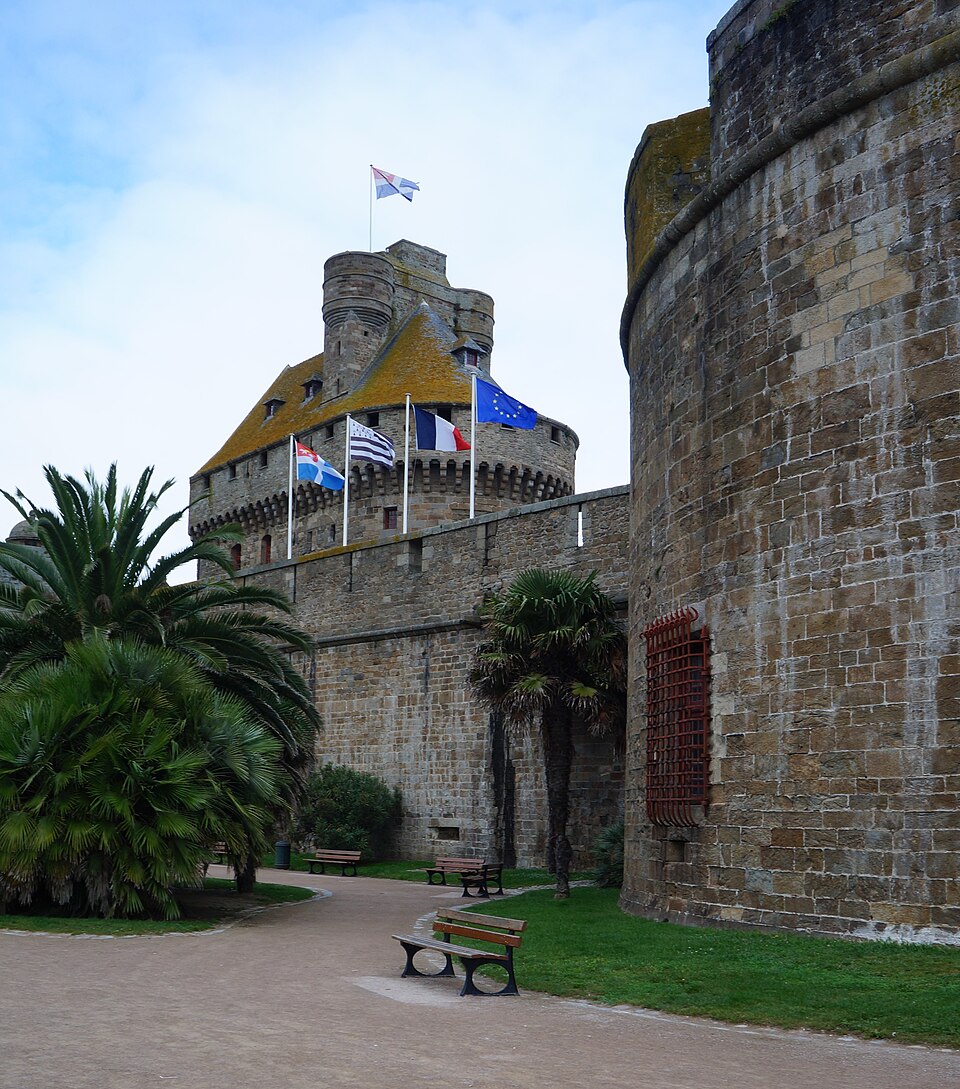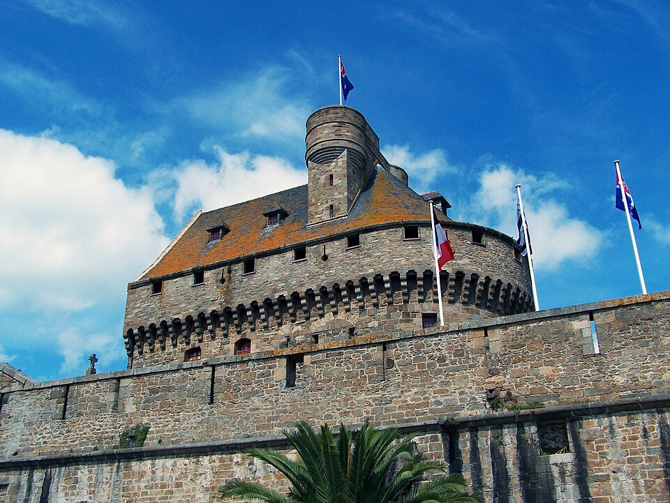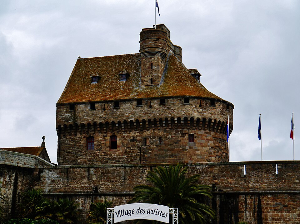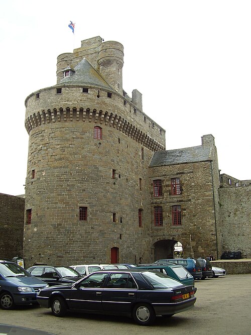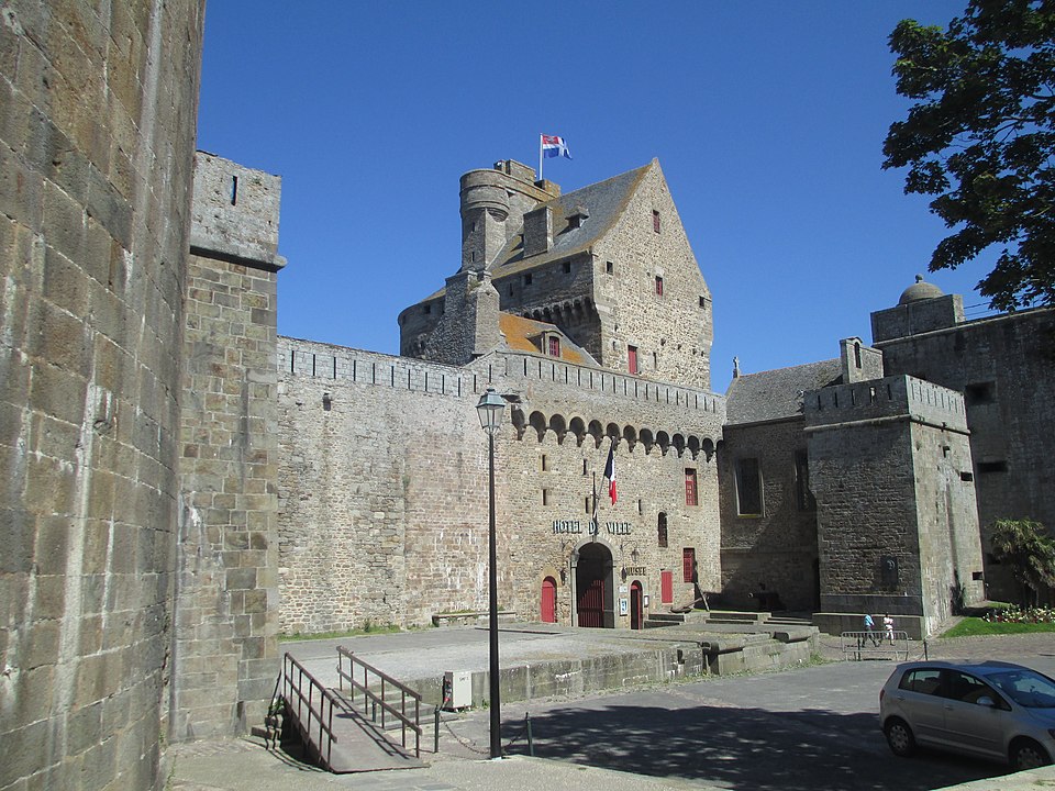 Le château de Saint‑Malo, édifié entre le XVe et le XVIIIe siècle à l'est de la ville close, a été construit par les ducs de Bretagne pour asseoir leur autorité sur la cité. Il fait l'objet d'un classement au titre des monuments historiques depuis juillet 1886. Les remparts, reconstruits aux XIVe et XVe siècles, furent complétés par plusieurs ouvrages des ducs : un petit donjon en 1395, le grand donjon en 1424, la tour Générale en 1475 et la tour Qui-qu'en-grogne en 1498. Le Grand Donjon, élevé par Jean V sur l'isthme qui reliait la ville au continent, présente un plan en fer à cheval et se détache des remparts, avec un grand pignon tourné vers la ville, un haut toit recouvrant partiellement un chemin de ronde crénelé et deux tourelles de guet. Aux XVIe et XVIIe siècles, le château fut intégré à la défense urbaine et complété par la construction des tours des Dames et des Moulins, puis par le bastion de la Galère en forme de proue. À la fin du XVIIe siècle, sous Louis XIV, les quatre tours furent arasées et dotées de plates‑formes pour l'artillerie; une chapelle fut élevée en 1696 et des casernements en 1698. L'ingénieur Siméon Garangeau reconsidéra l'étendue des remparts au début du XVIIIe siècle dans le cadre d'un vaste programme d'agrandissement qui incorpora aussi des ouvrages bastionnés du XVIIe siècle, tels que le cavalier des Champs Vauverts, le bastion de la Hollande et le Fort la Reine. Ce plan, lié aux travaux de Vauban et mis en œuvre par Garangeau, fit évoluer la cité fortifiée en quatre opérations successives entre 1708 et 1742, portant les superficies fortifiées de 16 à 24 hectares. Après la Révolution, une garnison du Génie s'installa dans le château et adjoignit des constructions contre les courtines; l'armée occupa l'édifice comme caserne jusqu'en 1921. Les douves et le pont‑levis furent supprimés à la fin du XIXe siècle pour laisser place à un jardin et à une place, et il subsiste peu d'éléments de l'enceinte du XIVe et du château primitif : la courtine ouest et une portion d'enceinte entre la tour Bidouane et le bastion de la Hollande, dite « les petits murs ». Le château connut plusieurs épisodes significatifs : perdu au profit du roi en 1395 puis restitué à Jean V en 1415, pris d'assaut par les habitants en 1590 pour empêcher une reddition, à nouveau soulevé en 1792, et utilisé en 1765 pour l'internement du procureur général La Chalotais. La cour intérieure est bordée au nord et à l'est par des casernes du début du XVIIIe siècle, aujourd'hui réaménagées pour des services municipaux. Dans l'aile est, le cabinet du maire conserve des boiseries sculptées de la fin du XVIIe siècle issues d'un hôtel d'armateur détruit en 1944. La cour dite de la Galère tient son nom du bastion triangulaire en forme de proue, ajouté au XVIe siècle et renforcé par Vauban. La tour Générale et le Grand Donjon abritent le musée d'Histoire de la Ville et du Pays Malouin. Le château fut fortement endommagé lors de la libération de Saint‑Malo en 1944 et a été restauré par la suite.