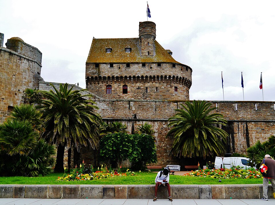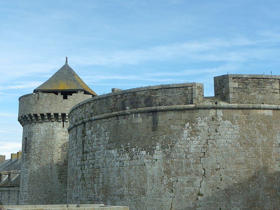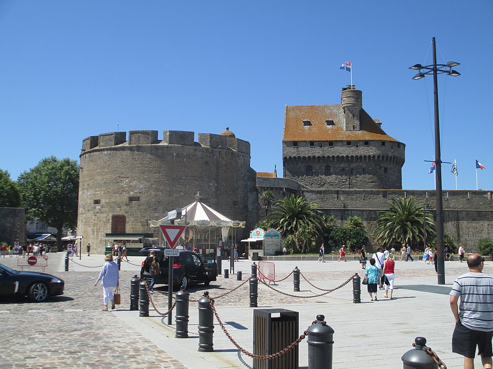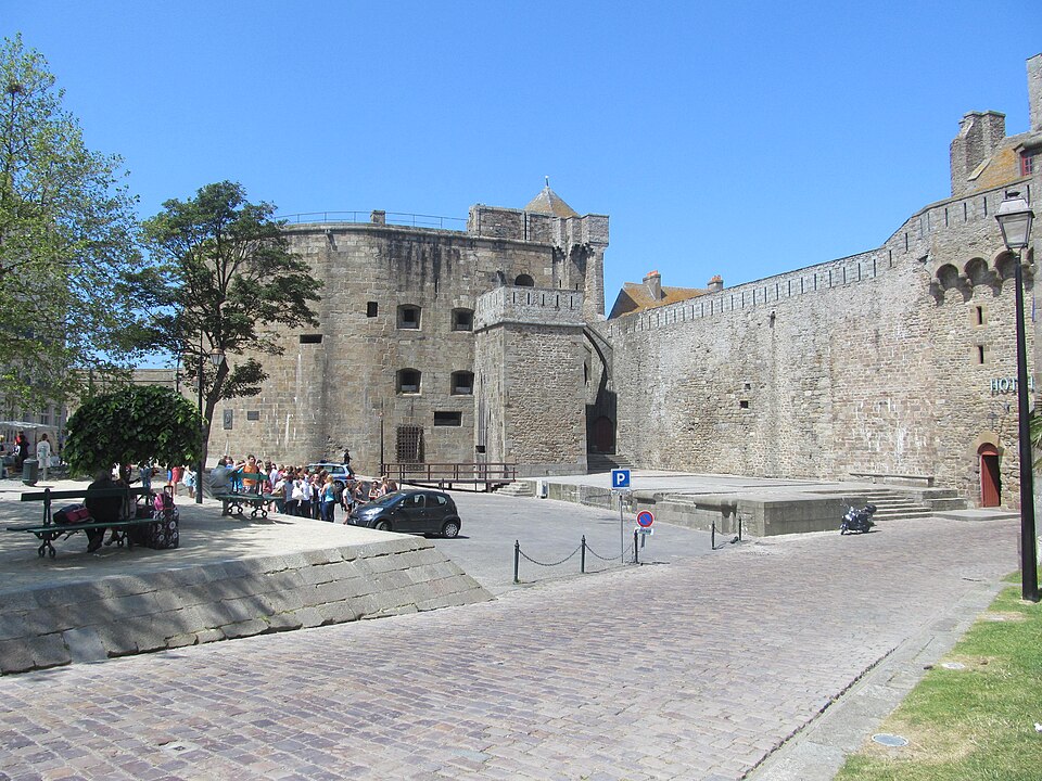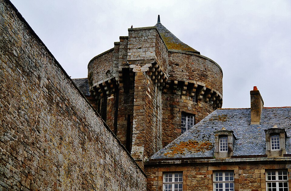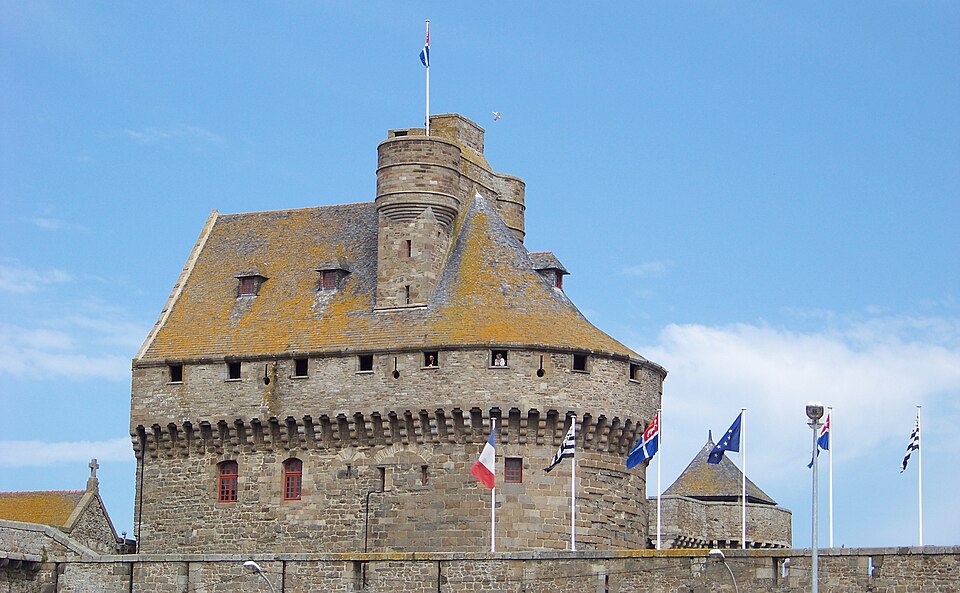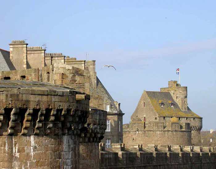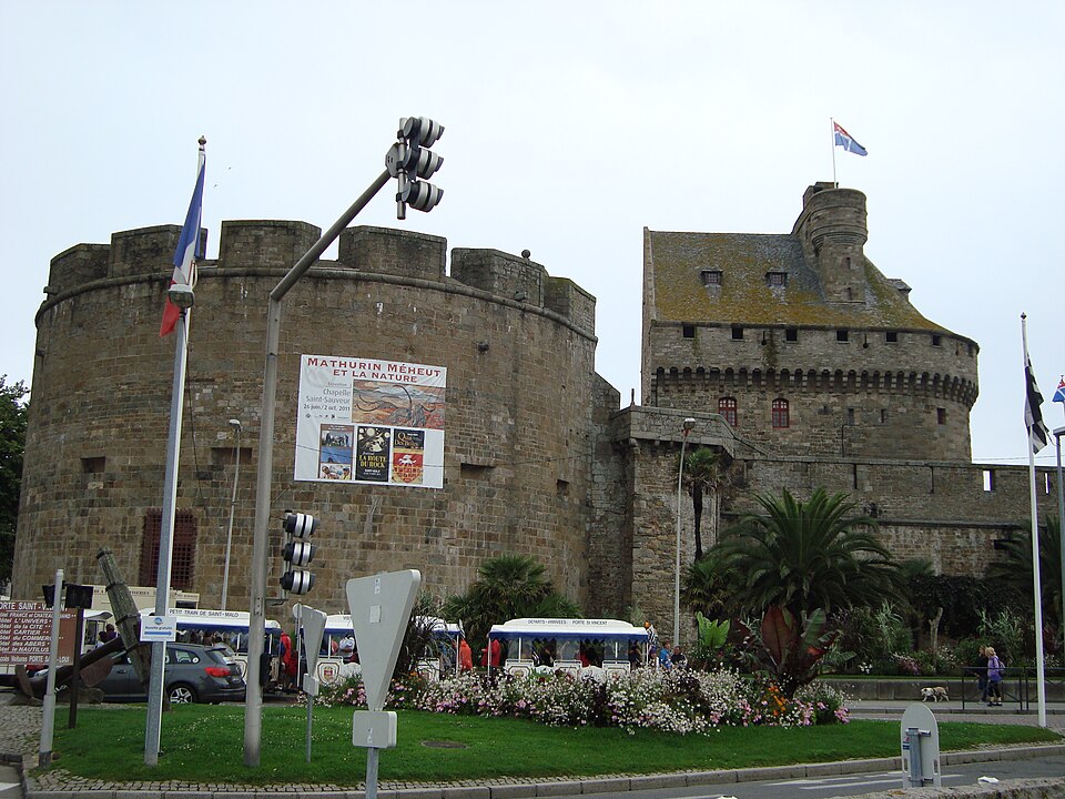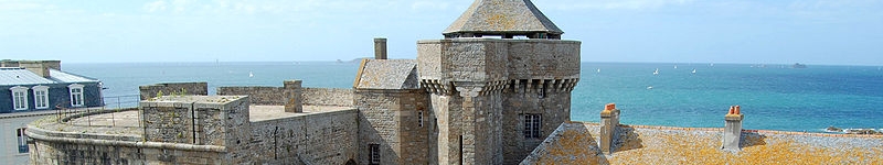 Le château de Saint‑Malo, édifié entre le XVe et le XVIIIe siècle à l'est de la ville close, a été construit par les ducs de Bretagne pour asseoir leur autorité sur la cité. Il fait l'objet d'un classement au titre des monuments historiques depuis juillet 1886. Les remparts, reconstruits aux XIVe et XVe siècles, furent complétés par plusieurs ouvrages des ducs : un petit donjon en 1395, le grand donjon en 1424, la tour Générale en 1475 et la tour Qui-qu'en-grogne en 1498. Le Grand Donjon, élevé par Jean V sur l'isthme qui reliait la ville au continent, présente un plan en fer à cheval et se détache des remparts, avec un grand pignon tourné vers la ville, un haut toit recouvrant partiellement un chemin de ronde crénelé et deux tourelles de guet. Aux XVIe et XVIIe siècles, le château fut intégré à la défense urbaine et complété par la construction des tours des Dames et des Moulins, puis par le bastion de la Galère en forme de proue. À la fin du XVIIe siècle, sous Louis XIV, les quatre tours furent arasées et dotées de plates‑formes pour l'artillerie; une chapelle fut élevée en 1696 et des casernements en 1698. L'ingénieur Siméon Garangeau reconsidéra l'étendue des remparts au début du XVIIIe siècle dans le cadre d'un vaste programme d'agrandissement qui incorpora aussi des ouvrages bastionnés du XVIIe siècle, tels que le cavalier des Champs Vauverts, le bastion de la Hollande et le Fort la Reine. Ce plan, lié aux travaux de Vauban et mis en œuvre par Garangeau, fit évoluer la cité fortifiée en quatre opérations successives entre 1708 et 1742, portant les superficies fortifiées de 16 à 24 hectares. Après la Révolution, une garnison du Génie s'installa dans le château et adjoignit des constructions contre les courtines; l'armée occupa l'édifice comme caserne jusqu'en 1921. Les douves et le pont‑levis furent supprimés à la fin du XIXe siècle pour laisser place à un jardin et à une place, et il subsiste peu d'éléments de l'enceinte du XIVe et du château primitif : la courtine ouest et une portion d'enceinte entre la tour Bidouane et le bastion de la Hollande, dite « les petits murs ». Le château connut plusieurs épisodes significatifs : perdu au profit du roi en 1395 puis restitué à Jean V en 1415, pris d'assaut par les habitants en 1590 pour empêcher une reddition, à nouveau soulevé en 1792, et utilisé en 1765 pour l'internement du procureur général La Chalotais. La cour intérieure est bordée au nord et à l'est par des casernes du début du XVIIIe siècle, aujourd'hui réaménagées pour des services municipaux. Dans l'aile est, le cabinet du maire conserve des boiseries sculptées de la fin du XVIIe siècle issues d'un hôtel d'armateur détruit en 1944. La cour dite de la Galère tient son nom du bastion triangulaire en forme de proue, ajouté au XVIe siècle et renforcé par Vauban. La tour Générale et le Grand Donjon abritent le musée d'Histoire de la Ville et du Pays Malouin. Le château fut fortement endommagé lors de la libération de Saint‑Malo en 1944 et a été restauré par la suite.