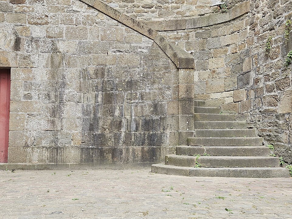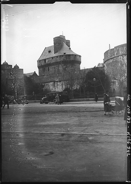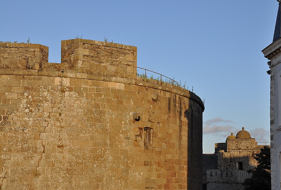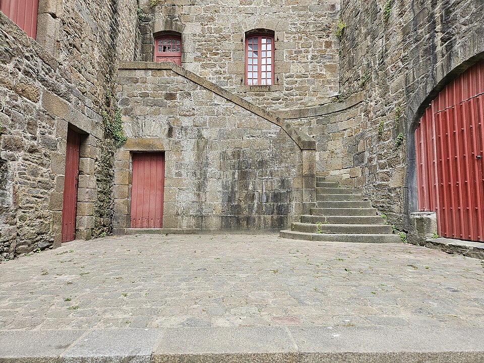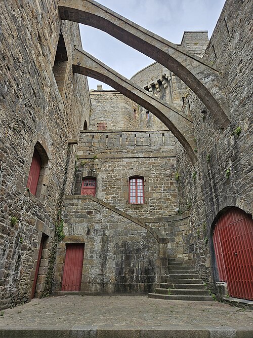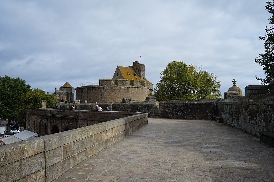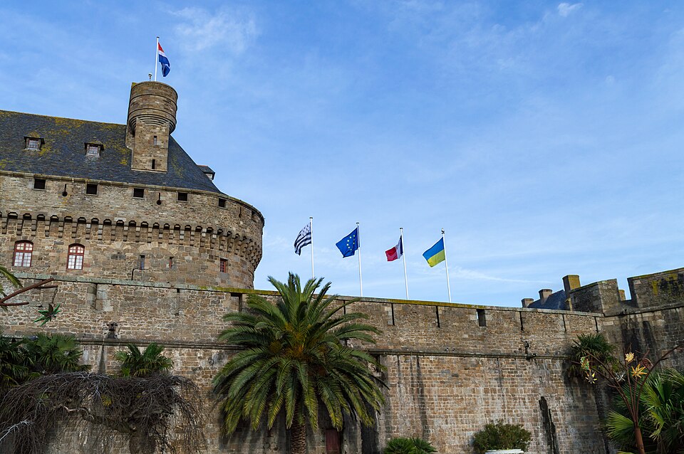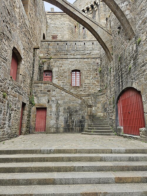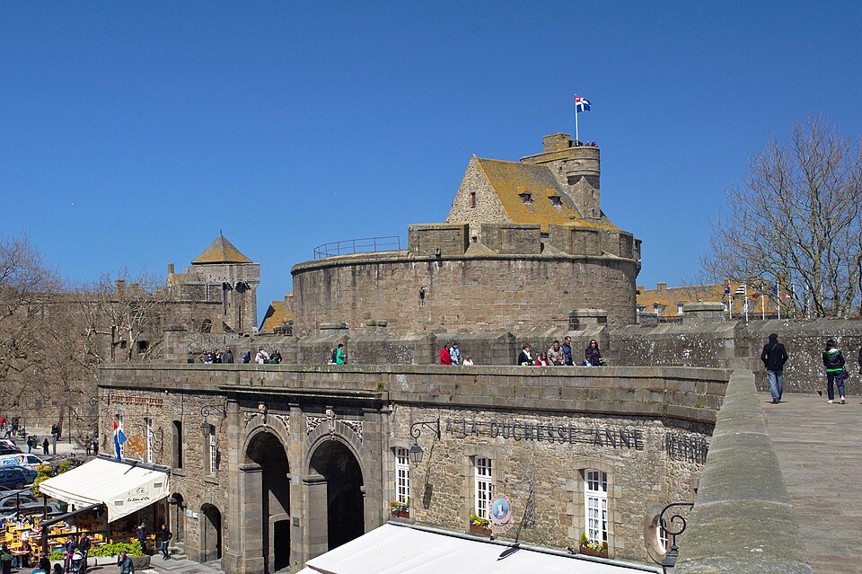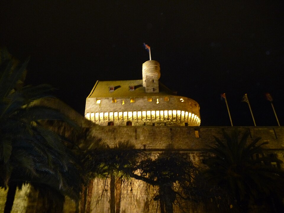 Le château de Saint‑Malo, édifié entre le XVe et le XVIIIe siècle à l'est de la ville close, a été construit par les ducs de Bretagne pour asseoir leur autorité sur la cité. Il fait l'objet d'un classement au titre des monuments historiques depuis juillet 1886. Les remparts, reconstruits aux XIVe et XVe siècles, furent complétés par plusieurs ouvrages des ducs : un petit donjon en 1395, le grand donjon en 1424, la tour Générale en 1475 et la tour Qui-qu'en-grogne en 1498. Le Grand Donjon, élevé par Jean V sur l'isthme qui reliait la ville au continent, présente un plan en fer à cheval et se détache des remparts, avec un grand pignon tourné vers la ville, un haut toit recouvrant partiellement un chemin de ronde crénelé et deux tourelles de guet. Aux XVIe et XVIIe siècles, le château fut intégré à la défense urbaine et complété par la construction des tours des Dames et des Moulins, puis par le bastion de la Galère en forme de proue. À la fin du XVIIe siècle, sous Louis XIV, les quatre tours furent arasées et dotées de plates‑formes pour l'artillerie; une chapelle fut élevée en 1696 et des casernements en 1698. L'ingénieur Siméon Garangeau reconsidéra l'étendue des remparts au début du XVIIIe siècle dans le cadre d'un vaste programme d'agrandissement qui incorpora aussi des ouvrages bastionnés du XVIIe siècle, tels que le cavalier des Champs Vauverts, le bastion de la Hollande et le Fort la Reine. Ce plan, lié aux travaux de Vauban et mis en œuvre par Garangeau, fit évoluer la cité fortifiée en quatre opérations successives entre 1708 et 1742, portant les superficies fortifiées de 16 à 24 hectares. Après la Révolution, une garnison du Génie s'installa dans le château et adjoignit des constructions contre les courtines; l'armée occupa l'édifice comme caserne jusqu'en 1921. Les douves et le pont‑levis furent supprimés à la fin du XIXe siècle pour laisser place à un jardin et à une place, et il subsiste peu d'éléments de l'enceinte du XIVe et du château primitif : la courtine ouest et une portion d'enceinte entre la tour Bidouane et le bastion de la Hollande, dite « les petits murs ». Le château connut plusieurs épisodes significatifs : perdu au profit du roi en 1395 puis restitué à Jean V en 1415, pris d'assaut par les habitants en 1590 pour empêcher une reddition, à nouveau soulevé en 1792, et utilisé en 1765 pour l'internement du procureur général La Chalotais. La cour intérieure est bordée au nord et à l'est par des casernes du début du XVIIIe siècle, aujourd'hui réaménagées pour des services municipaux. Dans l'aile est, le cabinet du maire conserve des boiseries sculptées de la fin du XVIIe siècle issues d'un hôtel d'armateur détruit en 1944. La cour dite de la Galère tient son nom du bastion triangulaire en forme de proue, ajouté au XVIe siècle et renforcé par Vauban. La tour Générale et le Grand Donjon abritent le musée d'Histoire de la Ville et du Pays Malouin. Le château fut fortement endommagé lors de la libération de Saint‑Malo en 1944 et a été restauré par la suite.