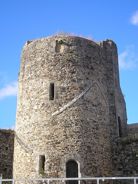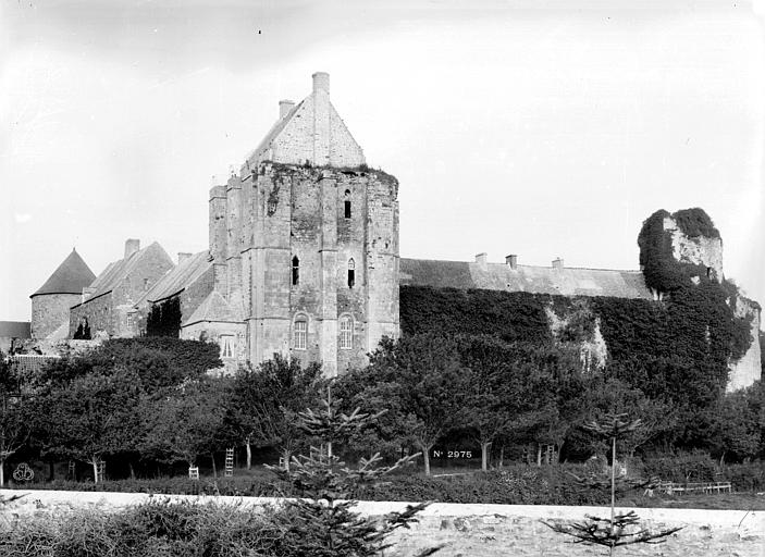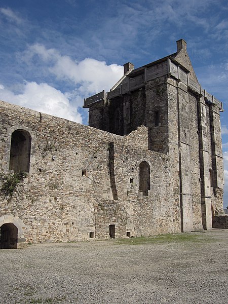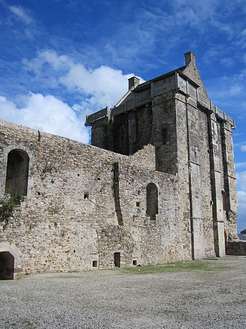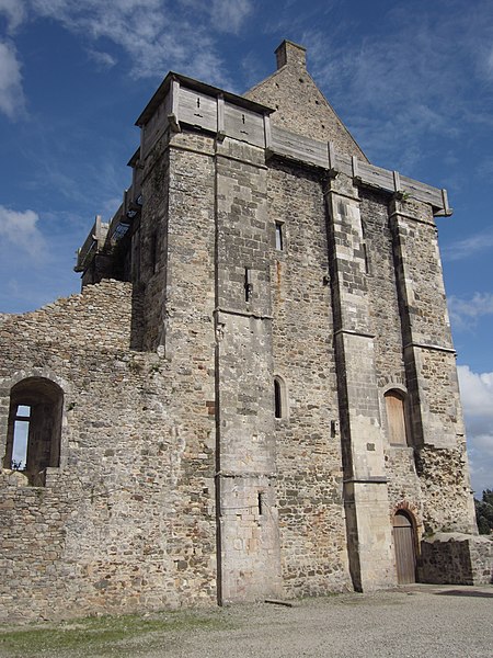 Le donjon, élevé sur la motte et daté des années 1346-1370, domine la vallée de la Douve de 30 mètres ; il s’élève sur 25 mètres, mesure environ 13,50 mètres de côté et présente des murs épais de 1,80 à 2,30 mètres. Il comprend trois niveaux résidentiels et une pièce sous combles, avec une salle voûtée au rez-de-chaussée reposant sur un pilier octogonal, un accès au premier étage par un pont sur la courtine et un escalier à vis desservant les étages supérieurs ; sa terrasse a perdu son parapet et a été couverte d’une petite construction au XVIe siècle. La tour des prisons, au sud‑ouest, a 11 mètres de diamètre ; utilisée comme prison aux XVIIe et XVIIIe siècles, elle porte de nombreux graffitis et dessins — crucifix, potences, menottes — ainsi qu’un cantique de quatre vers encore chanté au grand Pardon de la mer à Granville. La tour de la Batterie, plus ancienne, présente trois étages voûtés en coupole et une gaine de tir ménagée dans l’épaisseur du mur, tandis que la tour Houlande et la tour des Cigognes témoignent de l’influence anglaise dans certains aménagements et ouvertures.
