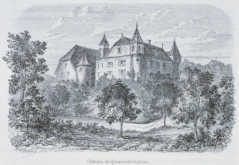 Le château de Scharrachbergheim, situé 7 rue du Château à Scharrachbergheim-Irmstett (Bas-Rhin), est inscrit au titre des monuments historiques depuis 1982. Sa date d'édification précise reste inconnue, mais la plupart des historiens l'attribuent à la fin du XVe siècle, après la destruction de l'ancien château perché sur la colline du Scharrach. Les pierres de taille à bossage rustique, visibles à la base des murs nord et est, semblent confirmer cette attribution. Après 1462, la seigneurie aurait quitté la famille de Scharrach pour passer aux Dettlingen, selon certaines sources. La porte d'entrée de l'aile ouest porte la date 1530, peut‑être en réemploi, et la porte charretière près des communs est gravée de 1527 (et non de 1727, comme il a parfois été écrit). Le château subit d'importants dommages durant la guerre de Trente Ans puis fait l'objet de restaurations notables vers 1673 (une fenêtre porte une date), en 1727 et au milieu du XIXe siècle sous le baron du Hazier. C'est à cette dernière campagne que l'on doit notamment l'escalier en bois daté 1845 et signé Duquemy, ainsi que des portes et chambranles intérieurs réalisés à partir d'armoires du XVIIe siècle. Après 1870, la propriété appartient au peintre strasbourgeois Louis Schutzenberger (1825-1903), qui cloisonne la grande salle du XVIe siècle au premier étage de l'aile est, y aménage son atelier au dernier étage et décore ces pièces de peintures murales. Vers 1885, il cède l'édifice au négociant Frédéric Mewès, époux de sa fille Julie Laure ; leur fils, l'architecte Charles Frédéric Mewès, puis son fils Charles Edouard (1889-1968) en furent ensuite propriétaires et le transmirent aux descendants actuels. Le parc est de création récente et un pont dormant a remplacé l'ancien pont-levis. La tour centrale de la façade postérieure a été édifiée en intégrant divers éléments en pan de bois sculpté, et de nombreux éléments lapidaires ont été disposés dans le parc. Les communs semblent dater du XVIe siècle.
