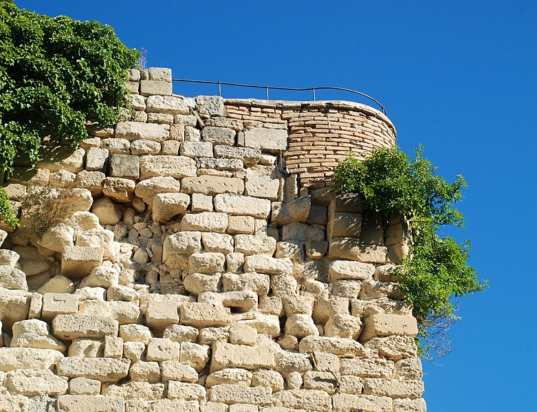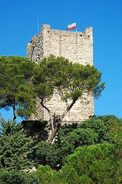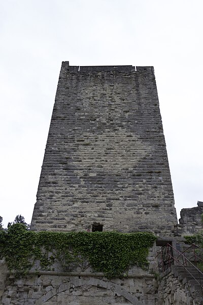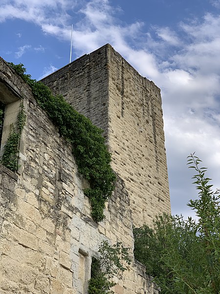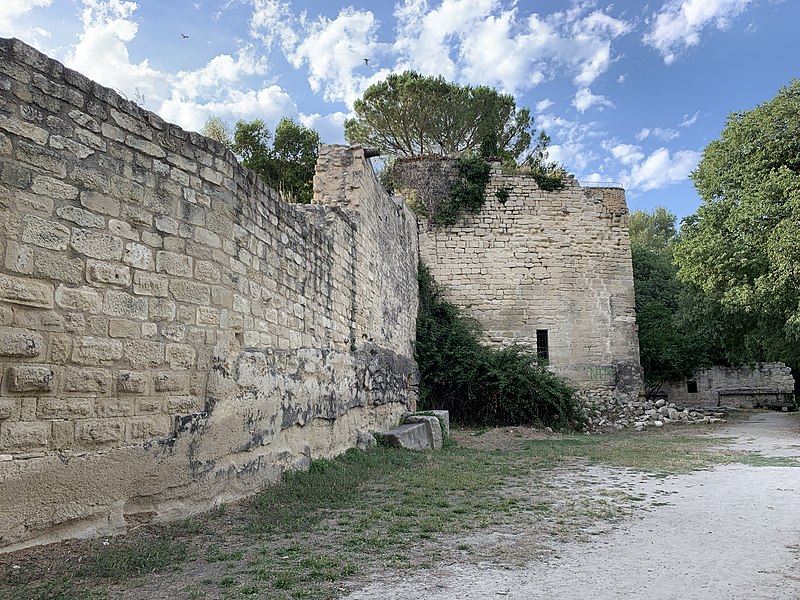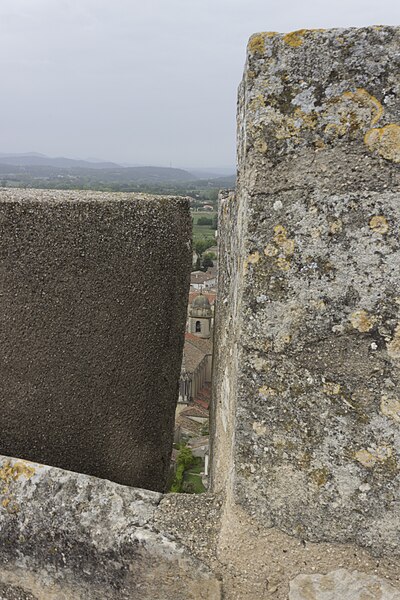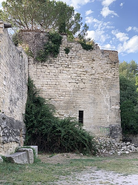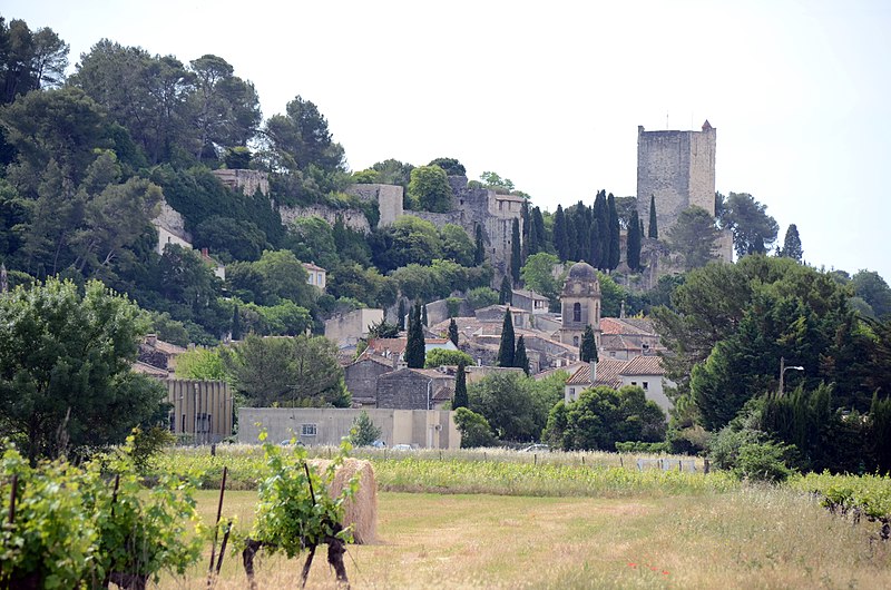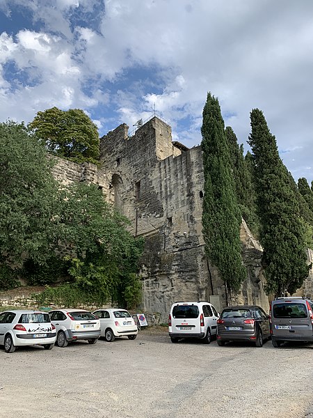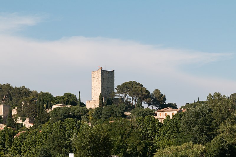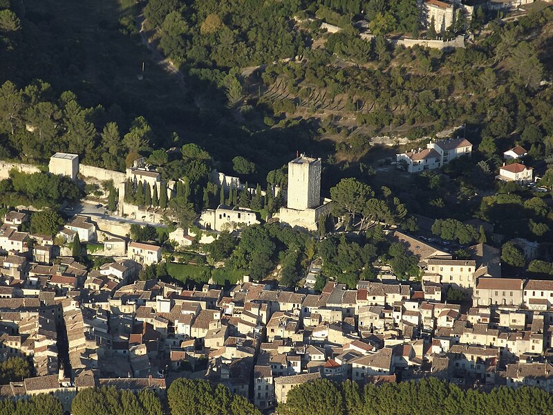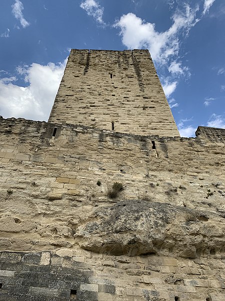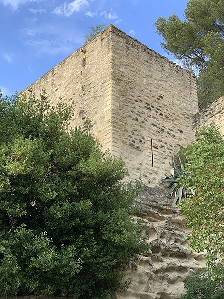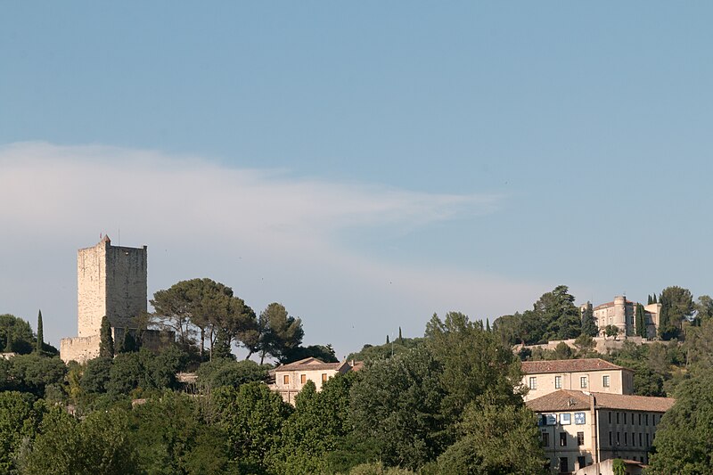 Le château comprend deux tours principales : la tour Bermond, à l’extrémité sud de l’éperon, et la tour de Montlaur, au nord. La tour Bermond, attribuée au début du XIIIe siècle et élevée directement sur le rocher sur près de 25 mètres, constitue le donjon ; elle est construite en pierres de taille à bossage, percée de fines meurtrières surmontées d’arcs monolithes et couronnée de créneaux. Il subsiste d’un système de défense sommitale un corbeau laissant supposer l’existence d’une bretèche et d’un hourd ; l’entrée originelle, située plusieurs mètres au-dessus du sol, était accessible par une échelle. L’intérieur comporte deux niveaux voûtés en berceau brisé, reliés par un étroit escalier à vis, chaque niveau étant éclairé par deux fenêtres hautes à l’est et à l’ouest. La tour est entourée d’une chemise aux murs d’une épaisseur maximale de 1,60 m et munie d’archères ; des corbeaux indiquent qu’elle devait être couverte d’un toit. La tour de Montlaur, datée de la fin du XIIIe siècle, n’existe que par ses soubassements, en partie dissimulés par la végétation dans une propriété privée ; ses parements en bossage à chanfrein large ont été rapprochés des appareillages des règnes de Philippe le Hardi ou de Philippe le Bel. La tour de Montlaur aurait été partiellement anéantie lors du siège de 1573 puis dégradée au XIXe siècle ; au XVIIIe siècle, son rez-de-chaussée servait de prison.