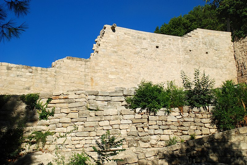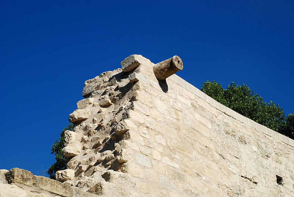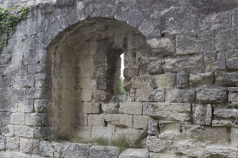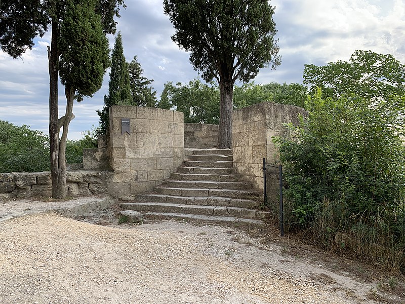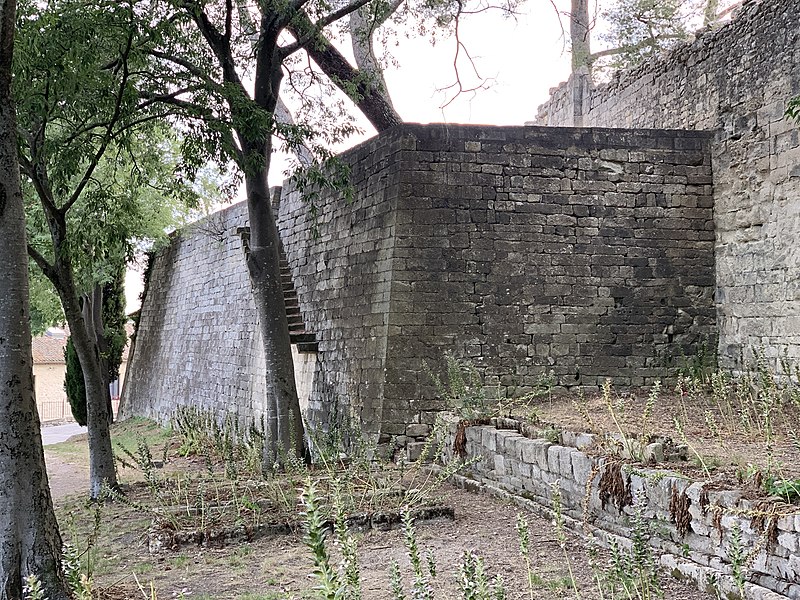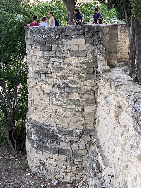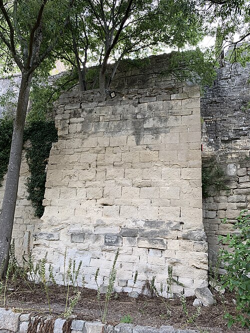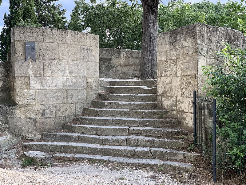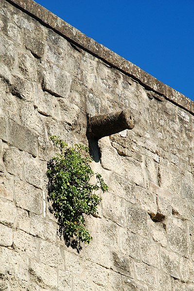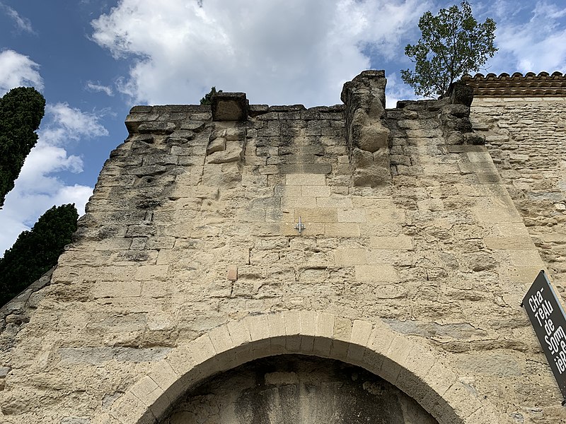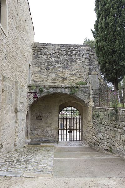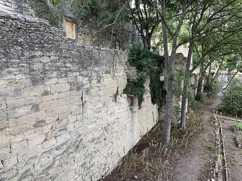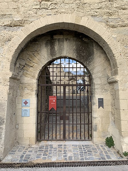 La porte principale, percée dans une tour contemporaine de la chapelle, présente un arc en plein cintre surmonté de mâchicoulis ; le porche est doté d’un assommoir et la herse d’origine a été remplacée par un portail moderne. Le rempart oriental, en mauvais état par endroits et marqué de réparations, porte à certains endroits de simples gargouilles en forme de canon rappelant celles du beffroi de la ville. Le fossé correspond à une dépression naturelle aménagée en creusant la roche, dont la profondeur varie de 2 à 16 mètres ; au pied de la tour de la Bistoure une source naturelle a été aménagée depuis très longtemps.