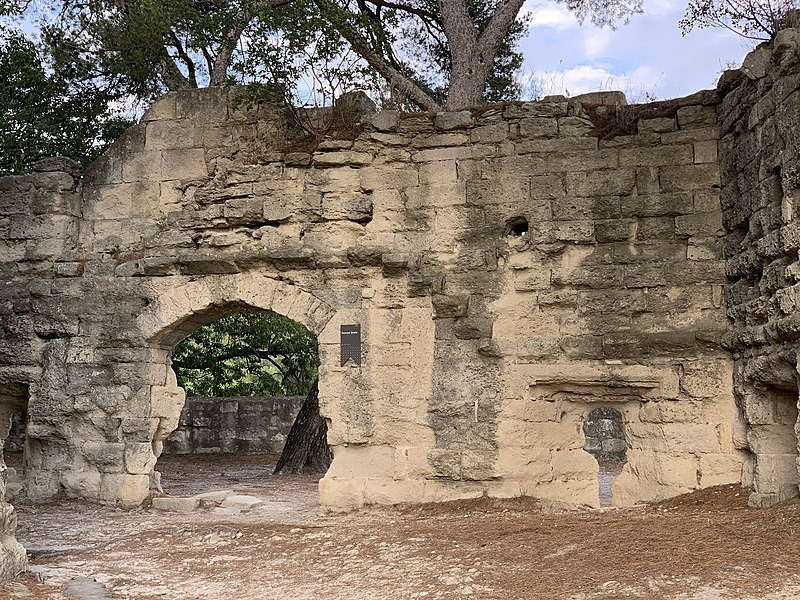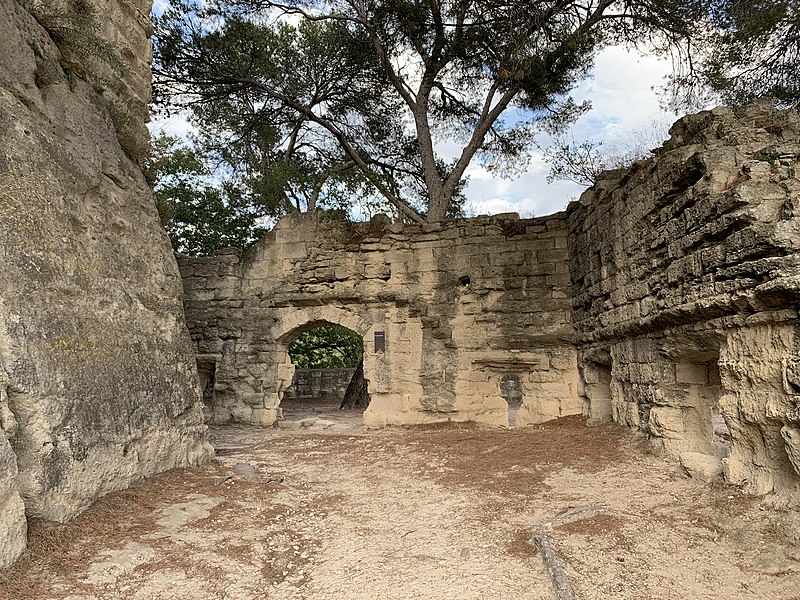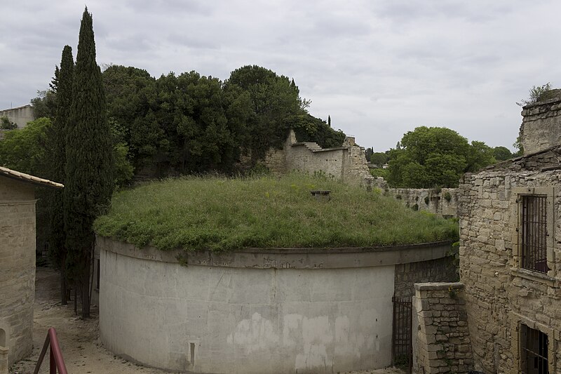 À l’intérieur, les casernes, dont la date précise de construction est inconnue, sont attestées sur des plans antérieurs au XVIIIe siècle ; le « pavillon des invalides » présente une façade plus récente, deux niveaux, des salles voûtées d’arêtes au rez-de-chaussée datées du XVIIIe siècle et une bove — citerne taillée dans le rocher — à l’angle proche de la chemise de la tour Bermond. Le niveau supérieur, desservi autrefois par un escalier aujourd’hui effondré, communiquait par une galerie avec d’autres bâtiments de casernement détruits lors de la construction des réservoirs d’eau ; il subsiste quelques vestiges de cheminées. La salle ogivale, probablement médiévale, est couverte de voûtes sur croisées d’ogives ; son mur sud est aveugle, elle était donc éclairée par le nord et comporte deux cheminées, l’une plus ancienne suggérant un usage initial de chambre, l’autre contemporaine de la construction des casernes. Le logis du garde d’artillerie, figurant sous ce nom sur des plans du Génie, comportait deux niveaux servant de logement aux officiers ; chaque niveau communiquait avec le niveau correspondant de la chapelle par des portes, celle du rez-de-chaussée étant encore visible tandis que les accès de l’étage sont aujourd’hui murés.