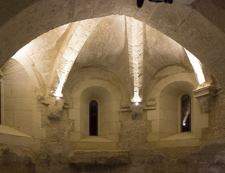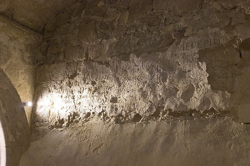 La chapelle castrale, commandée par Louis IX et dédiée au Saint-Sauveur, était à l’origine à un seul niveau : la nef est de style roman et le chœur de style gothique voûté sur croisées d’ogives, voûte qui fut surbaissée au XVIIe siècle lors de la création d’un étage. En 1689 la chapelle fut transférée à l’étage et la partie basse transformée en deux cachots séparés par un mur de refend toujours visible, sans communication entre chœur et abside ; une porte, aménagée à la place de la baie ouest, donnait accès au cachot du chœur. Le mur de refend porte des graffitis laissés par des prisonniers protestants et militaires, dont des bâtons de comptage et la mention du village de Cardet ainsi que de la galère La Hardie, où furent envoyés des camisards à la fin du XVIIe siècle. Au XVIIIe siècle le cachot de la nef fut transformé en salle des gardes avec ouverture d’une porte côté nord (détruite lors des travaux de 2015), l’installation d’une cheminée et d’un escalier ouvrant sur le logis du garde d’artillerie. Au XIXe siècle, les villageois occupants transformèrent le chœur en citerne pavée de carreaux en terre cuite et enduite pour l’étanchéité.