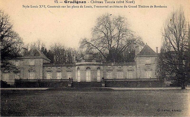 Le château de Tauzia se trouve sur la commune de Gradignan, en Gironde. On y accède par une allée de platanes centenaires, à l'extrémité d'une voie privée située à l'est de la route départementale D1010 (ancienne RN 10) dite de Bayonne, au sud de la commune. La façade sur jardin est dominée, dans sa partie centrale, par une rotonde coiffée d'une coupole à trois gorges surmontée d'une boule ; elle comporte trois portes-fenêtres avec ferronneries et une corniche supportant alternativement des vases de pierre et des balustres. De part et d'autre de la rotonde, trois portes-fenêtres sont surmontées d'une corniche ornée de guirlandes de fleurs et de fruits. Le bâtiment se prolonge par deux pavillons à un étage. Au rez-de-chaussée, une porte-fenêtre est surmontée d'un fronton circulaire dont le tympan représente un panier de fruits et des outils de jardinage, tandis que l'autre présente une nasse en osier accompagnée de filets de pêche et d'un panier de poissons. À chaque extrémité, un corps de bâtiment plus long a été ajouté du côté nord sous le Second Empire. Au bas de l'escalier se trouvent deux lions datés de 1889. Côté parc, l'édifice est élevé de deux marches et s'ouvre par un péristyle soutenu par quatre colonnes à chapiteaux composites. Typique des chartreuses bordelaises, Tauzia présente un corps de bâtiment en rez-de-chaussée interrompu en son centre par la rotonde coiffée d'une coupole et flanqué de deux pavillons à un étage. La salle à manger située dans la rotonde est ornée d'un décor de stuc sobre et raffiné et d'un parquet en mosaïque de bois. En 1768, Jean-Joseph de Castéra, professeur de droit et avocat au parlement de Bordeaux, achète le fief de Tauzia. Vers 1788, il fait construire une chartreuse par le maître-maçon Jean Alary, selon les plans de l'architecte Victor Louis. En 1784, les héritiers vendent la propriété à Jacob Diaz Pereyra, négociant membre de la communauté dite des Juifs portugais, puis le domaine est revendu en l'an XII (1803-1804) au directeur des douanes de Bordeaux. En 1827, la propriété passe à Gustave Petersen, négociant et consul de Suède et de Norvège, qui fait agrandir la demeure pour la transformer en château : il ajoute dans la cour un porche soutenu par deux paires de colonnes à chapiteaux ioniques ainsi que des ailes en retour d'équerre à étage, et dissimule la toiture en ardoise derrière des balustrades. Autour de la demeure, Gustave Petersen fait aménager un parc à l'anglaise d'environ vingt hectares par le paysagiste Louis-Bernard Fischer. Entre 1940 et 1944, le château est occupé par les armées allemandes et italiennes, puis les F.F.I. investissent le site en 1944 ; la famille retrouve une maison fortement endommagée et celle-ci reste inoccupée jusqu'en 1960, date à laquelle Hubert Calvet et son épouse Marie-Amélie entreprennent une restauration pièce par pièce. Le château est classé au titre des monuments historiques par arrêté du 27 juillet 1965.
